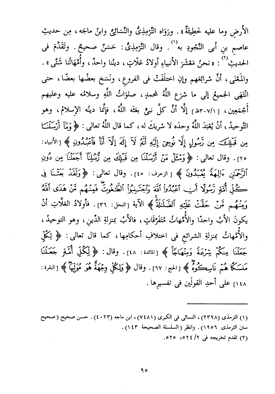 الْأَرْضِ وَمَا عَلَيْهِ خَطِيئَةٌ» وَرَوَاهُ التِّرْمِذِيُّ وَالنَّسَائِيُّ، وَابْنُ مَاجَهْ مِنْ حَدِيثِ عَاصِمِ بْنِ أَبِي النَّجُودِ، وَقَالَ التِّرْمِذِيُّ: حَسَنٌ صَحِيحٌ، وَتَقَدَّمَ فِي الْحَدِيثِ «نَحْنُ مَعْشَرَ الْأَنْبِيَاءِ أَوْلَادُ عَلَّاتٍ، دِينُنَا وَاحِدٌ، وَأُمَّهَاتُنَا شَتَّى» وَالْمَعْنَى أَنَّ شَرَائِعَهُمْ، وَإِنِ اخْتَلَفَتْ فِي الْفُرُوعِ، وَنَسَخَ بَعْضُهَا بَعْضًا حَتَّى انْتَهَى الْجَمِيعُ إِلَى مَا شَرَعَ اللَّهُ لِمُحَمَّدٍ صَلَوَاتُ اللَّهِ وَسَلَامُهُ عَلَيْهِ وَعَلَيْهِمْ أَجْمَعِينَ، إِلَّا أَنَّ كُلَّ نَبِيٍّ بَعَثَهُ اللَّهُ فَإِنَّمَا دِينُهُ الْإِسْلَامُ وَهُوَ التَّوْحِيدُ أَنْ يَعْبُدَ اللَّهَ وَحْدَهُ لَا شَرِيكَ لَهُ، كَمَا قَالَ اللَّهُ تَعَالَى {وَمَا أَرْسَلْنَا مِنْ قَبْلِكَ مِنْ رَسُولٍ إِلَّا نُوحِي إِلَيْهِ أَنَّهُ لَا إِلَهَ إِلَّا أَنَا فَاعْبُدُونِ} [الأنبياء: 25] وَقَالَ تَعَالَى {وَاسْأَلْ مَنْ أَرْسَلْنَا مِنْ قَبْلِكَ مِنْ رُسُلِنَا أَجَعَلْنَا مِنْ دُونِ الرَّحْمَنِ آلِهَةً يُعْبَدُونَ} [الزخرف: 45] وَقَالَ تَعَالَى {وَلَقَدْ بَعَثْنَا فِي كُلِّ أُمَّةٍ رَسُولًا أَنِ اعْبُدُوا اللَّهَ وَاجْتَنِبُوا الطَّاغُوتَ فَمِنْهُمْ مَنْ هَدَى اللَّهُ وَمِنْهُمْ مَنْ حَقَّتْ عَلَيْهِ الضَّلَالَةُ} [النحل: 36] الْآيَةَ [النَّحْلِ: 36] فَأَوْلَادُ الْعَلَّاتِ أَنْ يَكُونَ الْأَبُ وَاحِدًا وَالْأُمَّهَاتُ مُتَفَرِّقَاتٌ فَالْأَبُ بِمَنْزِلَةِ الدِّينِ وَهُوَ التَّوْحِيدُ وَالْأُمَّهَاتُ بِمَنْزِلَةِ الشَّرَائِعِ فِي اخْتِلَافِ أَحْكَامِهَا، كَمَا قَالَ تَعَالَى. وَقَالَ {لِكُلِّ أُمَّةٍ جَعَلْنَا مَنْسَكًا هُمْ نَاسِكُوهُ} [الحج: 67] وَقَالَ {وَلِكُلٍّ وِجْهَةٌ هُوَ مُوَلِّيهَا} [البقرة: 148] عَلَى أَحَدِ الْقَوْلَيْنِ فِي تَفْسِيرِهَا.