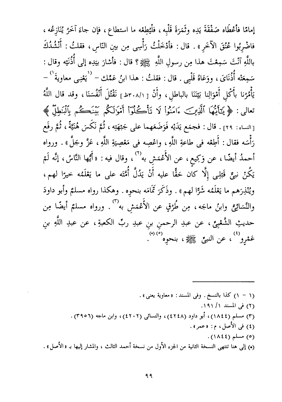 إِمَامًا فَأَعْطَاهُ صَفْقَةَ يَدِهِ، وَثَمَرَةَ قَلْبِهِ فَلْيُطِعْهُ مَا اسْتَطَاعَ. فَإِنْ جَاءَ آخَرُ يُنَازِعُهُ فَاضْرِبُوا عُنُقَ الْآخَرِ. قَالَ فَأَدْخَلْتُ رَأْسِي مِنْ بَيْنِ النَّاسِ فَقُلْتُ: أَنْشُدُكَ بِاللَّهِ أَنْتَ سَمِعْتَ هَذَا مِنْ رَسُولِ اللَّهِ صَلَّى اللَّهُ عَلَيْهِ وَسَلَّمَ؟ قَالَ: فَأَشَارَ بِيَدِهِ إِلَى أُذُنَيْهِ، وَقَالَ: سَمِعَتْهُ أُذُنَايَ، وَوَعَاهُ قَلْبِي قَالَ: فَقُلْتُ هَذَا ابْنُ عَمِّكَ - يَعْنِي مُعَاوِيَةَ - يَأْمُرُنَا بِأَكْلِ أَمْوَالِنَا بَيْنَنَا بِالْبَاطِلِ، وَأَنْ نَقْتُلَ أَنْفُسَنَا وَقَدْ قَالَ اللَّهُ تَعَالَى {يَاأَيُّهَا الَّذِينَ آمَنُوا لَا تَأْكُلُوا أَمْوَالَكُمْ بَيْنَكُمْ بِالْبَاطِلِ} [النساء: 29] قَالَ: فَجَمَعَ يَدَيْهِ فَوَضَعَهُمَا عَلَى جَبْهَتِهِ، ثُمَّ نَكَّسَ هُنَيَّةً ثُمَّ رَفَعَ رَأْسَهُ فَقَالَ: أَطِعْهُ فِي طَاعَةِ اللَّهِ، وَاعْصِهِ فِي مَعْصِيَةِ اللَّهِ عَزَّ وَجَلَّ» . وَرَوَاهُ أَحْمَدُ أَيْضًا عَنْ وَكِيعٍ عَنِ الْأَعْمَشِ بِهِ، وَقَالَ فِيهِ «أَيُّهَا النَّاسُ إِنَّهُ لَمْ يَكُنْ نَبِيٌّ قَبْلِي إِلَّا كَانَ حَقًّا عَلَيْهِ أَنْ يَدُلَّ أُمَّتَهُ عَلَى مَا يَعْلَمُهُ خَيْرًا لَهُمْ، وَيُنْذِرَهُمْ مَا يَعْلَمُهُ شَرًّا لَهُمْ.» وَذَكَرَ تَمَامَهُ بِنَحْوِهِ، وَهَكَذَا رَوَاهُ مُسْلِمٌ وَأَبُو دَاوُدَ وَالنَّسَائِيُّ وَابْنُ مَاجَهْ مِنْ طُرُقٍ عَنِ الْأَعْمَشِ بِهِ، وَرَوَاهُ مُسْلِمٌ أَيْضًا مِنْ حَدِيثِ الشَّعْبِيِّ عَنْ عَبْدِ الرَّحْمَنِ بْنِ عَبْدِ رَبِّ الْكَعْبَةِ عَنْ عَبْدِ اللَّهِ بْنِ عَمْرٍو عَنِ النَّبِيِّ صَلَّى اللَّهُ عَلَيْهِ وَسَلَّمَ بِنَحْوِهِ.