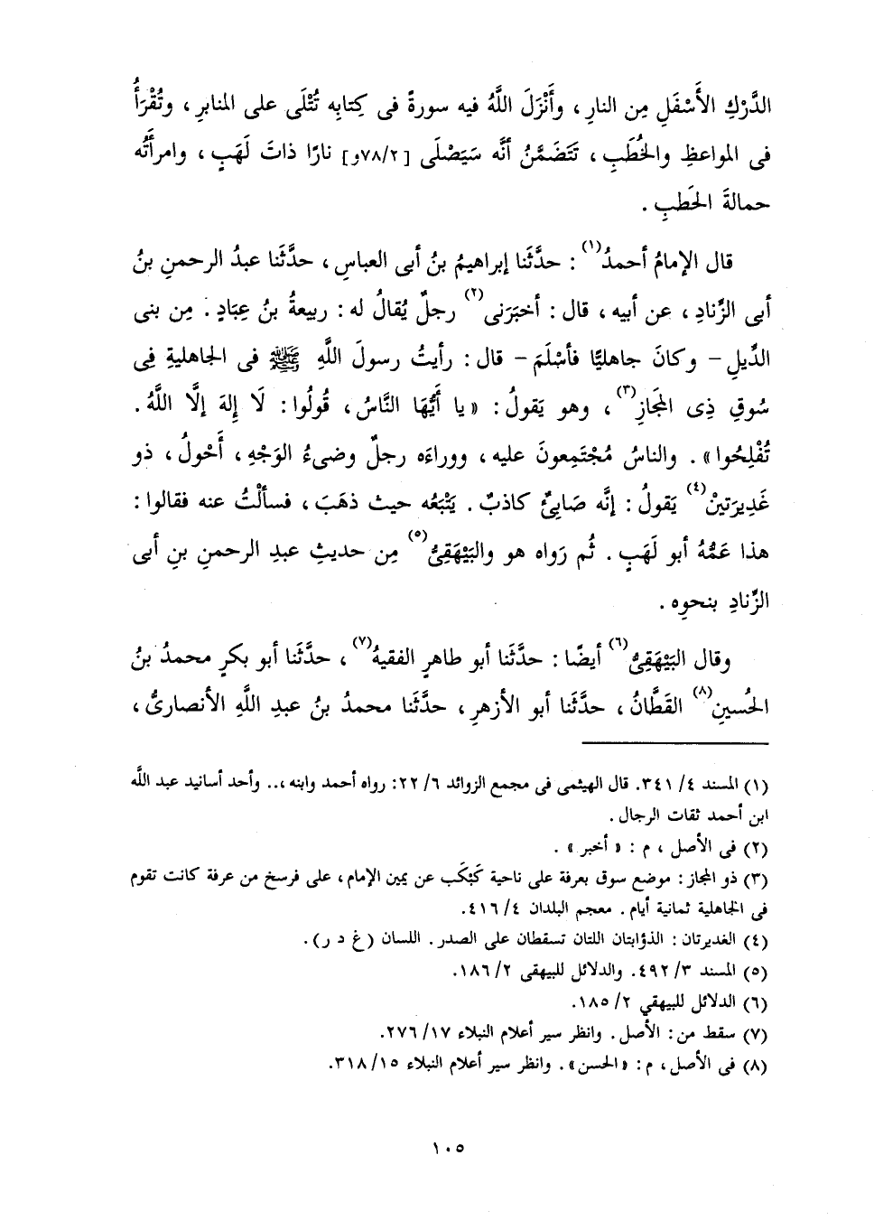 قَالَ الْإِمَامُ أَحْمَدُ: حَدَّثَنَا إِبْرَاهِيمُ بْنُ أَبِي الْعَبَّاسِ حَدَّثَنَا عَبْدُ الرَّحْمَنِ بْنُ أَبِي الزِّنَادِ عَنْ أَبِيهِ، قَالَ: أَخْبَرَنِي رَجُلٌ، يُقَالُ لَهُ: رَبِيعَةُ بْنُ عَبَّادٍ مِنْ بَنِي الدِّيلِ، وَكَانَ جَاهِلِيًّا فَأَسْلَمَ، قَالَ: «رَأَيْتُ رَسُولَ اللَّهِ - صَلَّى اللَّهُ عَلَيْهِ وَسَلَّمَ - فِي الْجَاهِلِيَّةِ، فِي سُوقِ ذِي الْمَجَازِ، وَهُوَ يَقُولُ: " يَا أَيُّهَا النَّاسُ، قُولُوا: لَا إِلَهَ إِلَّا اللَّهُ تُفْلِحُوا ". وَالنَّاسُ مُجْتَمِعُونَ عَلَيْهِ، وَوَرَاءَهُ رَجُلٌ وَضِيءُ الْوَجْهِ، أَحْوَلُ، ذُو غَدِيرَتَيْنِ، يَقُولُ: إِنَّهُ صَابِئٌ كَاذِبٌ. يَتْبَعُهُ حَيْثُ ذَهَبَ، فَسَأَلْتُ عَنْهُ، فَقَالُوا: هَذَا عَمُّهُ أَبُو لَهَبٍ.» ثُمَّ رَوَاهُ هُوَ وَالْبَيْهَقِيُّ مِنْ حَدِيثِ عَبْدِ الرَّحْمَنِ بْنِ أَبِي الزِّنَادِ بِنَحْوِهِ.