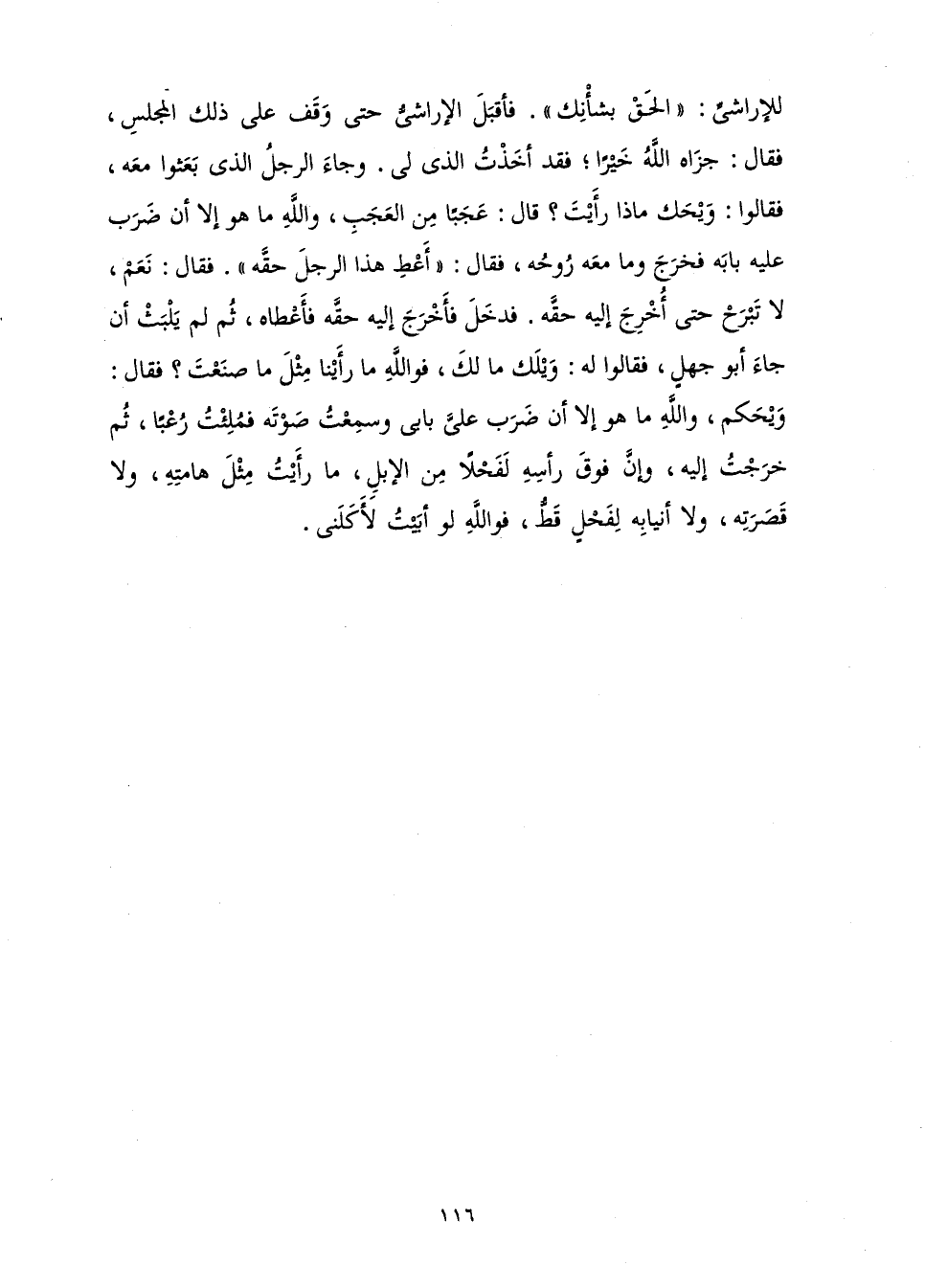 لِلْإِرَاشِيِّ: " الْحَقْ بِشَأْنِكَ ". فَأَقْبَلَ الْإِرَاشِيُّ حَتَّى وَقَفَ عَلَى ذَلِكَ الْمَجْلِسِ، فَقَالَ: جَزَاهُ اللَّهُ خَيْرًا ; فَقَدْ أَخَذْتُ الَّذِي لِي. وَجَاءَ الرَّجُلُ الَّذِي بَعَثُوا مَعَهُ، فَقَالُوا: وَيْحَكَ، مَاذَا رَأَيْتَ؟ قَالَ: عَجَبًا مِنَ الْعَجَبِ، وَاللَّهِ مَا هُوَ إِلَّا أَنْ ضَرَبَ عَلَيْهِ بَابَهُ، فَخَرَجَ وَمَا مَعَهُ رُوحُهُ، فَقَالَ: " أَعْطِ هَذَا الرَّجُلَ حَقَّهُ ". فَقَالَ: نَعَمْ، لَا تَبْرَحْ حَتَّى أُخْرِجَ إِلَيْهِ حَقَّهُ، فَدَخَلَ فَأَخْرَجَ إِلَيْهِ حَقَّهُ فَأَعْطَاهُ. ثُمَّ لَمْ يَلْبَثْ أَنْ جَاءَ أَبُو جَهْلٍ فَقَالُوا لَهُ: وَيْلَكَ مَا لَكَ؟ ! فَوَاللَّهِ مَا رَأَيْنَا مِثْلَ مَا صَنَعْتَ؟ فَقَالَ: وَيْحَكُمُ، وَاللَّهِ مَا هُوَ إِلَّا أَنْ ضَرَبَ عَلَيَّ بَابِي، وَسَمِعْتُ صَوْتَهُ، فَمُلِئْتُ رُعْبًا، ثُمَّ خَرَجْتُ إِلَيْهِ، وَإِنَّ فَوْقَ رَأْسِهِ لَفَحْلًا مِنَ الْإِبِلِ، مَا رَأَيْتُ مِثْلَ هَامَتِهِ، وَلَا قَصَرَتِهِ، وَلَا أَنْيَابِهِ لِفَحْلٍ قَطُّ، فَوَاللَّهِ لَوْ أَبَيْتُ لَأَكَلَنِي.»