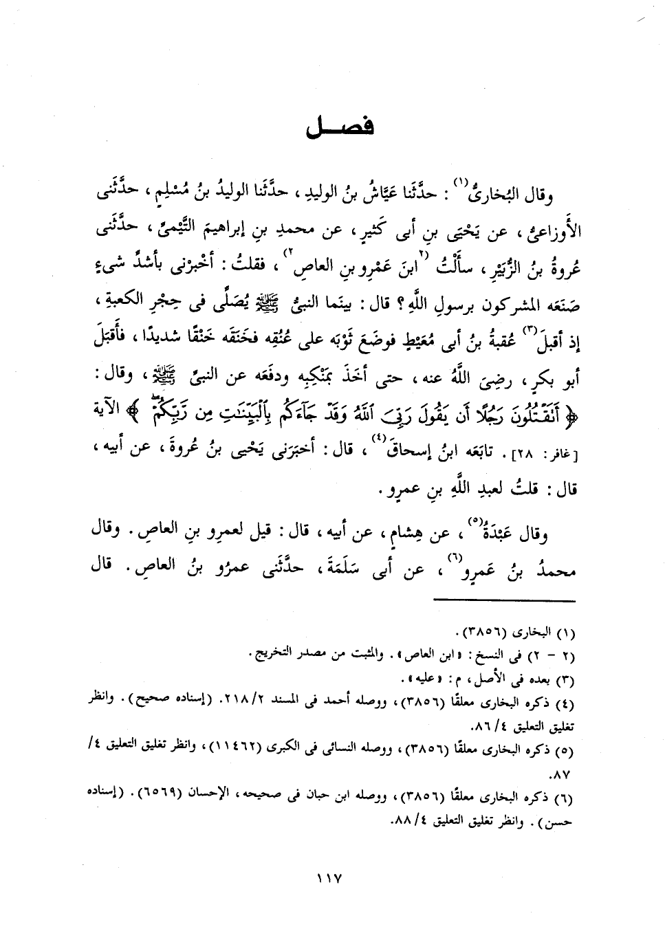 وَقَالَ الْبُخَارِيُّ: حَدَّثَنَا عَيَّاشُ بْنُ الْوَلِيدِ حَدَّثَنَا الْوَلِيدُ بْنُ مُسْلِمٍ حَدَّثَنِي الْأَوْزَاعِيُّ عَنْ يَحْيَى بْنِ أَبِي كَثِيرٍ عَنْ مُحَمَّدِ بْنِ إِبْرَاهِيمَ التَّيْمِيِّ حَدَّثَنِي عُرْوَةُ بْنُ الزُّبَيْرِ سَأَلْتُ ابْنَ عَمْرِو بْنَ الْعَاصِ فَقُلْتُ: أَخْبِرْنِي بِأَشَدِّ شَيْءٍ صَنَعَهُ الْمُشْرِكُونَ بِرَسُولِ اللَّهِ. قَالَ: «بَيْنَمَا النَّبِيُّ - صَلَّى اللَّهُ عَلَيْهِ وَسَلَّمَ - يُصَلِّي فِي حِجْرِ الْكَعْبَةِ، إِذْ أَقْبَلَ عُقْبَةُ بْنُ أَبِي مُعَيْطٍ فَوَضَعَ ثَوْبَهُ عَلَى عُنُقِهِ، فَخَنَقَهُ خَنْقًا شَدِيدًا، فَأَقْبَلَ أَبُو بَكْرٍ رَضِيَ اللَّهُ عَنْهُ حَتَّى أَخَذَ بِمَنْكِبِهِ وَدَفَعَهُ عَنِ النَّبِيِّ - صَلَّى اللَّهُ عَلَيْهِ وَسَلَّمَ - وَقَالَ: {أَتَقْتُلُونَ رَجُلًا أَنْ يَقُولَ رَبِّي اللَّهُ وَقَدْ جَاءَكُمْ بِالْبَيِّنَاتِ مِنْ رَبِّكُمْ} [غافر: 28] » الْآيَةَ تَابَعَهُ ابْنُ إِسْحَاقَ قَالَ: أَخْبَرَنِي يَحْيَى بْنُ عُرْوَةَ عَنْ أَبِيهِ، قَالَ: قُلْتُ لِعَبْدِ اللَّهِ بْنِ عَمْرٍو.