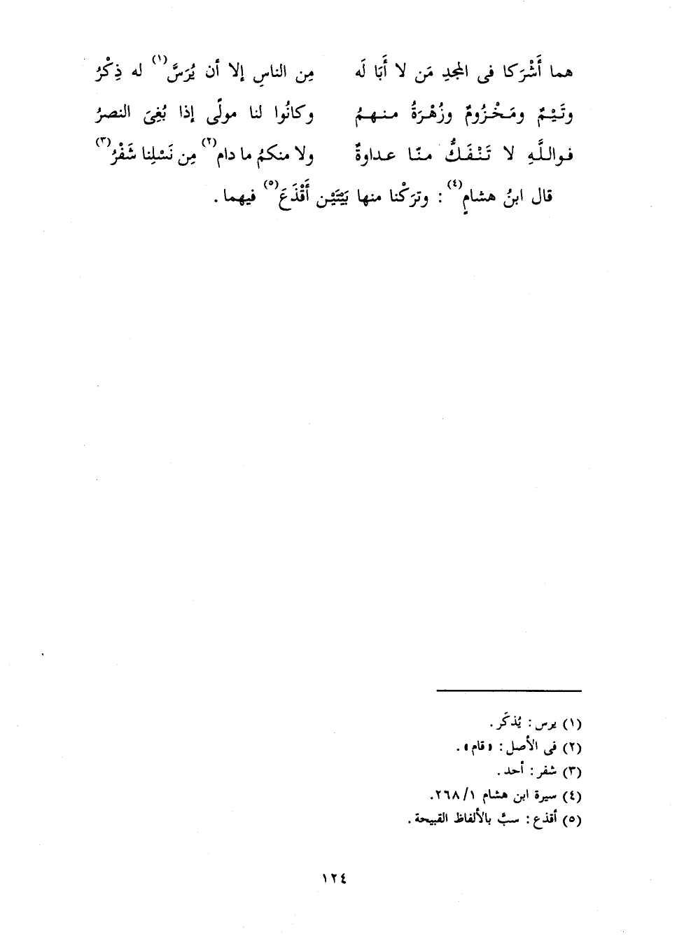 قَالَ ابْنُ هِشَامٍ وَتَرَكْنَا مِنْهَا بَيْتَيْنِ أَقْذَعَ فِيهِمَا.