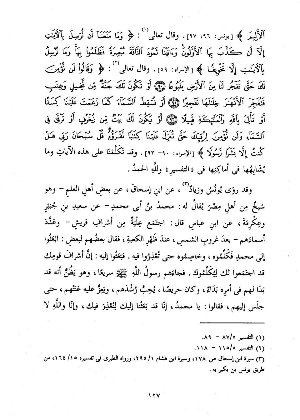 وَقَدْ رَوَى يُونُسُ وَزِيَادٌ عَنِ ابْنِ إِسْحَاقَ عَنْ بَعْضِ أَهْلِ الْعِلْمِ وَهُوَ شَيْخٌ مَنْ أَهْلِ مِصْرَ يُقَالُ لَهُ: مُحَمَّدُ بْنُ أَبِي مُحَمَّدٍ عَنْ سَعِيدِ بْنِ جُبَيْرٍ وَعِكْرِمَةَ عَنِ ابْنِ عَبَّاسٍ قَالَ: «اجْتَمَعَ عِلْيَةٌ مِنْ أَشْرَافِ قُرَيْشٍ وَعَدَّدَ أَسْمَاءَهُمْ بَعْدَ غُرُوبِ الشَّمْسِ عِنْدَ ظَهْرِ الْكَعْبَةِ، فَقَالَ بَعْضُهُمْ لِبَعْضٍ: ابْعَثُوا إِلَى مُحَمَّدٍ فَكَلِّمُوهُ وَخَاصِمُوهُ حَتَّى تُعْذِرُوا فِيهِ. فَبَعَثُوا إِلَيْهِ إِنَّ أَشْرَافَ قَوْمِكَ قَدِ اجْتَمَعُوا لَكَ لِيُكَلِّمُوكَ. فَجَاءَهُمْ رَسُولُ اللَّهِ - صَلَّى اللَّهُ عَلَيْهِ وَسَلَّمَ - سَرِيعًا، وَهُوَ يَظُنُّ أَنَّهُ قَدْ بَدَا لَهُمْ فِي أَمْرِهِ بَدَاءٌ، وَكَانَ حَرِيصًا يُحِبُّ رُشْدَهُمْ، وَيَعِزُّ عَلَيْهِ عَنَتُهُمْ، حَتَّى جَلَسَ إِلَيْهِمْ، فَقَالُوا: يَا مُحَمَّدُ، إِنَّا قَدْ بَعَثْنَا إِلَيْكَ لِنُعْذِرَ فِيكَ، وَإِنَّا وَاللَّهِ لَا