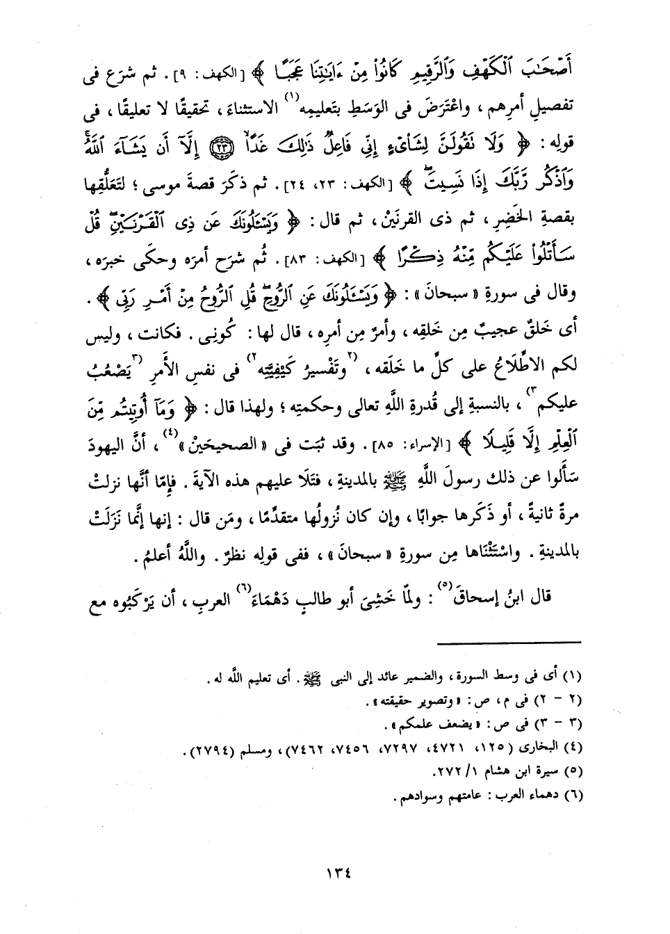 وَنَزَلَ قَوْلُهُ: {أَمْ حَسِبْتَ أَنَّ أَصْحَابَ الْكَهْفِ وَالرَّقِيمِ كَانُوا مِنْ آيَاتِنَا عَجَبًا} [الكهف: 9] . ثُمَّ شَرَعَ فِي تَفْصِيلِ أَمْرِهِمْ، وَاعْتَرَضَ فِي الْوَسَطِ بِتَعْلِيمِهِ الِاسْتِثْنَاءَ، تَحْقِيقًا لَا تَعْلِيقًا، فِي قَوْلِهِ {وَلَا تَقُولَنَّ لِشَيْءٍ إِنِّي فَاعِلٌ ذَلِكَ غَدًا إِلَّا أَنْ يَشَاءَ اللَّهُ وَاذْكُرْ رَبَّكَ إِذَا نَسِيتَ} [الكهف: 23]
