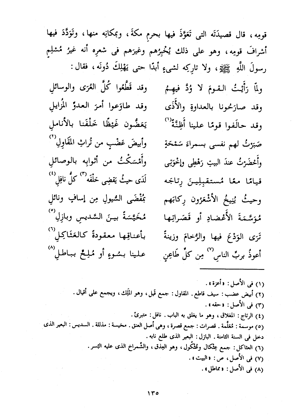 قَوْمِهِ، قَالَ قَصِيدَتَهُ الَّتِي تَعَوَّذَ فِيهَا بِحَرَمِ مَكَّةَ، وَبِمَكَانِهَا مِنْهَا، وَتَوَدَّدَ فِيهَا أَشْرَافَ قَوْمِهِ، وَهُوَ عَلَى ذَلِكَ يُخْبِرُهُمْ وَغَيْرَهُمْ فِي شِعْرِهِ أَنَّهُ غَيْرُ مُسْلِمٍ رَسُولَ اللَّهِ - صَلَّى اللَّهُ عَلَيْهِ وَسَلَّمَ - وَلَا تَارِكُهِ لِشَيْءٍ أَبَدًا حَتَّى يَهْلِكَ دُونَهُ، فَقَالَ: