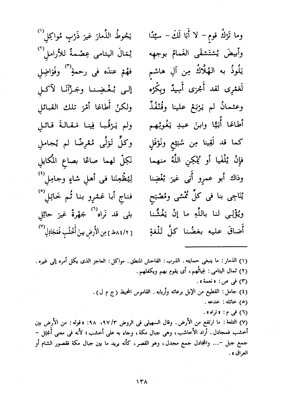 ثِمَالَ الْيَتَامَى عِصْمَةً لِلْأَرَامِلِ ... يَلُوذُ بِهِ الْهُلَّاكُ مِنْ آلِ هَاشِمٍ