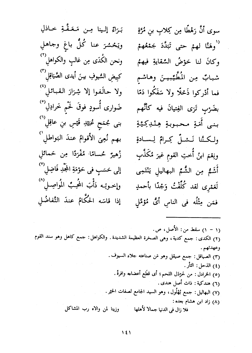 سِوَى أَنَّ رَهْطًا مِنْ كِلَابِ بْنِ مُرَّةَ ... بَرَاءٌ إِلَيْنَا مِنْ مَعَقَّةِ خَاذِلِ