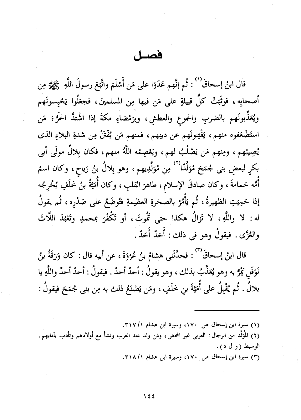 قَالَ ابْنُ إِسْحَاقَ: ثُمَّ إِنَّهُمْ عَدَوْا عَلَى مَنْ أَسْلَمَ وَاتَّبَعَ رَسُولَ اللَّهِ - صَلَّى اللَّهُ عَلَيْهِ وَسَلَّمَ - مِنْ أَصْحَابِهِ، فَوَثَبَتْ كُلُّ قَبِيلَةٍ عَلَى مَنْ فِيهَا مِنَ الْمُسْلِمِينَ، فَجَعَلُوا يَحْبِسُونَهُمْ وَيُعَذِّبُونَهُمْ بِالضَّرْبِ وَالْجُوعِ وَالْعَطَشِ، وَبِرَمْضَاءِ مَكَّةَ إِذَا اشْتَدَّ الْحَرُّ ; مَنِ اسْتَضْعَفُوهُ مِنْهُمْ، يَفْتِنُونَهُمْ عَنْ دِينِهِمْ، فَمِنْهُمْ مَنْ يُفْتَنُ مِنْ شِدَّةِ الْبَلَاءِ الَّذِي يُصِيبُهُمْ، وَمِنْهُمْ مَنْ يَصْلُبُ لَهُمْ، وَيَعْصِمُهُ اللَّهُ مِنْهُمْ، فَكَانَ بِلَالٌ مَوْلَى أَبِي بَكْرٍ لِبَعْضِ بَنِي جُمَحَ مُوَلَّدًا مِنْ مُوَلَّدِيهِمْ، وَهُوَ بِلَالُ بْنُ رَبَاحٍ وَكَانَ اسْمُ أُمِّهِ حَمَامَةَ، وَكَانَ صَادِقَ الْإِسْلَامِ، طَاهِرَ الْقَلْبِ، وَكَانَ أُمَيَّةُ بْنُ خَلَفٍ يُخْرِجُهُ إِذَا حَمِيَتِ الظَّهِيرَةُ، ثُمَّ يَأْمُرُ بِالصَّخْرَةِ الْعَظِيمَةِ فَتُوضَعُ عَلَى صَدْرِهِ، ثُمَّ يَقُولُ لَهُ: لَا وَاللَّهِ لَا تَزَالُ هَكَذَا حَتَّى تَمُوتَ، أَوْ تَكْفُرَ بِمُحَمَّدٍ، وَتَعْبُدَ اللَّاتَ وَالْعُزَّى. فَيَقُولُ وَهُوَ فِي ذَلِكَ: أَحَدٌ أَحَدٌ.