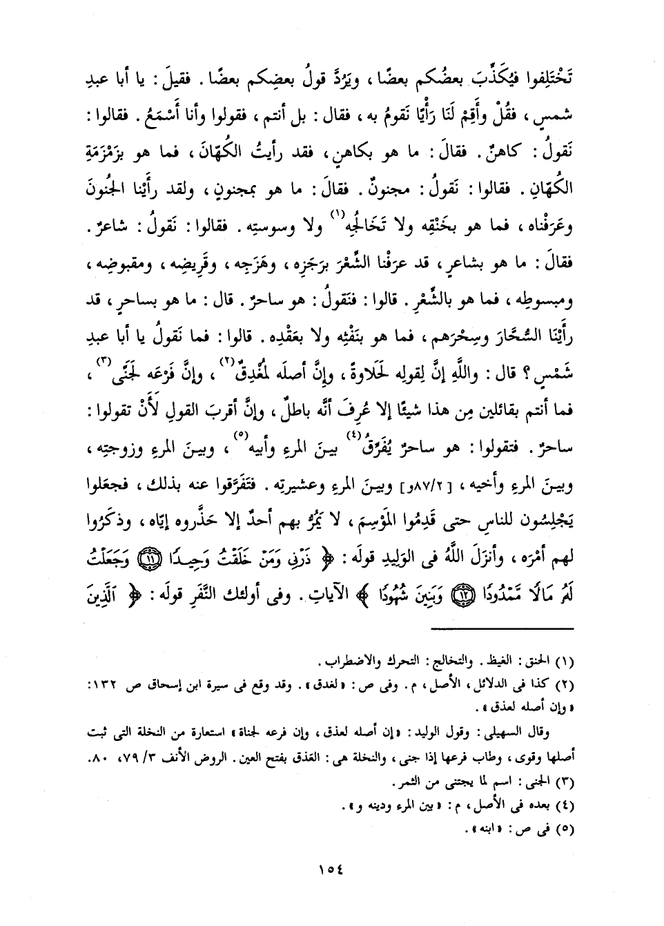 تَخْتَلِفُوا فَيُكَذِّبُ بَعْضُكُمْ بَعْضًا، وَيَرُدُّ قَوْلُ بَعْضِكُمْ بَعْضًا. فَقِيلَ: يَا أَبَا عَبْدِ شَمْسٍ فَقُلْ: وَأَقِمْ لَنَا رَأَيَا نَقُومُ بِهِ. فَقَالَ: بَلْ أَنْتُمْ، فَقُولُوا وَأَنَا أَسْمَعُ. فَقَالُوا: نَقُولُ: كَاهِنٌ. فَقَالَ: مَا هُوَ بِكَاهِنٍ ; فَقَدْ رَأَيْتُ الْكُهَّانَ، فَمَا هُوَ بِزَمْزَمَةِ الْكُهَّانِ. فَقَالُوا: نَقُولُ: مَجْنُونٌ. فَقَالَ: مَا هُوَ بِمَجْنُونٍ، وَلَقَدْ رَأَيْنَا الْجُنُونَ، وَعَرَفْنَاهُ فَمَا هُوَ بِخَنْقِهِ وَلَا تَخَالُجِهِ وَلَا وَسْوَسَتِهِ. فَقَالَ نَقُولُ: شَاعِرٌ. فَقَالَ: مَا هُوَ بِشَاعِرٍ، قَدْ عَرَفْنَا الشِّعْرَ بِرَجَزِهِ، وَهَزَجِهِ، وَقَرِيضِهِ، وَمَقْبُوضِهِ، وَمَبْسُوطِهِ، فَمَا هُوَ بِالشِّعْرِ قَالُوا فَنَقُولُ: هُوَ سَاحِرٌ. قَالَ: مَا هُوَ بِسَاحِرٍ، قَدْ رَأَيْنَا السُّحَّارَ وَسِحْرَهُمْ، فَمَا هُوَ بِنَفْثِهِ، وَلَا بِعَقْدِهِ. قَالُوا: فَمَا نَقُولُ يَا أَبَا عَبْدِ شَمْسٍ؟ قَالَ: وَاللَّهِ إِنَّ لِقَوْلِهِ لَحَلَاوَةً، وَإِنَّ أَصْلَهُ لَمُغْدِقٌ، وَإِنَّ فَرْعَهُ لَجَنًى، فَمَا أَنْتُمْ بِقَائِلِينَ مِنْ هَذَا شَيْئًا إِلَّا عُرِفَ أَنَّهُ بَاطِلٌ، وَإِنَّ أَقْرَبَ الْقَوْلِ لَأَنْ تَقُولُوا: سَاحِرٌ. فَتَقُولُوا: هُوَ سَاحِرٌ يُفَرِّقُ بَيْنَ الْمَرْءِ وَأَبِيهِ، وَبَيْنَ الْمَرْءِ وَزَوْجَتِهِ، وَبَيْنَ الْمَرْءِ وَأَخِيهِ، وَبَيْنَ الْمَرْءِ وَعَشِيرَتِهِ. فَتَفَرَّقُوا عَنْهُ بِذَلِكَ، فَجَعَلُوا يَجْلِسُونَ لِلنَّاسِ حَتَّى قَدِمُوا الْمَوْسِمَ، لَا يَمُرُّ بِهِمْ أَحَدٌ إِلَّا حَذَّرُوهُ إِيَّاهُ، وَذَكَرُوا لَهُمْ أَمَرَهُ، وَأَنْزَلَ اللَّهُ فِي الْوَلِيدِ قَوْلَهُ: {ذَرْنِي وَمَنْ خَلَقْتُ وَحِيدًا وَجَعَلْتُ لَهُ مَالًا مَمْدُودًا وَبَنِينَ شُهُودًا} [المدثر: 11] الْآيَاتِ. وَفِي أُولَئِكَ النَّفَرِ