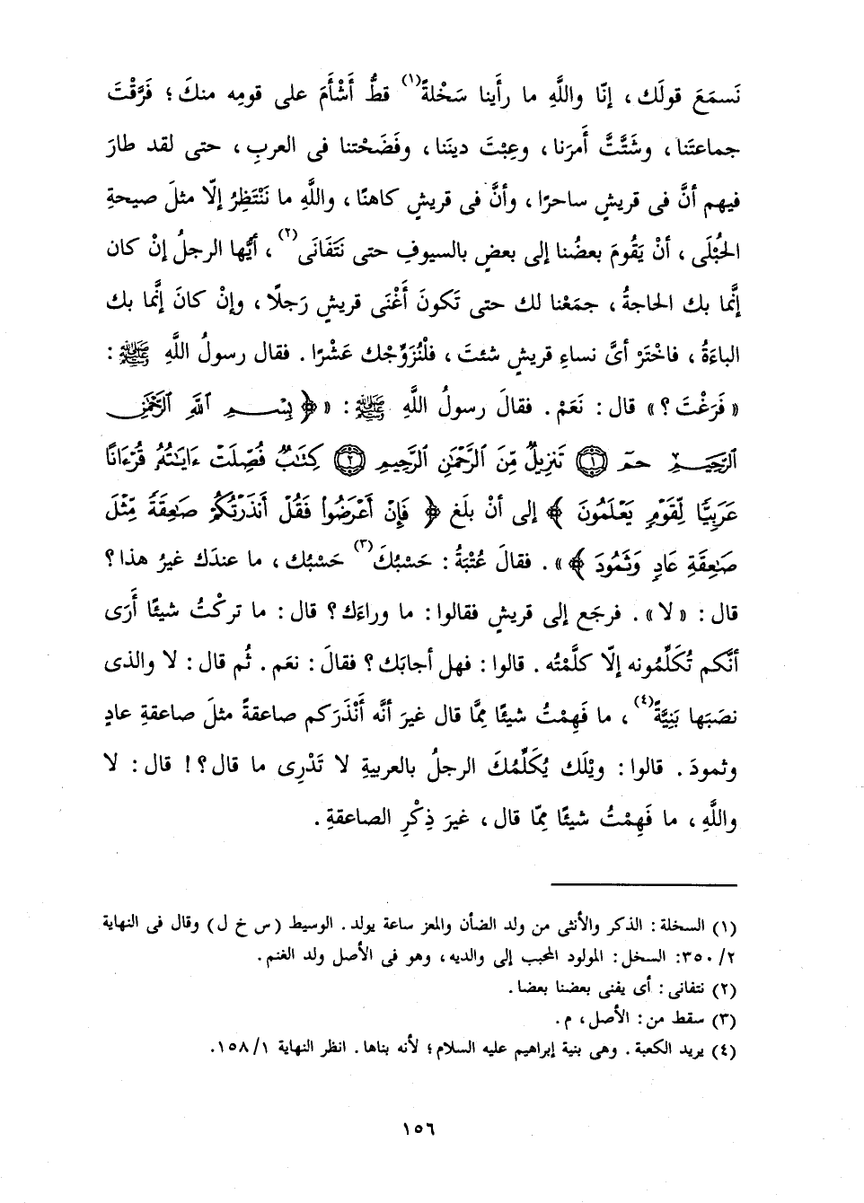 نَسْمَعَ قَوْلَكَ، إِنَّا وَاللَّهِ مَا رَأَيْنَا سَخْلَةً قَطُّ أَشْأَمَ عَلَى قَوْمِهِ مِنْكَ ; فَرَّقْتَ جَمَاعَتَنَا، وَشَتَّتَّ أَمْرَنَا، وَعِبْتَ دِينَنَا، وَفَضَحْتَنَا فِي الْعَرَبِ، حَتَّى لَقَدْ طَارَ فِيهِمْ أَنَّ فِي قُرَيْشٍ سَاحِرًا، وَأَنَّ فِي قُرَيْشٍ كَاهِنًا، وَاللَّهِ مَا نَنْتَظِرُ إِلَّا مِثْلَ صَيْحَةِ الْحُبْلَى، أَنْ يَقُومَ بَعْضُنَا إِلَى بَعْضٍ بِالسُّيُوفِ حَتَّى نَتَفَانَى، أَيُّهَا الرَّجُلُ إِنْ كَانَ إِنَّمَا بِكَ الْحَاجَةُ، جَمَعْنَا لَكَ حَتَّى تَكُونَ أَغْنَى قُرَيْشٍ رَجُلًا، وَإِنْ كَانَ إِنَّمَا بِكَ الْبَاءَةُ فَاخْتَرْ أَيَّ نِسَاءِ قُرَيْشٍ شِئْتَ، فَلْنُزَوِّجْكَ عَشْرًا. فَقَالَ رَسُولُ اللَّهِ - صَلَّى اللَّهُ عَلَيْهِ وَسَلَّمَ -: " فَرَغْتَ؟ ". قَالَ: نَعَمْ. فَقَالَ رَسُولُ اللَّهِ - صَلَّى اللَّهُ عَلَيْهِ وَسَلَّمَ -: " بِسْمِ اللَّهِ الرَّحْمَنِ الرَّحِيمِ حم تَنْزِيلٌ مِنَ الرَّحْمَنِ الرَّحِيمِ {كِتَابٌ فُصِّلَتْ آيَاتُهُ قُرْآنًا عَرَبِيًّا لِقَوْمٍ يَعْلَمُونَ} [فصلت: 3] إِلَى أَنْ بَلَغَ {فَإِنْ أَعْرَضُوا فَقُلْ أَنْذَرْتُكُمْ صَاعِقَةً مِثْلَ صَاعِقَةِ عَادٍ وَثَمُودَ} [فصلت: 13] فَقَالَ عُتْبَةُ: حَسْبُكَ حَسْبُكَ، مَا عِنْدَكَ غَيْرَ هَذَا؟ قَالَ: " لَا ". فَرَجَعَ إِلَى قُرَيْشٍ، فَقَالُوا: مَا وَرَاءَكَ؟ قَالَ مَا تَرَكْتُ شَيْئًا أَرَى أَنَّكُمْ تُكَلِّمُونَهُ إِلَّا كَلَّمْتُهُ. قَالُوا: فَهَلْ أَجَابَكَ؟ فَقَالَ: نَعَمْ. ثُمَّ قَالَ: لَا وَالَّذِي نَصَبَهَا بَنِيَّةً، مَا فَهِمْتُ شَيْئًا مِمَّا قَالَ، غَيْرَ أَنَّهُ أَنْذَرَكُمْ صَاعِقَةً مِثْلَ صَاعِقَةِ عَادٍ وَثَمُودَ. قَالُوا: وَيْلَكَ يُكَلِّمُكَ الرَّجُلُ بِالْعَرَبِيَّةِ لَا تَدْرِي مَا قَالَ؟ ! قَالَ: لَا وَاللَّهِ، مَا فَهِمْتُ شَيْئًا مِمَّا قَالَ، غَيْرَ ذِكْرِ الصَّاعِقَةِ.»