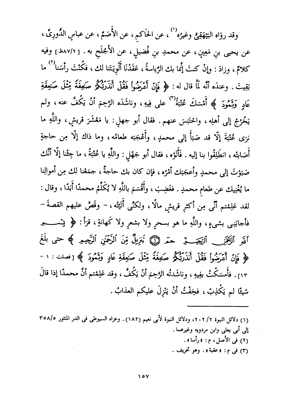وَقَدْ رَوَاهُ الْبَيْهَقِيُّ وَغَيْرُهُ عَنِ الْحَاكِمِ عَنِ الْأَصَمِّ عَنْ عَبَّاسٍ الدُّورِيِّ عَنْ يَحْيَى بْنِ مَعِينٍ عَنْ مُحَمَّدِ بْنِ فُضَيْلٍ عَنِ الْأَجْلَحِ بِهِ. وَفِيهِ كَلَامٌ، وَزَادَ: «وَإِنْ كُنْتَ إِنَّمَا بِكَ الرِّيَاسَةُ عَقَدْنَا أَلْوِيَتَنَا لَكَ، فَكُنْتَ رَأْسَنَا مَا بَقِيتَ. وَعِنْدَهُ: أَنَّهُ لَمَّا قَالَ لَهُ: {فَإِنْ أَعْرَضُوا فَقُلْ أَنْذَرْتُكُمْ صَاعِقَةً مِثْلَ صَاعِقَةِ عَادٍ وَثَمُودَ} [فصلت: 13] أَمْسَكَ عُتْبَةُ عَلَى فِيهِ، وَنَاشَدَهُ الرَّحِمَ أَنْ يَكُفَّ عَنْهُ، وَلَمْ يَخْرُجْ إِلَى أَهْلِهِ، وَاحْتَبَسَ عَنْهُمْ. فَقَالَ أَبُو جَهْلٍ: يَا مَعْشَرَ قُرَيْشٍ، وَاللَّهِ مَا نَرَى عُتْبَةَ إِلَّا صَبَأَ إِلَى مُحَمَّدٍ، وَأَعْجَبَهُ طَعَامُهُ، وَمَا ذَاكَ إِلَّا مِنْ حَاجَةٍ أَصَابَتْهُ، انْطَلِقُوا بِنَا إِلَيْهِ. فَأَتَوْهُ، فَقَالَ أَبُو جَهْلٍ: وَاللَّهِ يَا عُتْبَةُ مَا جِئْنَا إِلَّا أَنَّكَ صَبَوْتَ إِلَى مُحَمَّدٍ، وَأَعْجَبَكَ أَمْرُهُ، فَإِنْ كَانَ بِكَ حَاجَةٌ جَمَعْنَا لَكَ مِنْ أَمْوَالِنَا مَا يُغْنِيكَ عَنْ طَعَامِ مُحَمَّدٍ. فَغَضِبَ وَأَقْسَمَ بِاللَّهِ لَا يُكَلِّمُ مُحَمَّدًا أَبَدًا، وَقَالَ: لَقَدْ عَلِمْتُمْ أَنِّي مِنْ أَكْثَرِ قُرَيْشٍ مَالًا، وَلَكِنِّي أَتَيْتُهُ وَقَصَّ عَلَيْهِمُ الْقِصَّةَ فَأَجَابَنِي بِشَيْءٍ وَاللَّهِ مَا هُوَ بِسِحْرٍ وَلَا بِشِعْرٍ وَلَا كِهَانَةٍ، قَرَأَ بِسْمِ اللَّهِ الرَّحْمَنِ الرَّحِيمِ {حم - تَنْزِيلٌ مِنَ الرَّحْمَنِ الرَّحِيمِ} [فصلت: 1 - 2] حَتَّى بَلَغَ {فَإِنْ أَعْرَضُوا فَقُلْ أَنْذَرْتُكُمْ صَاعِقَةً مِثْلَ صَاعِقَةِ عَادٍ وَثَمُودَ} [فصلت: 13] فَأَمْسَكْتُ بِفِيهِ، وَنَاشَدْتُهُ الرَّحِمَ أَنْ يَكُفَّ، وَقَدْ عَلِمْتُمْ أَنَّ مُحَمَّدًا إِذَا قَالَ شَيْئًا لَمْ يَكْذِبْ، فَخِفْتُ أَنْ يَنْزِلَ عَلَيْكُمُ الْعَذَابُ.»