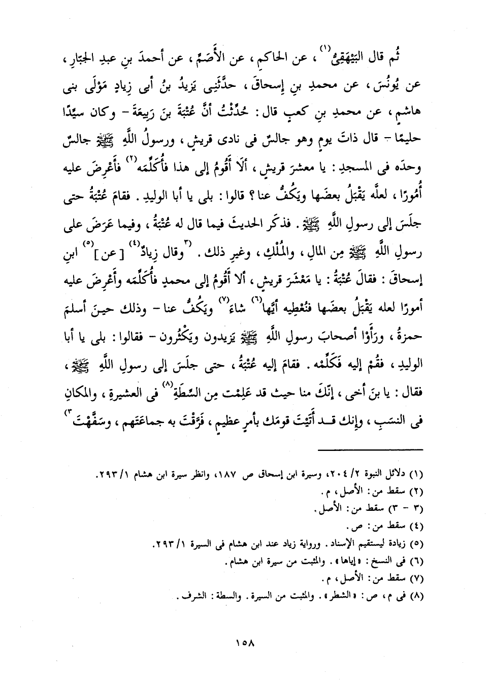 ثُمَّ قَالَ الْبَيْهَقِيُّ عَنِ الْحَاكِمِ عَنِ الْأَصَمِّ عَنْ أَحْمَدَ بْنِ عَبْدِ الْجَبَّارِ عَنْ يُونُسَ عَنْ مُحَمَّدِ بْنِ إِسْحَاقَ حَدَّثَنِي يَزِيدُ بْنُ أَبِي زِيَادٍ مَوْلَى بَنِي هَاشِمٍ عَنْ مُحَمَّدِ بْنِ كَعْبٍ قَالَ: حُدِّثْتُ أَنَّ عُتْبَةَ بْنَ رَبِيعَةَ وَكَانَ سَيِّدًا حَلِيمًا قَالَ ذَاتَ يَوْمٍ وَهُوَ جَالِسٌ فِي نَادِي قُرَيْشٍ، وَرَسُولُ اللَّهِ - صَلَّى اللَّهُ عَلَيْهِ وَسَلَّمَ - جَالِسٌ وَحْدَهُ فِي الْمَسْجِدِ: يَا مَعْشَرَ قُرَيْشٍ، أَلَا أَقُومُ إِلَى هَذَا فَأُكَلِّمُهُ فَأَعْرِضُ عَلَيْهِ أُمُورًا، لَعَلَّهُ يَقْبَلُ بَعْضَهَا وَيَكُفُّ عَنَّا؟ قَالُوا: بَلَى يَا أَبَا الْوَلِيدِ. فَقَامَ عُتْبَةُ حَتَّى جَلَسَ إِلَى رَسُولِ اللَّهِ - صَلَّى اللَّهُ عَلَيْهِ وَسَلَّمَ -. فَذَكَرَ الْحَدِيثَ فِيمَا قَالَ لَهُ عُتْبَةُ وَفِيمَا عَرَضَ عَلَى رَسُولِ اللَّهِ - صَلَّى اللَّهُ عَلَيْهِ وَسَلَّمَ - مِنَ الْمَالِ، وَالْمُلْكِ، وَغَيْرِ ذَلِكَ. وَقَالَ زِيَادٌ عَنِ ابْنِ إِسْحَاقَ: «فَقَالَ عُتْبَةُ: يَا مَعْشَرَ قُرَيْشٍ، أَلَا أَقُومُ إِلَى مُحَمَّدٍ فَأُكَلِّمُهُ، وَأَعْرِضُ عَلَيْهِ أُمُورًا لَعَلَّهُ يَقْبَلُ بَعْضَهَا، فَنُعْطِيهِ أَيُّهَا شَاءَ وَيَكُفُّ عَنَّا وَذَلِكَ حِينَ أَسْلَمَ حَمْزَةُ وَرَأَوْا أَصْحَابَ رَسُولِ اللَّهِ - صَلَّى اللَّهُ عَلَيْهِ وَسَلَّمَ - يَزِيدُونَ وَيَكْثُرُونَ فَقَالُوا: بَلَى يَا أَبَا الْوَلِيدِ فَقُمْ إِلَيْهِ فَكَلِّمْهُ. فَقَامَ إِلَيْهِ عُتْبَةُ حَتَّى جَلَسَ إِلَى رَسُولِ اللَّهِ - صَلَّى اللَّهُ عَلَيْهِ وَسَلَّمَ - فَقَالَ: يَا ابْنَ أَخِي، إِنَّكَ مِنَّا حَيْثُ قَدْ عَلِمْتَ مِنَ السِّطَةِ فِي الْعَشِيرَةِ، وَالْمَكَانِ فِي النَّسَبِ، وَإِنَّكَ قَدْ أَتَيْتَ قَوْمَكَ بِأَمْرٍ عَظِيمٍ، فَرَّقْتَ بِهِ جَمَاعَتَهُمْ، وَسَفَّهْتَ