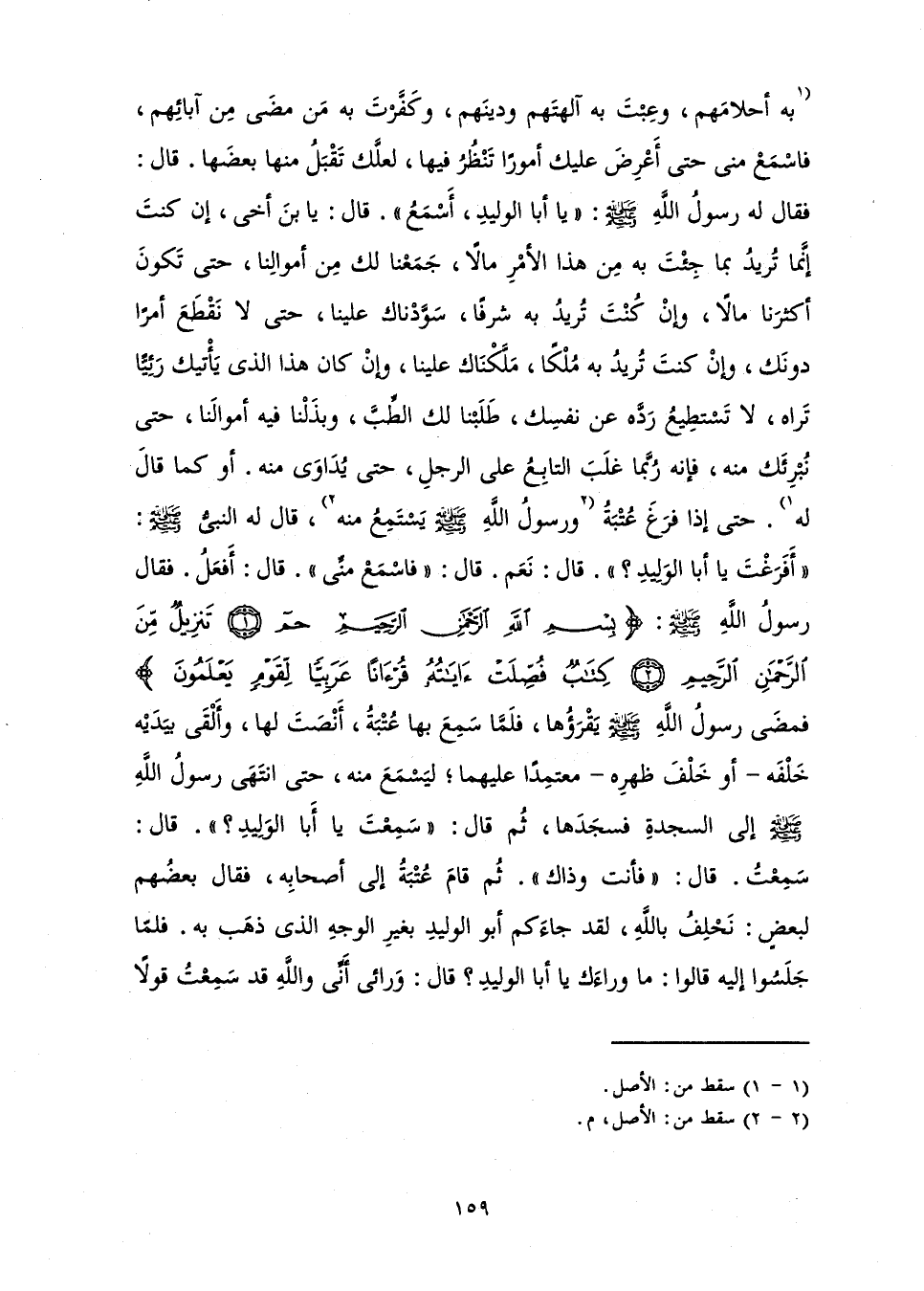 بِهِ أَحْلَامَهُمْ، وَعِبْتَ بِهِ آلِهَتَهُمْ وَدِينَهُمْ، وَكَفَّرْتَ بِهِ مَنْ مَضَى مِنْ آبَائِهِمْ، فَاسْمَعْ مِنِّي حَتَّى أَعْرِضَ عَلَيْكَ أُمُورًا تَنْظُرُ فِيهَا، لَعَلَّكَ تَقْبَلُ مِنْهَا بَعْضَهَا. قَالَ: فَقَالَ لَهُ رَسُولُ اللَّهِ - صَلَّى اللَّهُ عَلَيْهِ وَسَلَّمَ -: " يَا أَبَا الْوَلِيدِ أَسْمَعُ ". قَالَ: يَا ابْنَ أَخِي، إِنْ كُنْتَ إِنَّمَا تُرِيدُ بِمَا جِئْتَ بِهِ مِنْ هَذَا الْأَمْرِ مَالًا، جَمَعْنَا لَكَ مِنْ أَمْوَالِنَا حَتَّى تَكُونَ أَكْثَرَنَا مَالًا، وَإِنْ كُنْتَ تُرِيدُ بِهِ شَرَفًا، سَوَّدْنَاكَ عَلَيْنَا، حَتَّى لَا نَقْطَعَ أَمْرًا دُونَكَ، وَإِنْ كُنْتُ تُرِيدُ بِهِ مُلْكًا مَلَّكْنَاكَ عَلَيْنَا، وَإِنْ كَانَ هَذَا الَّذِي يَأْتِيكَ رَئِيًّا تَرَاهُ، لَا تَسْتَطِيعُ رَدَّهُ عَنْ نَفْسِكَ طَلَبْنَا لَكَ الطِّبَّ، وَبَذَلْنَا فِيهِ أَمْوَالَنَا، حَتَّى نُبْرِئَكَ مِنْهُ، فَإِنَّهُ رُبَّمَا غَلَبَ التَّابِعُ عَلَى الرَّجُلِ، حَتَّى يُدَاوَى مِنْهُ. أَوْ كَمَا قَالَ لَهُ. حَتَّى إِذَا فَرَغَ عُتْبَةُ وَرَسُولُ اللَّهِ - صَلَّى اللَّهُ عَلَيْهِ وَسَلَّمَ - يَسْتَمِعُ مِنْهُ، قَالَ لَهُ النَّبِيُّ - صَلَّى اللَّهُ عَلَيْهِ وَسَلَّمَ -: " أَفَرَغْتَ يَا أَبَا الْوَلِيدِ؟ ". قَالَ: نَعَمْ. قَالَ: " فَاسْمَعْ مِنِّي ". قَالَ: أَفْعَلُ. فَقَالَ رَسُولُ اللَّهِ - صَلَّى اللَّهُ عَلَيْهِ وَسَلَّمَ -: " بِسْمِ اللَّهِ الرَّحْمَنِ الرَّحِيمِ {حم - تَنْزِيلٌ مِنَ الرَّحْمَنِ الرَّحِيمِ - كِتَابٌ فُصِّلَتْ آيَاتُهُ قُرْآنًا عَرَبِيًّا لِقَوْمٍ يَعْلَمُونَ} [فصلت: 1 - 3] فَمَضَى رَسُولُ اللَّهِ - صَلَّى اللَّهُ عَلَيْهِ وَسَلَّمَ - يَقْرَؤُهَا، فَلَمَّا سَمِعَ بِهَا عُتْبَةُ أَنْصَتَ لَهَا، وَأَلْقَى بِيَدَيْهِ خَلْفَهُ أَوْ خَلْفَ ظَهْرِهِ مُعْتَمِدًا عَلَيْهِمَا ; لِيَسْمَعَ مِنْهُ، حَتَّى انْتَهَى رَسُولُ اللَّهِ - صَلَّى اللَّهُ عَلَيْهِ وَسَلَّمَ - إِلَى السَّجْدَةِ فَسَجَدَهَا، ثُمَّ قَالَ: " سَمِعْتَ يَا أَبَا الْوَلِيدِ؟ ". قَالَ: سَمِعْتُ. قَالَ: " فَأَنْتَ وَذَاكَ ". ثُمَّ قَامَ عُتْبَةُ إِلَى أَصْحَابِهِ، فَقَالَ بَعْضُهُمْ لِبَعْضٍ: نَحْلِفُ بِاللَّهِ، لَقَدْ جَاءَكُمْ أَبُو الْوَلِيدِ بِغَيْرِ الْوَجْهِ الَّذِي ذَهَبَ بِهِ. فَلَمَّا جَلَسُوا إِلَيْهِ، قَالُوا: مَا وَرَاءَكَ يَا أَبَا الْوَلِيدِ؟ قَالَ: وَرَائِي أَنِّي وَاللَّهِ قَدْ سَمِعْتُ قَوْلًا