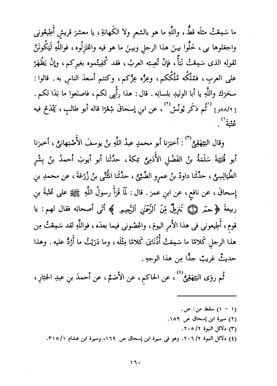 وَقَالَ الْبَيْهَقِيُّ: أَخْبَرَنَا أَبُو مُحَمَّدٍ عَبْدُ اللَّهِ بْنُ يُوسُفَ الْأَصْبَهَانِيُّ أَخْبَرَنَا أَبُو قُتَيْبَةَ سَلَمَةُ بْنُ الْفَضْلِ الْآدَمِيُّ بِمَكَّةَ، حَدَّثَنَا أَبُو أَيُّوبَ أَحْمَدُ بْنُ بِشْرٍ الطَّيَالِسِيُّ حَدَّثَنَا دَاوُدُ بْنُ عَمْرٍو الضَّبِّيُّ حَدَّثَنَا الْمُثَنَّى بْنُ زُرْعَةَ عَنْ مُحَمَّدِ بْنِ إِسْحَاقَ عَنْ نَافِعٍ عَنِ ابْنِ عُمَرَ قَالَ: «لَمَّا قَرَأَ رَسُولُ اللَّهِ - صَلَّى اللَّهُ عَلَيْهِ وَسَلَّمَ - عَلَى عُتْبَةَ بْنِ رَبِيعَةَ {حم تَنْزِيلٌ مِنَ الرَّحْمَنِ الرَّحِيمِ} [فصلت: 1] أَتَى أَصْحَابَهُ، فَقَالَ لَهُمْ: يَا قَوْمِ، أَطِيعُونِي فِي هَذَا الْأَمْرِ الْيَوْمَ، وَاعْصُونِي فِيمَا بَعْدَهُ، فَوَاللَّهِ لَقَدْ سَمِعْتُ مِنْ هَذَا الرَّجُلِ كَلَامًا مَا سَمِعَتْ أُذُنَايَ كَلَامًا مِثْلَهُ، وَمَا دَرَيْتُ مَا أَرُدُّ عَلَيْهِ.» وَهَذَا حَدِيثٌ غَرِيبٌ جِدًّا مِنْ هَذَا الْوَجْهِ.