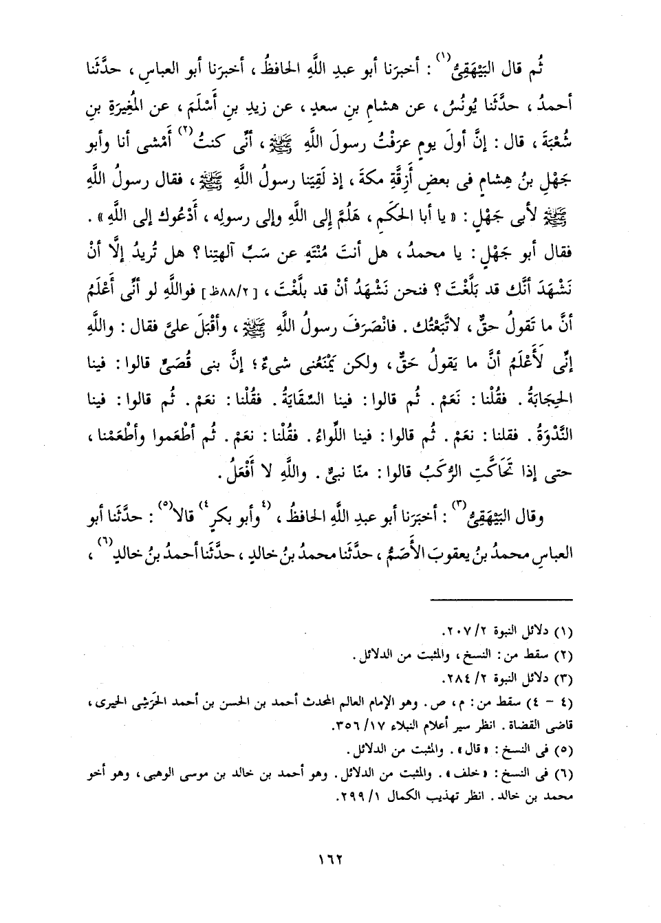 ثُمَّ قَالَ الْبَيْهَقِيُّ: أَخْبَرَنَا أَبُو عَبْدِ اللَّهِ الْحَافِظُ أَخْبَرَنَا أَبُو الْعَبَّاسِ حَدَّثَنَا أَحْمَدُ حَدَّثَنَا يُونُسُ عَنْ هِشَامِ بْنِ سَعْدٍ عَنْ زَيْدِ بْنِ أَسْلَمَ عَنِ الْمُغِيرَةِ بْنِ شُعْبَةَ قَالَ: «إِنَّ أَوَّلَ يَوْمٍ عَرَفْتُ رَسُولَ اللَّهِ - صَلَّى اللَّهُ عَلَيْهِ وَسَلَّمَ - أَنِّي كُنْتُ أَمْشِي أَنَا وَأَبُو جَهْلِ بْنُ هِشَامٍ فِي بَعْضِ أَزِقَّةِ مَكَّةَ، إِذْ لَقِيَنَا رَسُولُ اللَّهِ - صَلَّى اللَّهُ عَلَيْهِ وَسَلَّمَ - فَقَالَ رَسُولُ اللَّهِ - صَلَّى اللَّهُ عَلَيْهِ وَسَلَّمَ - لِأَبِي جَهْلٍ: " يَا أَبَا الْحَكَمِ هَلُمَّ إِلَى اللَّهِ وَإِلَى رَسُولِهِ، أَدْعُوكَ إِلَى اللَّهِ ". فَقَالَ أَبُو جَهْلٍ: يَا مُحَمَّدُ، هَلْ أَنْتَ مُنْتَهٍ عَنْ سَبِّ آلِهَتِنَا؟ هَلْ تُرِيدُ إِلَّا أَنْ نَشْهَدَ أَنَّكَ قَدْ بَلَّغْتَ؟ فَنَحْنُ نَشْهَدُ أَنَّ قَدْ بَلَّغْتَ، فَوَاللَّهِ لَوْ أَنِّي أَعْلَمُ أَنَّ مَا تَقُولُ حَقٌّ لَاتَّبَعْتُكَ. فَانْصَرَفَ رَسُولُ اللَّهِ - صَلَّى اللَّهُ عَلَيْهِ وَسَلَّمَ - وَأَقْبَلَ عَلِيٌّ فَقَالَ: وَاللَّهِ إِنِّي لَأَعْلَمُ أَنَّ مَا يَقُولُ حَقٌّ، وَلَكِنْ يَمْنَعُنِي شَيْءٌ ; إِنَّ بَنِي قُصَيٍّ، قَالُوا: فِينَا الْحِجَابَةُ. فَقُلْنَا: نَعَمْ. ثُمَّ قَالُوا: فِينَا السِّقَايَةُ. فَقُلْنَا: نَعَمْ. ثُمَّ قَالُوا: فِينَا النَّدْوَةُ. فَقُلْنَا: نَعَمْ. ثُمَّ قَالُوا فِينَا اللِّوَاءُ. فَقُلْنَا: نَعَمْ. ثُمَّ أَطْعَمُوا وَأَطْعَمْنَا، حَتَّى إِذَا تَحَاكَّتِ الرُّكَبُ، قَالُوا: مِنَّا نَبِيٌّ. وَاللَّهِ لَا أَفْعَلُ.»