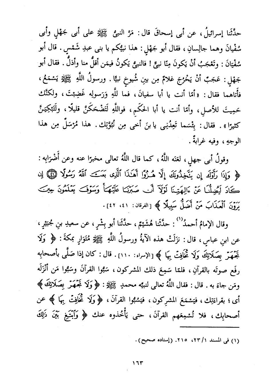 حَدَّثَنَا إِسْرَائِيلُ عَنْ أَبِي إِسْحَاقَ قَالَ: «مَرَّ النَّبِيِّ - صَلَّى اللَّهُ عَلَيْهِ وَسَلَّمَ - عَلَى أَبِي جَهْلٍ وَأَبِي سُفْيَانَ وَهُمَا جَالِسَانِ، فَقَالَ أَبُو جَهْلٍ: هَذَا نَبِيُّكُمْ يَا بَنِي عَبْدِ شَمْسٍ. قَالَ أَبُو سُفْيَانَ: وَتَعْجَبُ أَنْ يَكُونَ مِنَّا نَبِيٌّ! فَالنَّبِيُّ يَكُونُ فِيمَنْ أَقَلُّ مِنَّا وَأَذَلُّ. فَقَالَ أَبُو جَهْلٍ: عَجَبٌ أَنْ يَخْرُجَ غُلَامٌ مِنْ بَيْنِ شُيُوخٍ نَبِيًّا. وَرَسُولُ اللَّهِ - صَلَّى اللَّهُ عَلَيْهِ وَسَلَّمَ - يَسْمَعُ فَأَتَاهُمَا، فَقَالَ: " أَمَّا أَنْتَ يَا أَبَا سُفْيَانَ فَمَا لِلَّهِ وَرَسُولِهِ غَضِبْتَ، وَلَكِنَّكَ حَمِيتَ لِلْأَصْلِ، وَأَمَّا أَنْتَ يَا أَبَا الْحَكَمِ فَوَاللَّهِ لَتَضْحَكَنَّ قَلِيلًا، وَلَتَبْكِيَنَّ كَثِيرًا ". فَقَالَ: بِئْسَمَا تَعِدُنِي يَا ابْنَ أَخِي مِنْ نُبُوَّتِكَ.» هَذَا مُرْسَلٌ مِنْ هَذَا الْوَجْهِ، وَفِيهِ غَرَابَةٌ.
