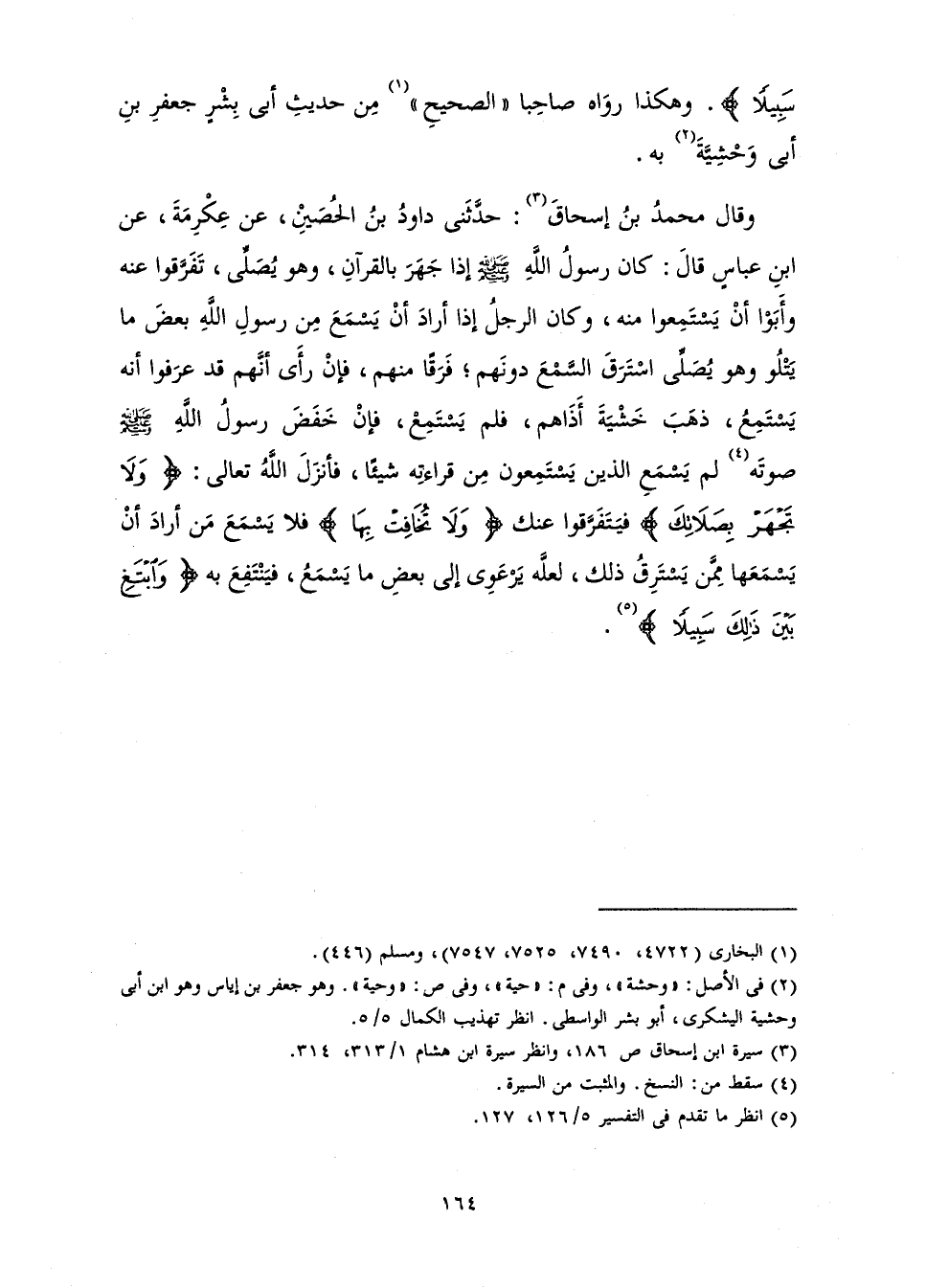 وَقَالَ مُحَمَّدُ بْنُ إِسْحَاقَ: حَدَّثَنِي دَاوُدُ بْنُ الْحُصَيْنِ عَنْ عِكْرِمَةَ عَنِ ابْنِ عَبَّاسٍ قَالَ: «كَانَ رَسُولُ اللَّهِ - صَلَّى اللَّهُ عَلَيْهِ وَسَلَّمَ - إِذَا جَهَرَ بِالْقُرْآنِ، وَهُوَ يُصَلِّي، تَفَرَّقُوا عَنْهُ، وَأَبَوْا أَنْ يَسْتَمِعُوا مِنْهُ، وَكَانَ الرَّجُلُ إِذَا أَرَادَ أَنْ يَسْمَعَ مِنْ رَسُولِ اللَّهِ بَعْضَ مَا يَتْلُو وَهُوَ يُصَلِّي اسْتَرَقَ السَّمْعَ دُونَهُمْ ; فَرَقًا مِنْهُمْ، فَإِنْ رَأَى أَنَّهُمْ قَدْ عَرَفُوا أَنَّهُ يَسْتَمِعُ، ذَهَبَ خَشْيَةَ أَذَاهُمْ، فَلَمْ يَسْتَمِعْ، فَإِنْ خَفَضَ رَسُولُ اللَّهِ - صَلَّى اللَّهُ عَلَيْهِ وَسَلَّمَ - لَمْ يَسْمَعِ الَّذِينَ يَسْتَمِعُونَ مِنْ قِرَاءَتِهِ شَيْئًا، فَأَنْزَلَ اللَّهُ تَعَالَى {وَلَا تَجْهَرْ بِصَلَاتِكَ} [الإسراء: 110] فَيَتَفَرَّقُوا عَنْكَ {وَلَا تُخَافِتْ بِهَا} [الإسراء: 110] فَلَا يَسْمَعُ مَنْ أَرَادَ أَنْ يَسْمَعَهَا مِمَّنْ يَسْتَرِقُ ذَلِكَ، لَعَلَّهُ يَرْعَوِي إِلَى بَعْضِ مَا يَسْمَعُ، فَيَنْتَفِعُ بِهِ {وَابْتَغِ بَيْنَ ذَلِكَ سَبِيلًا} [الإسراء: 110] »