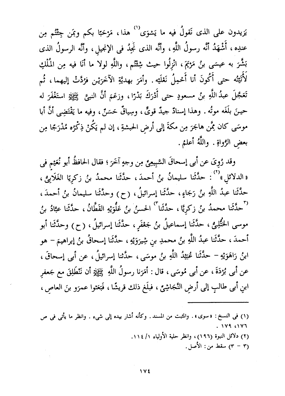 وَقَدْ رُوِيَ عَنْ أَبِي إِسْحَاقَ السَّبِيعِيِّ مِنْ وَجْهٍ آخَرَ ; فَقَالَ الْحَافِظُ أَبُو نُعَيْمٍ فِي " الدَّلَائِلِ ": حَدَّثَنَا سُلَيْمَانُ بْنُ أَحْمَدَ حَدَّثَنَا مُحَمَّدُ بْنُ زَكَرِيَّا الْغَلَابِيُّ حَدَّثَنَا عَبْدُ اللَّهِ بْنُ رَجَاءٍ حَدَّثَنَا إِسْرَائِيلُ (ح) وَحَدَّثَنَا سُلَيْمَانُ بْنُ أَحْمَدَ حَدَّثَنَا مُحَمَّدُ بْنُ زَكَرِيَّا حَدَّثَنَا الْحَسَنُ بْنُ عَلَّوَيْهِ الْقَطَّانُ حَدَّثَنَا عَبَّادُ بْنُ مُوسَى الْخُتَّلِيُّ حَدَّثَنَا إِسْمَاعِيلُ بْنُ جَعْفَرٍ حَدَّثَنَا إِسْرَائِيلُ (ح) وَحَدَّثَنَا أَبُو أَحْمَدَ حَدَّثَنَا عَبْدُ اللَّهِ بْنُ مُحَمَّدِ بْنِ شِيرَوَيْهِ حَدَّثَنَا إِسْحَاقُ بْنُ إِبْرَاهِيمَ هُوَ ابْنُ رَاهْوَيْهِ حَدَّثَنَا عُبَيْدُ اللَّهِ بْنُ مُوسَى حَدَّثَنَا إِسْرَائِيلُ عَنْ أَبِي إِسْحَاقَ عَنْ أَبِي بُرْدَةَ عَنْ أَبِي مُوسَى قَالَ: «أَمَرَنَا رَسُولُ اللَّهِ - صَلَّى اللَّهُ عَلَيْهِ وَسَلَّمَ - أَنْ نَنْطَلِقَ مَعَ جَعْفَرِ بْنِ أَبِي طَالِبٍ إِلَى أَرْضِ النَّجَاشِيِّ فَبَلَغَ ذَلِكَ قُرَيْشًا، فَبَعَثُوا عَمْرَو بْنَ الْعَاصِ