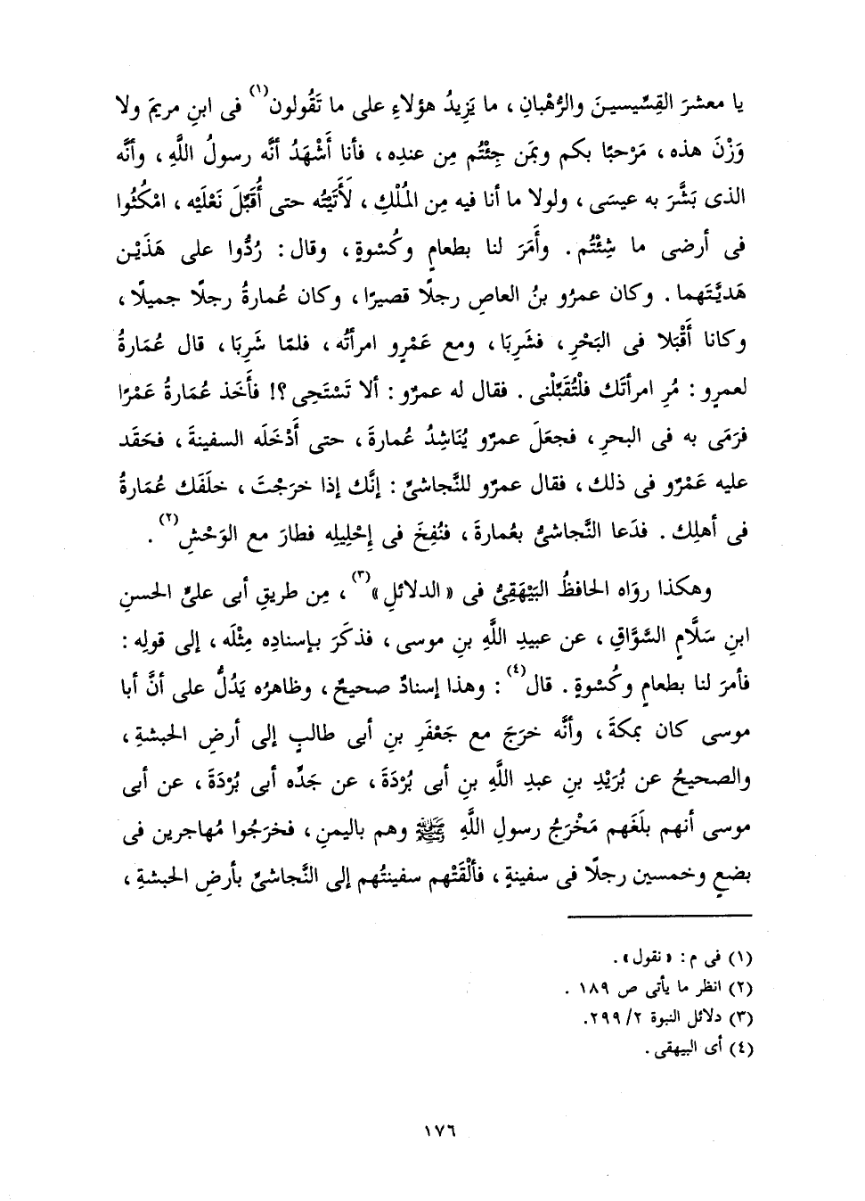 يَا مَعْشَرَ الْقِسِّيسِينَ وَالرُّهْبَانِ، مَا يَزِيدُ هَؤُلَاءِ عَلَى مَا تَقُولُونَ فِي ابْنِ مَرْيَمَ وَلَا وَزْنَ هَذِهِ، مَرْحَبًا بِكُمْ وَبِمَنْ جِئْتُمْ مِنْ عِنْدِهِ، فَأَنَا أَشْهَدُ أَنَّهُ رَسُولُ اللَّهِ، وَأَنَّهُ الَّذِي بَشَّرَ بِهِ عِيسَى، وَلَوْلَا مَا أَنَا فِيهِ مِنَ الْمُلْكِ لَأَتَيْتُهُ حَتَّى أُقَبِّلَ نَعْلَيْهِ، امْكُثُوا فِي أَرْضِي مَا شِئْتُمْ. وَأَمَرَ لَنَا بِطَعَامٍ وَكُسْوَةٍ، وَقَالَ: رَدُّوا عَلَى هَذَيْنَ هَدِيَّتَهُمَا. وَكَانَ عَمْرُو بْنُ الْعَاصِ رَجُلًا قَصِيرًا، وَكَانَ عُمَارَةُ رَجُلًا جَمِيلًا، وَكَانَا أَقْبَلَا فِي الْبَحْرِ، فَشَرِبَا، وَمَعَ عَمْرٍو امْرَأَتُهُ، فَلَمَّا شَرِبَا، قَالَ عُمَارَةُ لِعَمْرٍو: مُرِ امْرَأَتَكَ فَلْتُقَبِّلْنِي. فَقَالَ لَهُ عَمْرٌو: أَلَا تَسْتَحِي؟ ! فَأَخَذَ عُمَارَةُ عُمَرًا فَرَمَى بِهِ فِي الْبَحْرِ، فَجَعَلَ عَمْرٌو يُنَاشِدُ عُمَارَةَ حَتَّى أَدْخَلَهُ السَّفِينَةَ، فَحَقَدَ عَلَيْهِ عَمْرٌو فِي ذَلِكَ، فَقَالَ عَمْرٌو لِلنَّجَاشِيِّ: إِنَّكَ إِذَا خَرَجْتَ خَلَفَكَ عُمَارَةُ فِي أَهْلِكَ. فَدَعَا النَّجَاشِيُّ بِعُمَارَةَ فَنَفَخَ فِي إِحْلِيلِهِ فَطَارَ مَعَ الْوَحْشِ»
