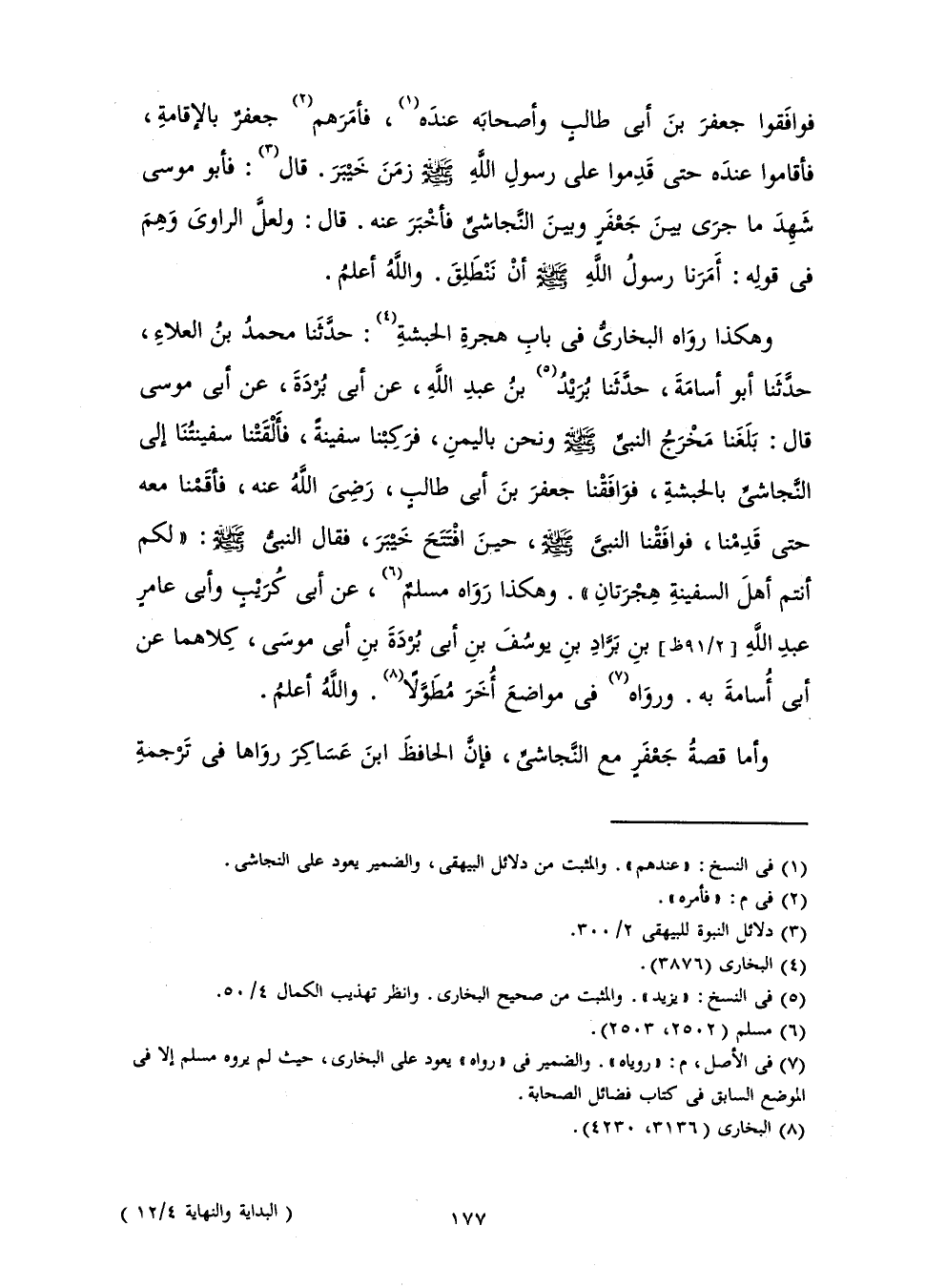 وَهَكَذَا رَوَاهُ الْبُخَارِيُّ فِي بَابِ هِجْرَةِ الْحَبَشَةِ: حَدَّثَنَا مُحَمَّدُ بْنُ الْعَلَاءِ حَدَّثَنَا أَبُو أُسَامَةَ حَدَّثَنَا بُرَيْدُ بْنُ عَبْدِ اللَّهِ عَنْ أَبِي بُرْدَةَ عَنْ أَبِي مُوسَى قَالَ: «بَلَغَنَا مَخْرَجُ النَّبِيِّ - صَلَّى اللَّهُ عَلَيْهِ وَسَلَّمَ - وَنَحْنُ بِالْيَمَنِ، فَرَكِبْنَا سَفِينَةً فَأَلْقَتْنَا سَفِينَتُنَا إِلَى النَّجَاشِيِّ بِالْحَبَشَةِ، فَوَافَقْنَا جَعْفَرَ بْنَ أَبِي طَالِبٍ رَضِيَ اللَّهُ عَنْهُ، فَأَقَمْنَا مَعَهُ حَتَّى قَدِمْنَا، فَوَافَقْنَا النَّبِيَّ - صَلَّى اللَّهُ عَلَيْهِ وَسَلَّمَ - حِينَ افْتَتَحَ خَيْبَرَ، فَقَالَ النَّبِيُّ - صَلَّى اللَّهُ عَلَيْهِ وَسَلَّمَ -: " لَكُمْ أَنْتُمْ أَهْلَ السَّفِينَةِ هِجْرَتَانِ ".» وَهَكَذَا رَوَاهُ مُسْلِمٌ عَنْ أَبِي كُرَيْبٍ وَأَبِي عَامِرٍ عَبْدِ اللَّهِ بْنِ بَرَّادِ بْنِ يُوسُفَ بْنِ أَبِي بُرْدَةَ بْنِ أَبِي مُوسَى كِلَاهُمَا عَنْ أَبِي أُسَامَةَ بِهِ. وَرَوَاهُ فِي مَوَاضِعَ أُخَرَ مُطَوَّلًا. وَاللَّهُ أَعْلَمُ