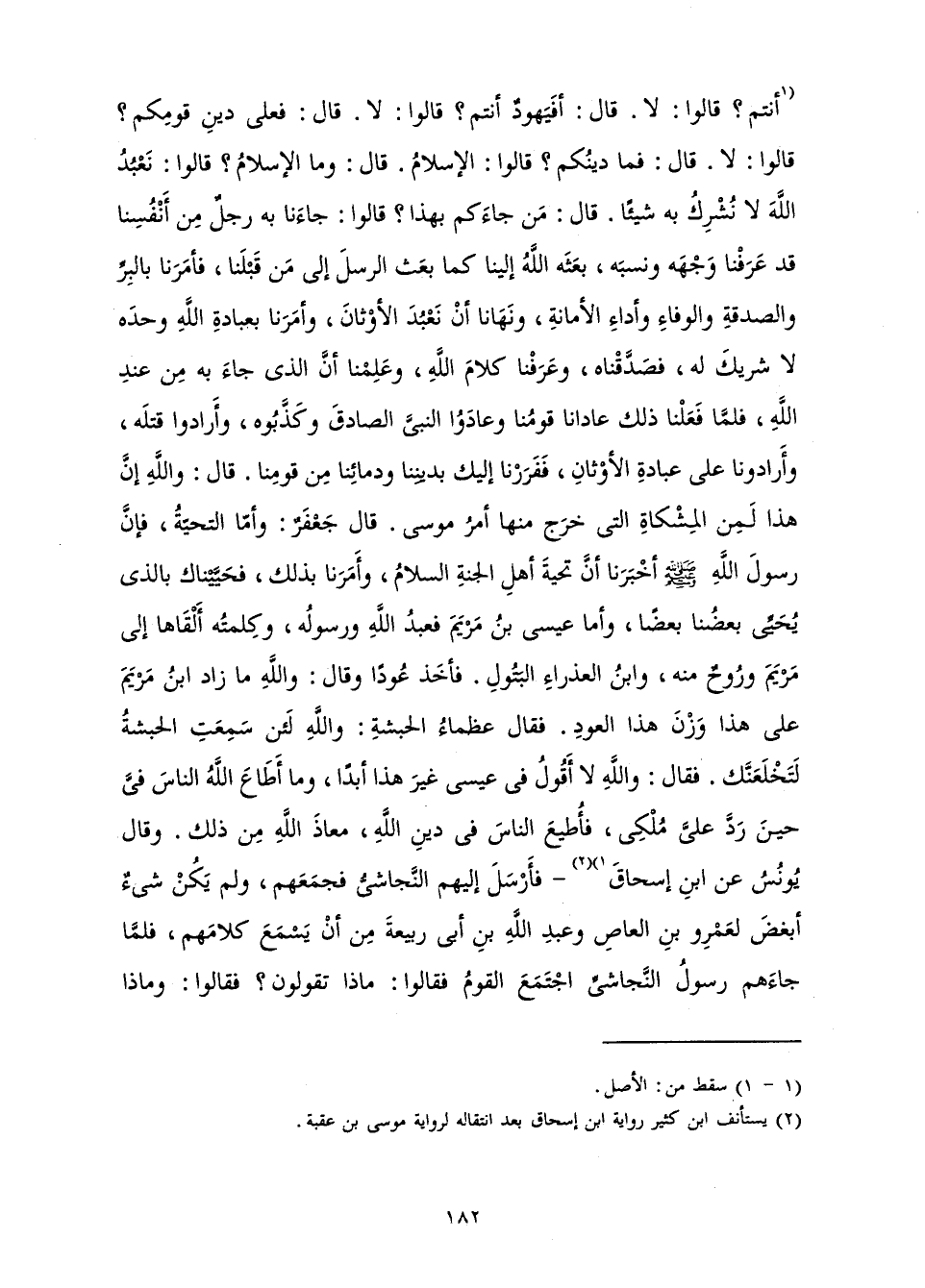 أَنْتُمْ؟ قَالُوا: لَا. قَالَ: أَفَيَهُودٌ أَنْتُمْ؟ قَالُوا: لَا. قَالَ فَعَلَى دِينِ قَوْمِكُمْ؟ قَالُوا: لَا. قَالَ: فَمَا دِينُكُمْ؟ قَالُوا: الْإِسْلَامُ. قَالَ: وَمَا الْإِسْلَامُ؟ قَالُوا: نَعْبُدُ اللَّهَ لَا نُشْرِكُ بِهِ شَيْئًا. قَالَ: مَنْ جَاءَكُمْ بِهَذَا؟ قَالُوا: جَاءَنَا بِهِ رَجُلٌ مِنْ أَنْفُسِنَا، قَدْ عَرَفْنَا وَجْهَهُ وَنَسَبَهُ، بَعَثَهُ اللَّهُ إِلَيْنَا كَمَا بَعَثَ الرُّسُلَ إِلَى مَنْ قَبْلَنَا، فَأَمَرَنَا بِالْبَرِّ وَالصَّدَقَةِ وَالْوَفَاءِ وَأَدَاءِ الْأَمَانَةِ، وَنَهَانَا أَنْ نَعْبُدَ الْأَوْثَانَ، وَأَمَرَنَا بِعِبَادَةِ اللَّهِ وَحْدَهُ لَا شَرِيكَ لَهُ، فَصَدَّقْنَاهُ وَعَرَفْنَا كَلَامَ اللَّهِ، وَعَلِمْنَا أَنَّ الَّذِي جَاءَ بِهِ مِنْ عِنْدِ اللَّهِ، فَلَمَّا فَعَلْنَا ذَلِكَ عَادَانَا قَوْمُنَا، وَعَادَوُا النَّبِيَّ الصَّادِقَ وَكَذَّبُوهُ، وَأَرَادُوا قَتْلَهُ، وَأَرَادُونَا عَلَى عِبَادَةِ الْأَوْثَانِ، فَفَرَرْنَا إِلَيْكَ بِدِينِنَا وَدِمَائِنَا مِنْ قَوْمِنَا. قَالَ: وَاللَّهِ إِنَّ هَذَا لَمِنَ الْمِشْكَاةِ الَّتِي خَرَجَ مِنْهَا أَمْرُ مُوسَى. قَالَ جَعْفَرٌ: وَأَمَّا التَّحِيَّةُ، فَإِنَّ رَسُولَ اللَّهِ - صَلَّى اللَّهُ عَلَيْهِ وَسَلَّمَ - أَخْبَرَنَا أَنَّ تَحِيَّةَ أَهْلِ الْجَنَّةِ السَّلَامُ، وَأَمَرَنَا بِذَلِكَ فَحَيَّيْنَاكَ بِالَّذِي يُحَيِّي بَعْضُنَا بَعْضًا، وَأَمَّا عِيسَى ابْنُ مَرْيَمَ فَعَبْدُ اللَّهِ وَرَسُولُهُ، وَكَلِمَتُهُ أَلْقَاهَا إِلَى مَرْيَمَ وَرُوحٌ مِنْهُ، وَابْنُ الْعَذْرَاءِ الْبَتُولِ. فَأَخَذَ عُودًا وَقَالَ: وَاللَّهِ مَا زَادَ ابْنُ مَرْيَمَ عَلَى هَذَا وَزْنَ هَذَا الْعُودِ. فَقَالَ عُظَمَاءُ الْحَبَشَةِ: وَاللَّهِ لَئِنْ سَمِعَتِ الْحَبَشَةُ لَتَخْلَعَنَّكَ. فَقَالَ: وَاللَّهِ لَا أَقُولُ فِي عِيسَى غَيْرَ هَذَا أَبَدًا. وَمَا أَطَاعَ اللَّهُ النَّاسَ فِيَّ حِينِ رَدَّ عَلَيَّ مُلْكِي، فَأُطِيعَ النَّاسَ فِي دِينِ اللَّهِ، مَعَاذَ اللَّهِ مِنْ ذَلِكَ» . وَقَالَ يُونُسُ عَنِ ابْنِ إِسْحَاقَ فَأَرْسَلَ إِلَيْهِمُ النَّجَاشِيُّ فَجَمَعَهُمْ، وَلَمْ يَكُنْ شَيْءٌ أَبْغَضَ لِعَمْرِو بْنِ الْعَاصِ وَعَبْدِ اللَّهِ بْنِ أَبِي رَبِيعَةَ مِنْ أَنْ يَسْمَعَ كَلَامَهُمْ، فَلَمَّا جَاءَهُمْ رَسُولُ النَّجَاشِيِّ اجْتَمَعَ الْقَوْمُ، فَقَالُوا: مَاذَا تَقُولُونَ؟ فَقَالُوا: وَمَاذَا