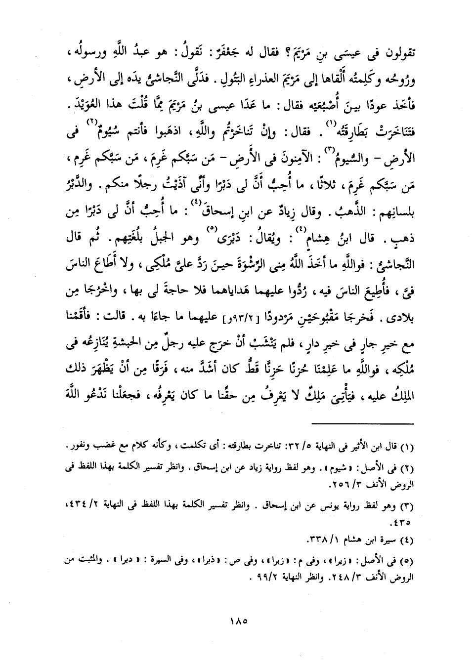 تَقُولُونَ فِي عِيسَى ابْنِ مَرْيَمَ؟ فَقَالَ لَهُ جَعْفَرٌ: نَقُولُ هُوَ عَبْدُ اللَّهِ وَرَسُولُهُ، وَرُوحُهُ وَكَلِمَتُهُ أَلْقَاهَا إِلَى مَرْيَمَ الْعَذْرَاءِ الْبَتُولِ. فَدَلَّى النَّجَاشِيُّ يَدَهُ إِلَى الْأَرْضِ فَأَخَذَ عُودًا بَيْنَ أُصْبُعَيْهِ فَقَالَ: مَا عَدَا عِيسَى ابْنُ مَرْيَمَ مِمَّا قُلْتَ هَذَا الْعُوَيْدَ. فَتَنَاخَرَتْ بَطَارِقَتُهُ. فَقَالَ: وَإِنْ تَنَاخَرْتُمْ وَاللَّهِ، اذْهَبُوا فَأَنْتُمْ سُيُومٌ فِي الْأَرْضِ وَالسُّيُومُ: الْآمِنُونَ فِي الْأَرْضِ مَنْ سَبَّكُمْ غَرِمَ، مَنْ سَبَّكُمْ غَرِمَ، مَنْ سَبَّكُمْ غَرِمَ، ثَلَاثًا، مَا أُحِبُّ أَنَّ لِي دَبْرًا، وَأَنِّي آذَيْتُ رَجُلًا مِنْكُمْ. وَالدَّبْرُ بِلِسَانِهِمُ: الذَّهَبُ. وَقَالَ زِيَادٌ عَنِ ابْنِ إِسْحَاقَ: مَا أُحِبُّ أَنَّ لِي دَبْرًا مِنْ ذَهَبٍ. قَالَ ابْنُ هِشَامٍ: وَيُقَالُ: دَبْرَى وَهُوَ الْجَبَلُ بِلُغَتِهِمْ. ثُمَّ قَالَ النَّجَاشِيُّ: فَوَاللَّهِ مَا أَخَذَ اللَّهُ مِنِّي الرِّشْوَةَ حِينَ رَدَّ عَلَيَّ مُلْكِي، وَلَا أَطَاعَ النَّاسَ فِيَّ فَأُطِيعَ النَّاسَ فِيهِ، رُدُّوا عَلَيْهِمَا هَدَايَاهُمَا فَلَا حَاجَةَ لِي بِهَا، وَاخْرُجَا مِنْ بِلَادِي، فَخَرَجَا مَقْبُوحَيْنِ مَرْدُودًا عَلَيْهِمَا مَا جَاءَا بِهِ. قَالَتْ: فَأَقَمْنَا مَعَ خَيْرِ جَارٍ فِي خَيْرِ دَارٍ، فَلَمْ يَنْشَبْ أَنْ خَرَجَ عَلَيْهِ رَجُلٌ مِنَ الْحَبَشَةِ يُنَازِعُهُ فِي مِلْكِهِ، فَوَاللَّهِ مَا عَلِمْنَا حُزْنًا حَزِنَّا قَطُّ كَانَ أَشَدَّ مِنْهُ. فَرَقًا مِنْ أَنْ يَظْهَرَ ذَلِكَ الْمَلِكُ عَلَيْهِ. فَيَأْتِي مَلِكٌ لَا يَعْرِفُ مِنْ حَقِّنَا مَا كَانَ يَعْرِفُهُ، فَجَعَلْنَا نَدْعُو اللَّهَ