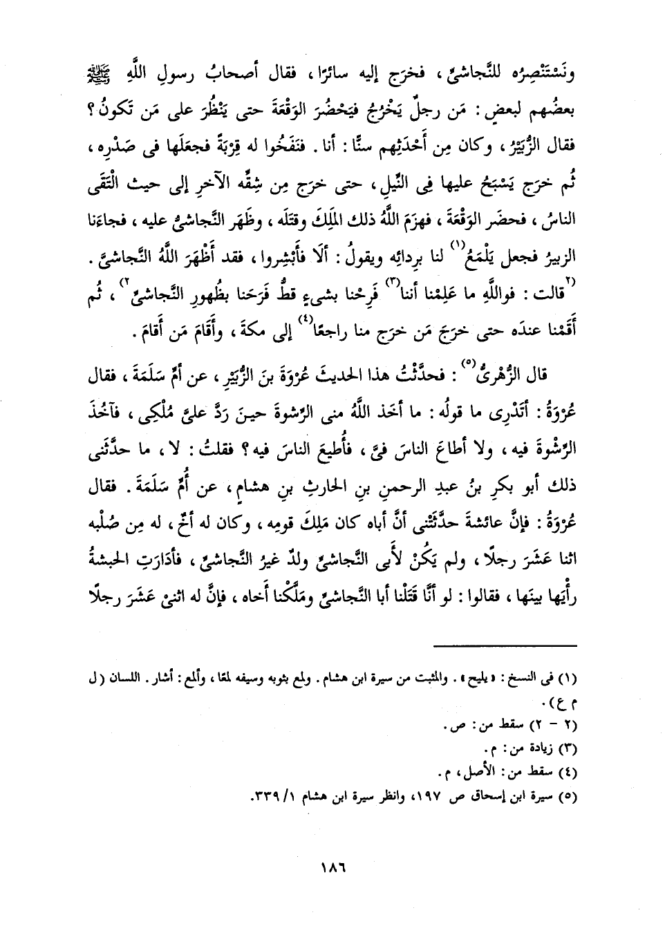 وَنَسْتَنْصِرُهُ لِلنَّجَاشِيِّ فَخَرَجَ إِلَيْهِ سَائِرًا، فَقَالَ أَصْحَابُ رَسُولِ اللَّهِ - صَلَّى اللَّهُ عَلَيْهِ وَسَلَّمَ - بَعْضُهُمْ لِبَعْضٍ: مَنْ رَجُلٌ يَخْرُجُ فَيَحْضُرُ الْوَقْعَةَ حَتَّى يَنْظُرَ عَلَى مَنْ تَكُونُ؟ فَقَالَ الزُّبَيْرُ وَكَانَ مِنْ أَحْدَثِهِمْ سِنًّا: أَنَا. فَنَفَخُوا لَهُ قِرْبَةً فَجَعَلَهَا فِي صَدْرِهِ، ثُمَّ خَرَجَ يَسْبَحُ عَلَيْهَا فِي النِّيلِ، حَتَّى خَرَجَ مِنْ شِقِّهِ الْآخَرِ إِلَى حَيْثُ الْتَقَى النَّاسُ، فَحَضَرَ الْوَقْعَةَ، فَهَزَمَ اللَّهُ ذَلِكَ الْمَلِكَ وَقَتَلَهُ، وَظَهَرَ النَّجَاشِيُّ عَلَيْهِ، فَجَاءَنَا الزُّبَيْرُ فَجَعَلَ يَلْمَعُ لَنَا بِرِدَائِهِ، وَيَقُولُ: أَلَا فَأَبْشِرُوا، فَقَدْ أَظْهَرَ اللَّهُ النَّجَاشِيَّ. قُلْتُ: فَوَاللَّهِ مَا عَلِمْنَا أَنَّنَا فَرِحْنَا بِشَيْءٍ قَطُّ فَرَحَنَا بِظُهُورِ النَّجَاشِيِّ ثُمَّ أَقَمْنَا عِنْدَهُ حَتَّى خَرَجَ مَنْ خَرَجَ مِنَّا رَاجِعًا إِلَى مَكَّةَ، وَأَقَامَ مَنْ أَقَامَ