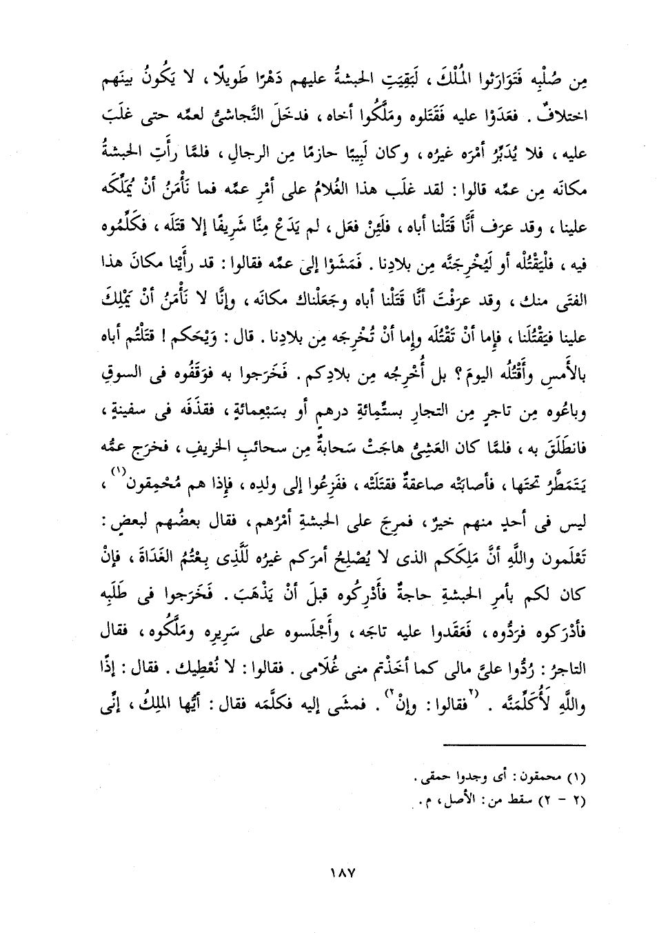 مِنْ صُلْبِهِ فَتَوَارَثُوا الْمُلْكَ، لَبَقِيَتِ الْحَبَشَةُ عَلَيْهِمْ دَهْرًا طَوِيلًا، لَا يَكُونُ بَيْنَهُمُ اخْتِلَافٌ. فَعَدَوْا عَلَيْهِ فَقَتَلُوهُ وَمَلَّكُوا أَخَاهُ، فَدَخَلَ النَّجَاشِيُّ لِعَمِّهِ حَتَّى غَلَبَ عَلَيْهِ، فَلَا يُدَبِّرُ أَمْرَهُ غَيْرُهُ، وَكَانَ لَبِيبًا حَازِمًا مِنَ الرِّجَالِ، فَلَمَّا رَأَتِ الْحَبَشَةُ مَكَانَهُ مِنْ عَمِّهِ، قَالُوا: لَقَدْ غَلَبَ هَذَا الْغُلَامُ عَلَى أَمْرِ عَمِّهِ، فَمَا نَأْمَنُ أَنْ يُمَلِّكَهُ عَلَيْنَا، وَقَدْ عَرَفَ أَنَّا قَتَلْنَا أَبَاهُ، فَلَئِنْ فَعَلَ لَمْ يَدَعْ مِنَّا شَرِيفًا إِلَّا قَتَلَهُ، فَكَلِّمُوهُ فِيهِ فَلْيَقْتُلْهُ أَوْ لَيُخْرِجَنَّهُ مِنْ بِلَادِنَا. فَمَشَوْا إِلَى عَمِّهِ، فَقَالُوا: قَدْ رَأَيْنَا مَكَانَ هَذَا الْفَتَى مِنْكَ، وَقَدْ عَرَفْتَ أَنَّا قَتَلْنَا أَبَاهُ وَجَعَلْنَاكَ مَكَانَهُ، وَإِنَّا لَا نَأْمَنُ أَنْ يَمْلِكَ عَلَيْنَا فَيَقْتُلَنَا، فَإِمَّا أَنْ تَقْتُلَهُ، وَإِمَّا أَنَّ تُخْرِجَهُ مِنْ بِلَادِنَا. قَالَ: وَيْحَكُمْ: قَتَلْتُمْ أَبَاهُ بِالْأَمْسِ، وَأَقْتُلُهُ الْيَوْمَ؟ بَلْ أُخْرِجُهُ مِنْ بِلَادِكُمْ. فَخَرَجُوا بِهِ فَوَقَفُوهُ فِي السُّوقِ وَبَاعُوهُ مِنْ تَاجِرٍ مِنَ التُّجَّارِ بِسِتِّمِائَةِ دِرْهَمٍ أَوْ بِسَبْعِمِائَةٍ، فَقَذَفَهُ فِي سَفِينَةٍ، فَانْطَلَقَ بِهِ، فَلَمَّا كَانَ الْعَشِيُّ هَاجَتْ سَحَابَةٌ مِنْ سَحَائِبِ الْخَرِيفِ، فَخَرَجَ عَمُّهُ يَتَمَطَّرُ تَحْتَهَا، فَأَصَابَتْهُ صَاعِقَةٌ فَقَتَلَتْهُ، فَفَزِعُوا إِلَى وَلَدِهِ، فَإِذَا هُمْ مُحْمِقُونَ، لَيْسَ فِي أَحَدٍ مِنْهُمْ خَيْرٌ، فَمَرَجَ عَلَى الْحَبَشَةِ أَمْرُهُمْ، فَقَالَ بَعْضُهُمْ لِبَعْضٍ: تَعْلَمُونَ وَاللَّهِ أَنَّ مَلِكَكُمُ الَّذِي لَا يُصْلِحُ أَمْرَكُمْ غَيْرُهُ لَلَّذِي بِعْتُمُ الْغَدَاةَ، فَإِنْ كَانَ لَكُمْ بِأَمْرِ الْحَبَشَةِ حَاجَةٌ فَأَدْرِكُوهُ قَبْلَ أَنْ يَذْهَبَ. فَخَرَجُوا فِي طَلَبِهِ فَأَدْرَكُوهُ فَرَدُّوهُ، فَعَقَدُوا عَلَيْهِ تَاجَهُ، وَأَجْلَسُوهُ عَلَى سَرِيرِهِ وَمَلَّكُوهُ، فَقَالَ التَّاجِرُ: رُدُّوا عَلَيَّ مَالِي كَمَا أَخَذْتُمْ مِنِّي غُلَامِي. فَقَالُوا: لَا نُعْطِيكَ. فَقَالَ: إِذًا وَاللَّهِ لَأُكَلِّمَنَّهُ. فَقَالُوا: وَإِنْ. فَمَشَى إِلَيْهِ فَكَلَّمَهُ، فَقَالَ: أَيُّهَا الْمَلِكُ، إِنِّي