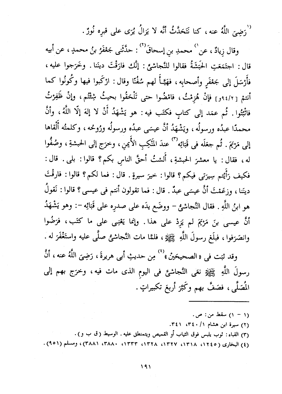 وَقَالَ زِيَادٌ عَنْ مُحَمَّدِ بْنِ إِسْحَاقَ: حَدَّثَنِي جَعْفَرُ بْنُ مُحَمَّدٍ عَنْ أَبِيهِ، قَالَ «اجْتَمَعَتِ الْحَبَشَةُ فَقَالُوا لِلنَّجَاشِيِّ: إِنَّكَ فَارَقْتَ دِينَنَا. وَخَرَجُوا عَلَيْهِ، فَأَرْسَلَ إِلَى جَعْفَرٍ وَأَصْحَابِهِ، فَهَيَّأَ لَهُمْ سُفُنًا، وَقَالَ: ارْكَبُوا فِيهَا، وَكُونُوا كَمَا أَنْتُمْ، فَإِنْ هُزِمْتُ فَامْضُوا حَتَّى تَلْحَقُوا بِحَيْثُ شِئْتُمْ، وَإِنْ ظَفِرْتُ فَاثْبُتُوا. ثُمَّ عَمَدَ إِلَى كِتَابٍ فَكَتَبَ فِيهِ: هُوَ يَشْهَدُ أَنْ لَا إِلَهَ إِلَّا اللَّهُ وَأَنَّ مُحَمَّدًا عَبْدُهُ وَرَسُولُهُ، وَيَشْهَدُ أَنَّ عِيسَى عَبْدُهُ وَرَسُولُهُ وَرُوحُهُ، وَكَلِمَتُهُ أَلْقَاهَا إِلَى مَرْيَمَ. ثُمَّ جَعَلَهُ فِي قَبَائِهِ عِنْدَ الْمَنْكِبِ الْأَيْمَنِ وَخَرَجَ إِلَى الْحَبَشَةِ، وَصَفُّوا لَهُ، فَقَالَ: يَا مَعْشَرَ الْحَبَشَةِ، أَلَسْتُ أَحَقَّ النَّاسِ بِكُمْ؟ قَالُوا: بَلَى. قَالَ: فَكَيْفَ رَأَيْتُمْ سِيرَتِي فِيكُمْ؟ قَالُوا: خَيْرَ سِيرَةٍ. قَالَ: فَمَا لَكُمْ؟ قَالُوا: فَارَقْتَ دِينَنَا، وَزَعَمْتَ أَنَّ عِيسَى عَبْدٌ. قَالَ: فَمَا تَقُولُونَ أَنْتُمْ فِي عِيسَى؟ قَالُوا: نَقُولُ هُوَ ابْنُ اللَّهِ. فَقَالَ النَّجَاشِيُّ وَوَضَعَ يَدَهُ عَلَى صَدْرِهِ عَلَى قَبَائِهِ: وَهُوَ يَشْهَدُ أَنَّ عِيسَى ابْنَ مَرْيَمَ لَمْ يَزِدْ عَلَى هَذَا. وَإِنَّمَا يَعْنِي عَلَى مَا كَتَبَ، فَرَضُوا وَانْصَرَفُوا، فَبَلَغَ رَسُولَ اللَّهِ - صَلَّى اللَّهُ عَلَيْهِ وَسَلَّمَ - فَلَمَّا مَاتَ النَّجَاشِيُّ صَلَّى عَلَيْهِ وَاسْتَغْفَرَ لَهُ»