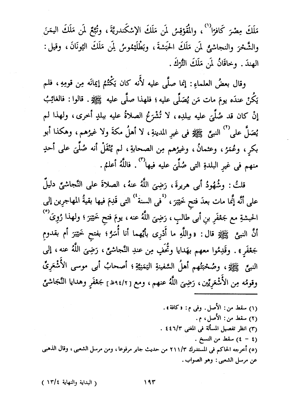 قُلْتُ: وَشُهُودُ أَبِي هُرَيْرَةَ رَضِيَ اللَّهُ عَنْهُ، الصَّلَاةَ عَلَى النَّجَاشِيِّ دَلِيلٌ عَلَى أَنَّهُ إِنَّمَا مَاتَ بَعْدَ فَتْحِ خَيْبَرَ فِي السَّنَةِ، الَّتِي قَدِمَ بَقِيَّةُ الْمُهَاجِرِينَ إِلَى الْحَبَشَةِ مَعَ جَعْفَرِ بْنِ أَبِي طَالِبٍ رَضِيَ اللَّهُ عَنْهُ، يَوْمَ فَتْحِ خَيْبَرَ ; وَلِهَذَا رُوِيَ أَنَّ النَّبِيَّ - صَلَّى اللَّهُ عَلَيْهِ وَسَلَّمَ - قَالَ: «وَاللَّهِ مَا أَدْرِي بِأَيِّهِمَا أَنَا أُسَرُّ ; بِفَتْحِ خَيْبَرَ، أَمْ بِقُدُومِ جَعْفَرِ بْنِ أَبِي طَالِبٍ ".» وَقَدِمُوا مَعَهُمْ بِهَدَايَا وَتُحَفٍ مِنْ عِنْدِ النَّجَاشِيِّ رَضِيَ اللَّهُ عَنْهُ، إِلَى النَّبِيِّ - صَلَّى اللَّهُ عَلَيْهِ وَسَلَّمَ - وَصُحْبَتُهُمْ أَهْلُ السَّفِينَةِ الْيَمَنِيَّةِ ; أَصْحَابُ أَبِي مُوسَى الْأَشْعَرِيِّ وَقَوْمُهُ مِنَ الْأَشْعَرِيِّينَ، رَضِيَ اللَّهُ عَنْهُمْ، وَمَعَ جَعْفَرٍ وَهَدَايَا النَّجَاشِيِّ