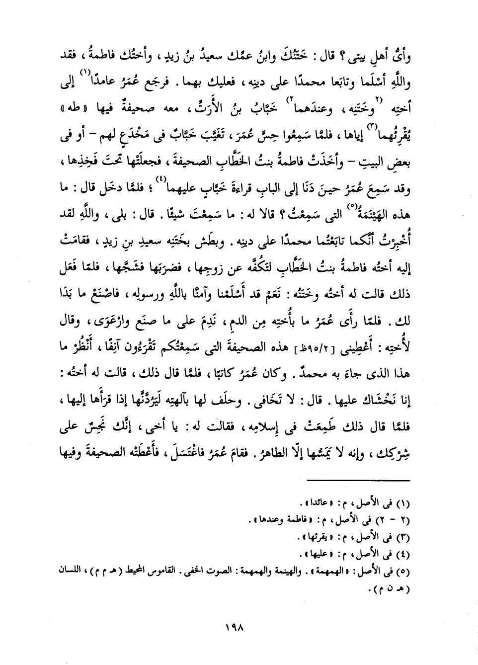 وَأَيُّ أَهْلِ بَيْتِي؟ قَالَ: خَتْنُكَ وَابْنُ عَمِّكَ سَعِيدُ بْنُ زَيْدٍ وَأُخْتُكَ فَاطِمَةُ، فَقَدْ وَاللَّهِ أَسْلَمَا، وَتَابَعَا مُحَمَّدًا عَلَى دِينِهِ فَعَلَيْكَ بِهِمَا. فَرَجَعَ عُمَرُ عَامِدًا إِلَى أُخْتِهِ وَخَتْنِهِ، وَعِنْدَهُمَا خَبَّابُ بْنُ الْأَرَتِّ مَعَهُ صَحِيفَةٌ فِيهَا " طَهَ " يُقْرِئُهُمَا إِيَّاهَا، فَلَمَّا سَمِعُوا حِسَّ عُمَرَ تَغَيَّبَ خَبَّابٌ فِي مَخْدَعٍ لَهُمْ أَوْ فِي بَعْضِ الْبَيْتِ، وَأَخَذَتْ فَاطِمَةُ بِنْتُ الْخَطَّابِ الصَّحِيفَةَ فَجَعَلَتْهَا تَحْتَ فَخِذِهَا، وَقَدْ سَمِعَ عُمَرُ حِينَ دَنَا إِلَى الْبَابِ قِرَاءَةَ خَبَّابٍ عَلَيْهِمَا، فَلَمَّا دَخَلَ، قَالَ: مَا هَذِهِ الْهَيْنَمَةُ الَّتِي سَمِعْتُ؟ قَالَا لَهُ: مَا سَمِعْتَ شَيْئًا. قَالَ: بَلَى، وَاللَّهِ لَقَدْ أُخْبِرْتُ أَنَّكُمَا تَابَعْتُمَا مُحَمَّدًا عَلَى دِينِهِ. وَبَطَشَ بِخَتْنِهِ سَعِيدِ بْنِ زَيْدٍ فَقَامَتْ إِلَيْهِ أُخْتُهُ فَاطِمَةُ بِنْتُ الْخَطَّابِ لِتَكُفَّهُ عَنْ زَوْجِهَا، فَضَرَبَهَا فَشَجَّهَا، فَلَمَّا فَعَلَ ذَلِكَ، قَالَتْ لَهُ أُخْتُهُ وَخَتْنُهُ: نَعَمْ قَدْ أَسْلَمْنَا، وَآمَنَّا بِاللَّهِ وَرَسُولِهِ، فَاصْنَعْ مَا بَدَا لَكَ. فَلَمَّا رَأَى عُمَرُ مَا بِأُخْتِهِ مِنَ الدَّمِ، نَدِمَ عَلَى مَا صَنَعَ وَارْعَوَى، وَقَالَ: لِأُخْتِهِ أَعْطِينِي هَذِهِ الصَّحِيفَةَ الَّتِي سَمِعْتُكُمْ تَقْرَؤُونَ آنِفًا، أَنْظُرُ مَا هَذَا الَّذِي جَاءَ بِهِ مُحَمَّدٌ. وَكَانَ عُمَرُ كَاتِبًا، فَلَمَّا قَالَ ذَلِكَ، قَالَتْ لَهُ أُخْتُهُ: إِنَّا نَخْشَاكَ عَلَيْهَا. قَالَ: لَا تَخَافِي. وَحَلَفَ لَهَا بِآلِهَتِهِ لَيَرُدَّنَّهَا إِذَا قَرَأَهَا إِلَيْهَا. فَلَمَّا قَالَ ذَلِكَ، طَمِعَتْ فِي إِسْلَامِهِ. فَقَالَتْ لَهُ: يَا أَخِي، إِنَّكَ نَجَسٌ عَلَى شِرْكِكَ، وَإِنَّهُ لَا يَمَسُّهَا إِلَّا الطَّاهِرُ. فَقَامَ عُمَرُ فَاغْتَسَلَ، فَأَعْطَتْهُ الصَّحِيفَةَ، وَفِيهَا
