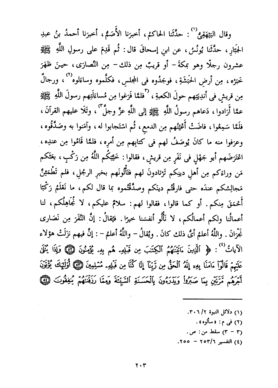 وَقَالَ الْبَيْهَقِيُّ: حَدَّثَنَا الْحَاكِمُ أَخْبَرَنَا الْأَصَمُّ أَخْبَرَنَا أَحْمَدُ بْنُ عَبْدِ الْجَبَّارِ حَدَّثَنَا يُونُسُ عَنِ ابْنِ إِسْحَاقَ قَالَ: ثُمَّ قَدِمَ عَلَى رَسُولِ اللَّهِ - صَلَّى اللَّهُ عَلَيْهِ وَسَلَّمَ - عِشْرُونَ رَجُلًا وَهُوَ بِمَكَّةَ أَوْ قَرِيبٌ مِنْ ذَلِكَ مِنَ النَّصَارَى، حِينَ ظَهَرَ خَبَرُهُ، مَنْ أَرْضِ الْحَبَشَةِ، فَوَجَدُوهُ فِي الْمَجْلِسِ فَكَلَّمُوهُ وَسَاءَلُوهُ، وَرِجَالٌ مِنْ قُرَيْشٍ فِي أَنْدِيَتِهِمْ حَوْلَ الْكَعْبَةِ، فَلَمَّا فَرَغُوا مِنْ مُسَاءَلَتِهِمْ رَسُولَ اللَّهِ - صَلَّى اللَّهُ عَلَيْهِ وَسَلَّمَ - عَمَّا أَرَادُوا، دَعَاهُمْ رَسُولُ اللَّهِ - صَلَّى اللَّهُ عَلَيْهِ وَسَلَّمَ - إِلَى اللَّهِ عَزَّ وَجَلَّ، وَتَلَا عَلَيْهِمُ الْقُرْآنَ، فَلَمَّا سَمِعُوا فَاضَتْ أَعْيُنُهُمْ مِنَ الدَّمْعِ، ثُمَّ اسْتَجَابُوا لَهُ وَآمَنُوا بِهِ وَصَدَّقُوهُ، وَعَرَفُوا مِنْهُ مَا كَانَ يُوصَفُ لَهُمْ فِي كِتَابِهِمْ مِنْ أَمْرِهِ، فَلَمَّا قَامُوا مِنْ عِنْدِهِ اعْتَرَضَهُمْ أَبُو جَهْلٍ فِي نَفَرٍ مِنْ قُرَيْشٍ، فَقَالُوا: خَيَّبَكُمُ اللَّهُ مِنْ رَكْبٍ، بَعَثَكُمْ مَنْ وَرَاءَكُمْ مِنْ أَهْلِ دِينِكُمْ تَرْتَادُونَ لَهُمْ فَتَأْتُونَهُمْ بِخَبَرِ الرَّجُلِ، فَلَمْ تَطْمَئِنَّ مَجَالِسُكُمْ عِنْدَهُ حَتَّى فَارَقْتُمْ دِينَكُمْ وَصَدَّقْتُمُوهُ بِمَا قَالَ لَكُمْ، مَا نَعْلَمُ رَكْبًا أَحْمَقَ مِنْكُمْ. أَوْ كَمَا قَالُوا، فَقَالُوا لَهُمْ: سَلَامٌ عَلَيْكُمْ، لَا نُجَاهِلُكُمْ، لَنَا أَعْمَالُنَا وَلَكُمْ أَعْمَالُكُمْ، لَا نَأْلُو أَنْفُسَنَا خَيْرًا. فَيُقَالُ: إِنَّ النَّفَرَ مِنْ نَصَارَى نَجْرَانَ. وَاللَّهُ أَعْلَمُ أَيُّ ذَلِكَ كَانَ. وَيُقَالُ وَاللَّهُ أَعْلَمُ إِنَّ فِيهِمْ نَزَلَتْ هَؤُلَاءِ الْآيَاتُ