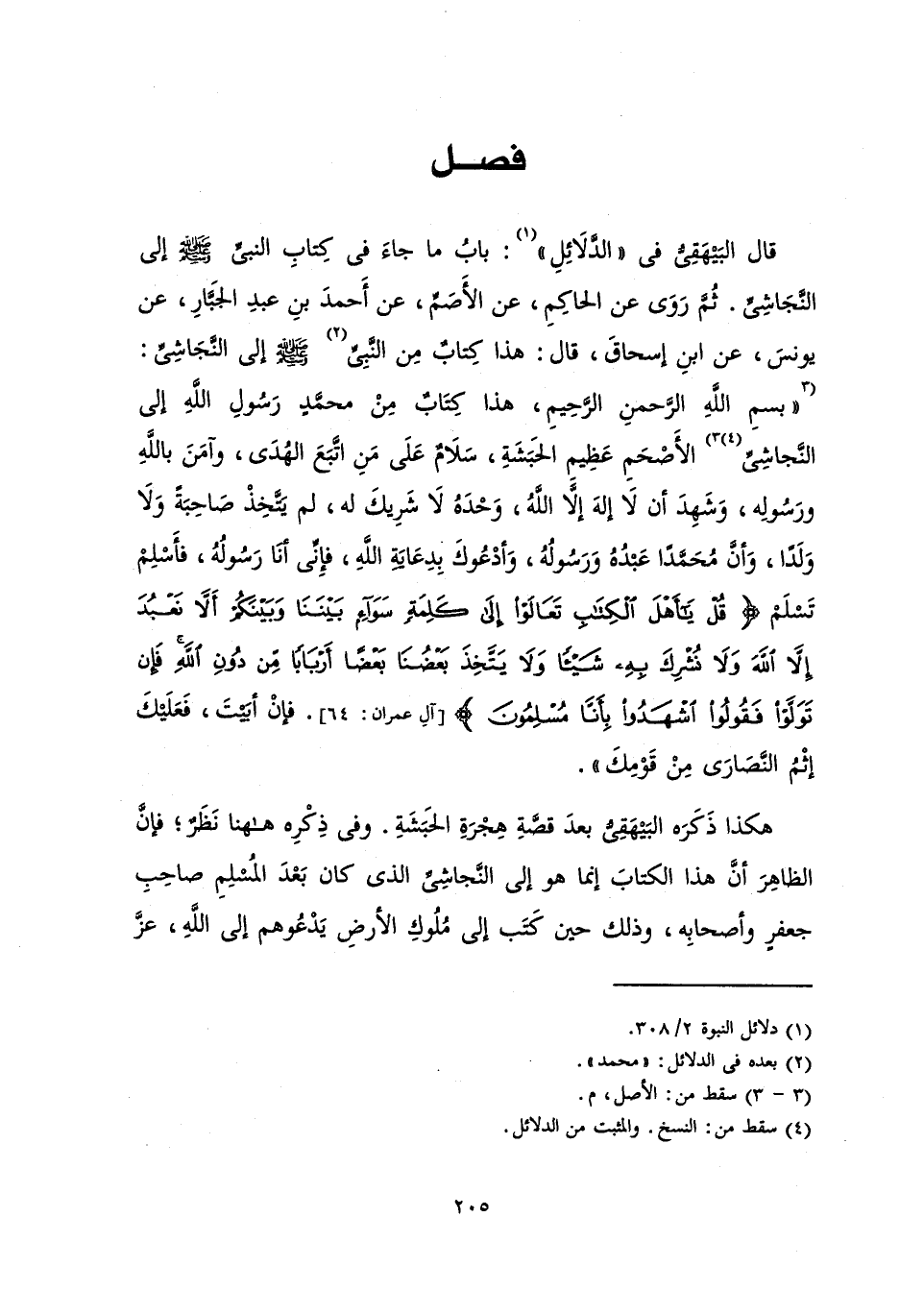 قَالَ الْبَيْهَقِيُّ فِي " الدَّلَائِلِ ": بَابُ مَا جَاءَ فِي كِتَابِ النَّبِيِّ - صَلَّى اللَّهُ عَلَيْهِ وَسَلَّمَ - إِلَى النَّجَاشِيِّ. ثُمَّ رَوَى عَنِ الْحَاكِمِ عَنِ الْأَصَمِّ عَنْ أَحْمَدَ بْنِ عَبْدِ الْجَبَّارِ عَنْ يُونُسَ عَنِ ابْنِ إِسْحَاقَ قَالَ: «هَذَا كِتَابٌ مِنَ النَّبِيِّ - صَلَّى اللَّهُ عَلَيْهِ وَسَلَّمَ - إِلَى النَّجَاشِيِّ: بِسْمِ اللَّهِ الرَّحْمَنِ الرَّحِيمِ، هَذَا كِتَابٌ مِنْ مُحَمَّدٍ رَسُولِ اللَّهِ إِلَى النَّجَاشِيِّ الْأَصْحَمِ عَظِيمِ الْحَبَشَةِ، سَلَامٌ عَلَى مَنِ اتَّبَعَ الْهُدَى، وَآمَنَ بِاللَّهِ وَرَسُولِهِ، وَشَهِدَ أَنْ لَا إِلَهَ إِلَّا اللَّهُ وَحْدَهُ لَا شَرِيكَ لَهُ، لَمْ يَتَّخِذْ صَاحِبَةً وَلَا وَلَدًا، وَأَنَّ مُحَمَّدًا عَبْدُهُ وَرَسُولُهُ، وَأَدْعُوكَ بِدَعَايَةِ اللَّهِ، فَإِنِّي أَنَا رَسُولُهُ، فَأَسْلِمْ تَسْلَمْ {قُلْ يَا أَهْلَ الْكِتَابِ تَعَالَوْا إِلَى كَلِمَةٍ سَوَاءٍ بَيْنَنَا وَبَيْنَكُمْ أَلَّا نَعْبُدَ إِلَّا اللَّهَ وَلَا نُشْرِكَ بِهِ شَيْئًا وَلَا يَتَّخِذَ بَعْضُنَا بَعْضًا أَرْبَابًا مِنْ دُونِ اللَّهِ فَإِنْ تَوَلَّوْا فَقُولُوا اشْهَدُوا بِأَنَّا مُسْلِمُونَ} [آل عمران: 64] فَإِنْ أَبَيْتَ فَعَلَيْكَ إِثْمُ النَّصَارَى مِنْ قَوْمِكَ ".»