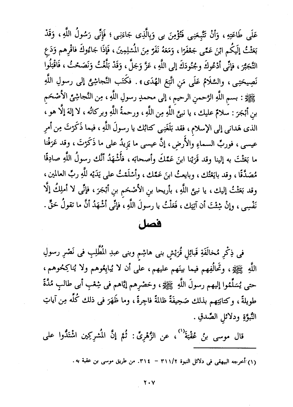 عَلَى طَاعَتِهِ وَأَنْ تَتَّبِعَنِي فَتُؤْمِنَ بِي، وَبِالَّذِي جَاءَنِي ; فَإِنِّي رَسُولُ اللَّهِ، وَقَدْ بَعَثْتُ إِلَيْكُمُ ابْنَ عَمِّي جَعْفَرًا وَمَعَهُ نَفَرٌ مِنَ الْمُسْلِمِينَ، فَإِذَا جَاؤُوكَ فَاقْرِهِمْ، وَدَعِ التَّجَبُّرَ، فَإِنِّي أَدْعُوكَ وَجُنُودَكَ إِلَى اللَّهِ عَزَّ وَجَلَّ، وَقَدْ بَلَّغْتُ وَنَصَحْتُ، فَاقْبَلُوا نَصِيحَتِي، وَالسَّلَامُ عَلَى مَنِ اتَّبَعَ الْهُدَى ".» فَكَتَبَ النَّجَاشِيُّ إِلَى رَسُولِ اللَّهِ - صَلَّى اللَّهُ عَلَيْهِ وَسَلَّمَ -: بِسْمِ اللَّهِ الرَّحْمَنِ الرَّحِيمِ، إِلَى مُحَمَّدٍ رَسُولِ اللَّهِ مِنَ النَّجَاشِيِّ الْأَصْحَمِ بْنِ أَبْجَرَ: سَلَامٌ عَلَيْكَ يَا نَبِيَّ اللَّهِ مِنَ اللَّهِ وَرَحْمَةُ اللَّهِ وَبَرَكَاتُهُ، لَا إِلَهَ إِلَّا هُوَ الَّذِي هَدَانِي إِلَى الْإِسْلَامِ، فَقَدْ بَلَغَنِي كِتَابُكَ يَا رَسُولَ اللَّهِ، فِيمَا ذَكَرْتَ مِنْ أَمْرِ عِيسَى فَوَرَبِّ السَّمَاءِ وَالْأَرْضِ إِنَّ عِيسَى مَا يَزِيدُ عَلَى مَا ذَكَرْتَ، وَقَدْ عَرَفْنَا مَا بَعَثْتَ بِهِ إِلَيْنَا، وَقَدْ قَرَيْنَا ابْنَ عَمِّكَ وَأَصْحَابَهُ، فَأَشْهَدُ أَنَّكَ رَسُولُ اللَّهِ صَادِقًا مُصَدَّقًا، وَقَدْ بَايَعْتُكَ وَبَايَعْتُ ابْنَ عَمِّكَ، وَأَسْلَمْتُ عَلَى يَدَيْهِ لِلَّهِ رَبِّ الْعَالَمِينَ، وَقَدْ بَعَثْتُ إِلَيْكَ يَا نَبِيَّ اللَّهِ بِأَرِيحَا بْنِ الْأَصْحَمِ بْنِ أَبْجَرَ فَإِنِّي لَا أَمْلِكُ إِلَّا نَفْسِي، وَإِنْ شِئْتَ أَنْ آتِيَكَ، فَعَلْتُ يَا رَسُولَ اللَّهِ، فَإِنِّي أَشْهَدُ أَنَّ مَا تَقُولُ حَقٌّ.