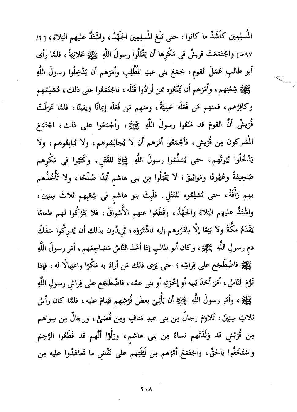 الْمُسْلِمِينَ كَأَشَدِّ مَا كَانُوا، حَتَّى بَلَغَ الْمُسْلِمِينَ الْجُهْدُ، وَاشْتَدَّ عَلَيْهِمُ الْبَلَاءُ، وَاجْتَمَعَتْ قُرَيْشٌ فِي مَكْرِهَا أَنْ يَقْتُلُوا رَسُولَ اللَّهِ - صَلَّى اللَّهُ عَلَيْهِ وَسَلَّمَ - عَلَانِيَةً، فَلَمَّا رَأَى أَبُو طَالِبٍ عَمَلَ الْقَوْمِ جَمَعَ بَنِي عَبْدِ الْمُطَّلِبِ، وَأَمَرَهُمْ أَنْ يُدْخِلُوا رَسُولَ اللَّهِ - صَلَّى اللَّهُ عَلَيْهِ وَسَلَّمَ - شِعْبَهُمْ، وَأَمَرَهَمْ أَنْ يَمْنَعُوهُ مِمَّنْ أَرَادُوا قَتْلَهُ، فَاجْتَمَعُوا عَلَى ذَلِكَ، مُسْلِمُهُمْ وَكَافِرُهُمْ، فَمِنْهُمْ مَنْ فَعَلَهُ حَمِيَّةً، وَمِنْهُمْ مَنْ فَعَلَهُ إِيمَانًا وَيَقِينًا، فَلَمَّا عَرَفَتْ قُرَيْشٌ أَنَّ الْقَوْمَ قَدْ مَنَعُوا رَسُولَ اللَّهِ - صَلَّى اللَّهُ عَلَيْهِ وَسَلَّمَ - وَأَجْمَعُوا عَلَى ذَلِكَ، اجْتَمَعَ الْمُشْرِكُونَ مِنْ قُرَيْشٍ، فَأَجْمَعُوا أَمْرَهُمْ أَنْ لَا يُجَالِسُوهُمْ، وَلَا يُبَايِعُوهُمْ، وَلَا يَدْخُلُوا بُيُوتَهُمْ، حَتَّى يُسَلِّمُوا رَسُولَ اللَّهِ - صَلَّى اللَّهُ عَلَيْهِ وَسَلَّمَ - لِلْقَتْلِ، وَكَتَبُوا فِي مَكْرِهِمْ صَحِيفَةً وَعُهُودًا وَمَوَاثِيقَ، لَا يَقْبَلُوا مِنْ بَنِي هَاشِمٍ أَبَدًا صُلْحًا، وَلَا تَأْخُذُهُمْ بِهِمْ رَأْفَةٌ، حَتَّى يُسْلِمُوهُ لِلْقَتْلِ. فَلَبِثَ بَنُو هَاشِمٍ فِي شِعْبِهِمْ ثَلَاثَ سِنِينَ، وَاشْتَدَّ عَلَيْهِمُ الْبَلَاءُ وَالْجَهْدُ، وَقَطَعُوا عَنْهُمُ الْأَسْوَاقَ، فَلَا يَتْرُكُوا لَهُمْ طَعَامًا يَقَدَمُ مَكَّةَ وَلَا بَيْعًا إِلَّا بَادَرُوهُمْ إِلَيْهِ فَاشْتَرَوْهُ ; يُرِيدُونَ بِذَلِكَ أَنْ يُدْرِكُوا سَفْكَ دَمِ رَسُولِ اللَّهِ - صَلَّى اللَّهُ عَلَيْهِ وَسَلَّمَ - وَكَانَ أَبُو طَالِبٍ إِذَا أَخَذَ النَّاسُ مَضَاجِعَهُمْ، أَمَرَ رَسُولَ اللَّهِ - صَلَّى اللَّهُ عَلَيْهِ وَسَلَّمَ - فَاضْطَجَعَ عَلَى فِرَاشِهِ ; حَتَّى يَرَى ذَلِكَ مَنْ أَرَادَ بِهِ مَكْرًا وَاغْتِيَالًا لَهُ، فَإِذَا نَوَّمَ النَّاسُ، أَمَرَ أَحَدَ بَنِيهِ أَوْ إِخْوَتِهِ أَوْ بَنِي عَمِّهِ فَاضْطَجَعَ عَلَى فِرَاشِ رَسُولِ اللَّهِ - صَلَّى اللَّهُ عَلَيْهِ وَسَلَّمَ - وَأَمَرَ رَسُولَ اللَّهِ - صَلَّى اللَّهُ عَلَيْهِ وَسَلَّمَ - أَنْ يَأْتِيَ بَعْضَ فُرُشِهِمْ فَيَنَامَ عَلَيْهِ، فَلَمَّا كَانَ رَأْسُ ثَلَاثِ سِنِينَ، تَلَاوَمَ رِجَالٌ مِنْ بَنِي عَبْدِ مَنَافٍ، وَمِنْ قُصَيٍّ، وَرِجَالٌ مِنْ سِوَاهُمْ مِنْ قُرَيْشٍ قَدْ وَلَدَتْهُمْ نِسَاءٌ مِنْ بَنِي هَاشِمٍ، وَرَأَوْا أَنَّهُمْ قَدْ قَطَعُوا الرَّحِمَ، وَاسْتَخَفُّوا بِالْحَقِّ، وَاجْتَمَعَ أَمْرُهُمْ مِنْ لَيْلَتِهِمْ عَلَى نَقْضِ مَا تَعَاهَدُوا عَلَيْهِ مِنْ