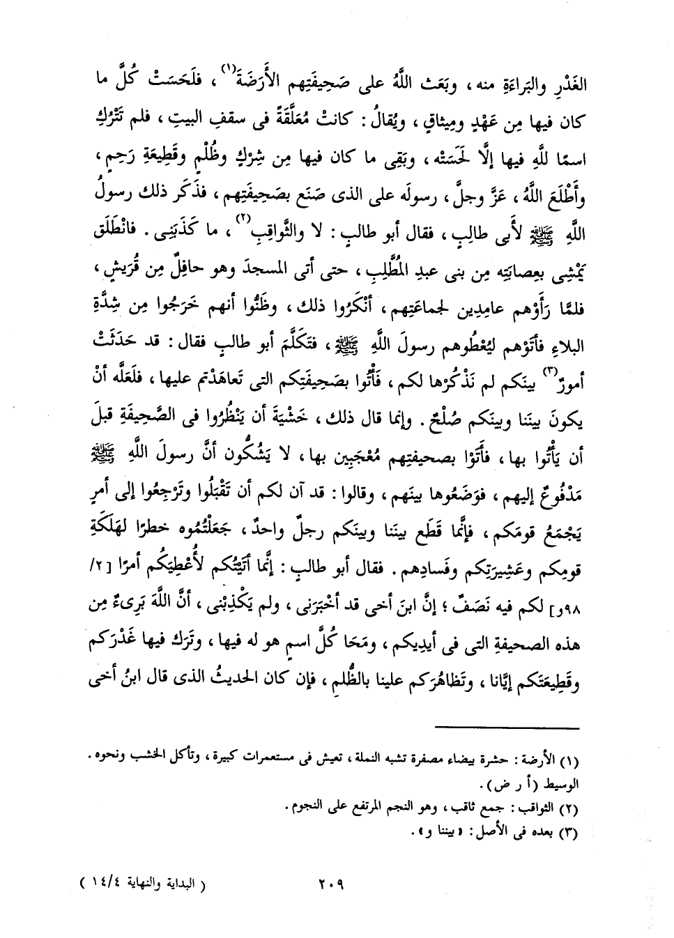 الْغَدْرِ وَالْبَرَاءَةِ مِنْهُ، وَبَعَثَ اللَّهُ عَلَى صَحِيفَتِهِمُ الْأَرَضَةَ، فَلَحَسَتْ كُلَّ مَا كَانَ فِيهَا مِنْ عَهْدٍ وَمِيثَاقٍ، وَيُقَالُ: كَانَتْ مُعَلَّقَةً فِي سَقْفِ الْبَيْتِ فَلَمْ تَتْرُكِ اسْمًا لِلَّهِ فِيهَا إِلَّا لَحَسَتْهُ، وَبَقِيَ مَا كَانَ فِيهَا مِنْ شِرْكٍ وَظُلْمٍ وَقَطِيعَةِ رَحِمٍ، وَأَطْلَعَ اللَّهُ عَزَّ وَجَلَّ رَسُولَهُ عَلَى الَّذِي صَنَعَ بِصَحِيفَتِهِمْ، فَذَكَرَ ذَلِكَ رَسُولُ اللَّهِ - صَلَّى اللَّهُ عَلَيْهِ وَسَلَّمَ - لِأَبِي طَالِبٍ فَقَالَ أَبُو طَالِبٍ: لَا وَالثَّوَاقِبِ، مَا كَذَبَنِي. فَانْطَلَقَ يَمْشِي بِعِصَابَتِهِ مِنْ بَنِي عَبْدِ الْمُطَّلِبِ، حَتَّى أَتَى الْمَسْجِدَ وَهُوَ حَافِلٌ مِنْ قُرَيْشٍ، فَلَمَّا رَأَوْهُمْ عَامِدِينَ لِجَمَاعَتِهِمْ، أَنْكَرُوا ذَلِكَ، وَظَنُّوا أَنَّهُمْ خَرَجُوا مِنْ شِدَّةِ الْبَلَاءِ فَأَتَوْهُمْ لِيُعْطُوهُمْ رَسُولَ اللَّهِ - صَلَّى اللَّهُ عَلَيْهِ وَسَلَّمَ - فَتَكَلَّمَ أَبُو طَالِبٍ فَقَالَ: قَدْ حَدَثَتْ أُمُورٌ بَيْنَكُمْ لَمْ نَذْكُرْهَا لَكُمْ، فَأْتُوا بِصَحِيفَتِكُمُ الَّتِي تَعَاهَدْتُمْ عَلَيْهَا، فَلَعَلَّهُ أَنْ يَكُونَ بَيْنَنَا وَبَيْنَكُمْ صُلْحٌ. وَإِنَّمَا قَالَ ذَلِكَ، خَشْيَةَ أَنْ يَنْظُرُوا فِي الصَّحِيفَةِ قَبْلَ أَنْ يَأْتُوا بِهَا، فَأَتَوْا بِصَحِيفَتِهِمْ مُعْجَبِينَ بِهَا، لَا يَشُكُّونَ أَنَّ رَسُولَ اللَّهِ - صَلَّى اللَّهُ عَلَيْهِ وَسَلَّمَ - مَدْفُوعٌ إِلَيْهِمْ، فَوَضَعُوهَا بَيْنَهُمْ، وَقَالُوا: قَدْ آنَ لَكُمْ أَنْ تَقْبَلُوا، وَتَرْجِعُوا إِلَى أَمْرٍ يَجْمَعُ قَوْمَكُمْ، فَإِنَّمَا قَطَعَ بَيْنِنَا وَبَيْنَكُمْ رَجُلٌ وَاحِدٌ، جَعَلْتُمُوهُ خَطَرًا لِهَلَكَةِ قَوْمِكُمْ وَعَشِيرَتِكُمْ وَفَسَادِهُمْ. فَقَالَ أَبُو طَالِبٍ: إِنَّمَا أَتَيْتُكُمْ لِأُعْطِيَكُمْ أَمْرًا لَكُمْ فِيهِ نَصَفٌ ; إِنَّ ابْنَ أَخِي قَدْ أَخْبَرَنِي وَلَمْ يَكَذِبْنِي، أَنَّ اللَّهَ بَرِيءٌ مِنْ هَذِهِ الصَّحِيفَةِ الَّتِي فِي أَيْدِيكُمْ، وَمَحَا كُلَّ اسْمٍ هُوَ لَهُ فِيهَا، وَتَرَكَ فِيهَا غَدْرَكُمْ وَقَطِيعَتَكُمْ إِيَّانَا، وَتَظَاهُرَكُمْ عَلَيْنَا بِالظُّلْمِ، فَإِنْ كَانَ الْحَدِيثُ الَّذِي قَالَ ابْنُ أَخِي