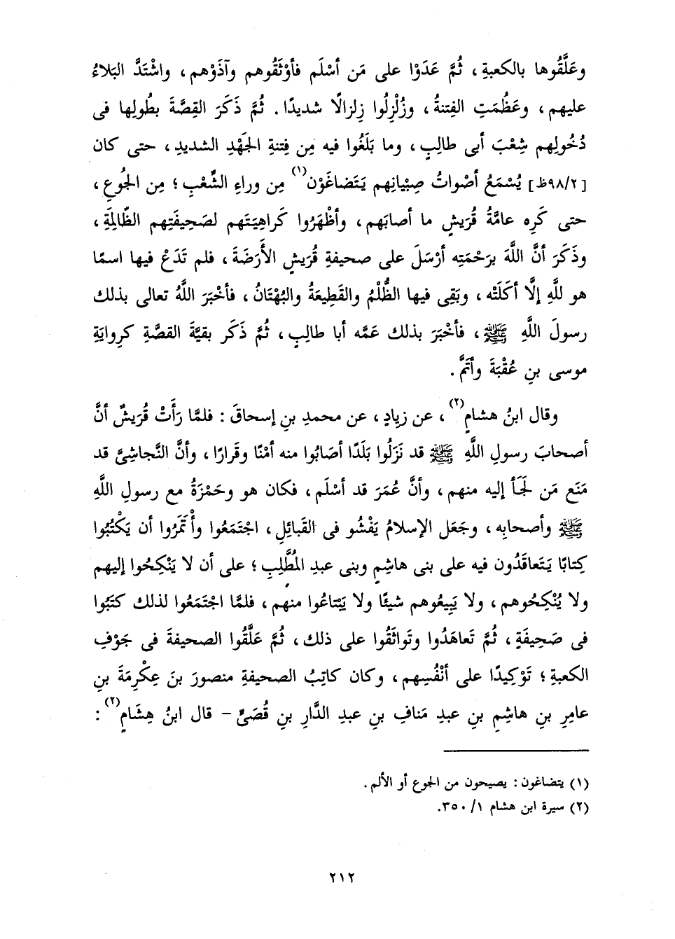 وَقَالَ ابْنُ هِشَامٍ عَنْ زِيَادٍ عَنْ مُحَمَّدِ بْنِ إِسْحَاقَ: فَلَمَّا رَأَتْ قُرَيْشٌ أَنَّ أَصْحَابَ رَسُولِ اللَّهِ - صَلَّى اللَّهُ عَلَيْهِ وَسَلَّمَ - قَدْ نَزَلُوا بَلَدًا أَصَابُوا مِنْهُ أَمْنًا وَقَرَارًا، وَأَنَّ النَّجَاشِيَّ قَدْ مَنَعَ مَنْ لَجَأَ إِلَيْهِ مِنْهُمْ، وَأَنَّ عُمَرَ قَدْ أَسْلَمَ، فَكَانَ هُوَ وَحَمْزَةُ مَعَ رَسُولِ اللَّهِ - صَلَّى اللَّهُ عَلَيْهِ وَسَلَّمَ - وَأَصْحَابِهِ، وَجَعَلَ الْإِسْلَامُ يَفْشُو فِي الْقَبَائِلِ، فَاجْتَمَعُوا وَأْتَمَرُوا أَنْ يَكْتُبُوا كِتَابًا يَتَعَاقَدُونَ فِيهِ عَلَى بَنِي هَاشِمٍ وَبَنِي عَبْدِ الْمُطَّلِبِ، عَلَى أَنْ لَا يَنْكِحُوا إِلَيْهِمْ وَلَا يُنْكِحُوهُمْ، وَلَا يَبِيعُوهُمْ شَيْئًا وَلَا يَبْتَاعُوا مِنْهُمْ، فَلَمَّا اجْتَمَعُوا لِذَلِكَ كَتَبُوا فِي صَحِيفَةٍ، ثُمَّ تَعَاهَدُوا وَتَوَاثَقُوا عَلَى ذَلِكَ، ثُمَّ عَلَّقُوا الصَّحِيفَةَ فِي جَوْفِ الْكَعْبَةِ ; تَوْكِيدًا عَلَى أَنْفُسِهِمْ، وَكَانَ كَاتِبُ الصَّحِيفَةِ مَنْصُورَ بْنَ عِكْرِمَةَ بْنِ عَامِرِ بْنِ هَاشِمِ بْنِ عَبْدِ مَنَافِ بْنِ عَبْدِ الدَّارِ بْنِ قُصَيٍّ قَالَ ابْنُ هِشَامٍ: