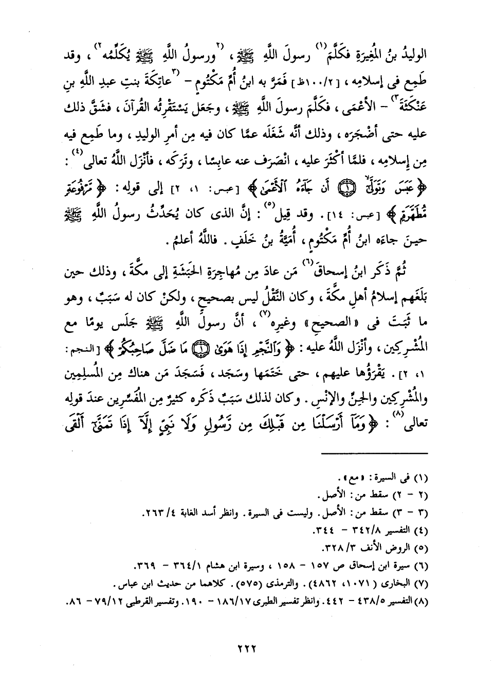 الْوَلِيدُ بْنُ الْمُغِيرَةِ فَكَلَّمَ رَسُولَ اللَّهِ - صَلَّى اللَّهُ عَلَيْهِ وَسَلَّمَ - وَرَسُولُ اللَّهِ - صَلَّى اللَّهُ عَلَيْهِ وَسَلَّمَ - يُكَلِّمُهُ، وَقَدْ طَمِعَ فِي إِسْلَامِهِ، فَمَرَّ بِهِ ابْنُ أُمِّ مَكْتُومٍ عَاتِكَةَ بِنْتِ عَبْدِ اللَّهِ بْنِ عَنْكَثَةَ الْأَعْمَى، فَكَلَّمَ رَسُولَ اللَّهِ - صَلَّى اللَّهُ عَلَيْهِ وَسَلَّمَ - وَجَعَلَ يَسْتَقْرِئُهُ الْقُرْآنَ، فَشَقَّ ذَلِكَ عَلَيْهِ حَتَّى أَضْجَرَهُ، وَذَلِكَ أَنَّهُ شَغَلَهُ عَمَّا كَانَ فِيهِ مِنْ أَمْرِ الْوَلِيدِ وَمَا طَمِعَ فِيهِ مِنْ إِسْلَامِهِ، فَلَمَّا أَكْثَرَ عَلَيْهِ انْصَرَفَ عَنْهُ عَابِسًا، وَتَرَكَهُ، فَأَنْزَلَ اللَّهُ تَعَالَى: {عَبَسَ وَتَوَلَّى أَنْ جَاءَهُ الْأَعْمَى} [عبس: 1] » [عَبَسَ: 1، 2] إِلَى قَوْلِهِ {مَرْفُوعَةٍ مُطَهَّرَةٍ} [عبس: 14] وَقَدْ قِيلَ: إِنَّ الَّذِي كَانَ يُحَدِّثُ رَسُولَ اللَّهِ - صَلَّى اللَّهُ عَلَيْهِ وَسَلَّمَ - حِينَ جَاءَهُ ابْنُ أُمِّ مَكْتُومٍ أُمَيَّةُ بْنُ خَلَفٍ. فَاللَّهُ أَعْلَمُ.