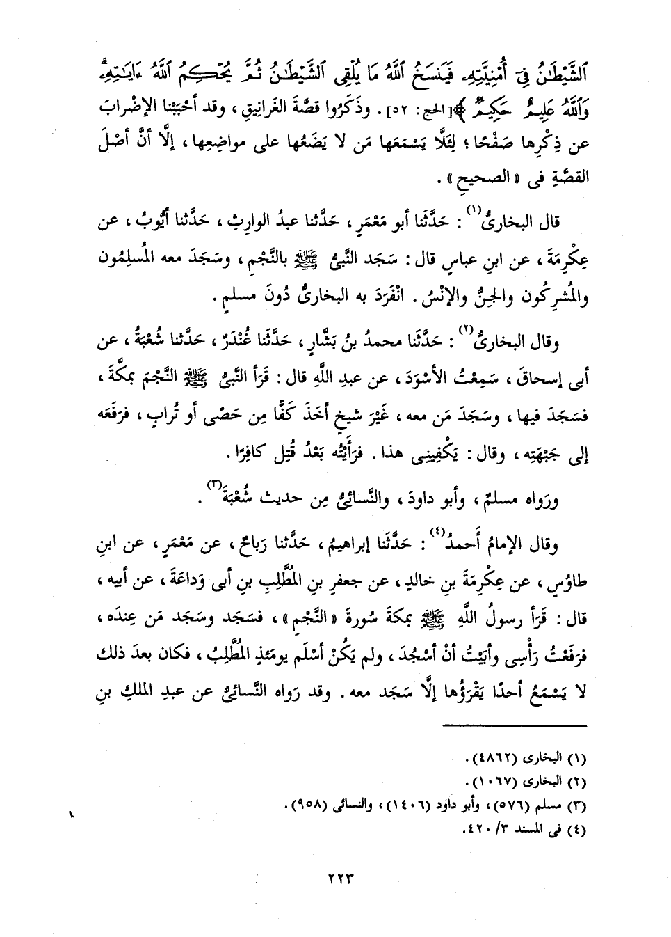 {وَمَا أَرْسَلْنَا مِنْ قَبْلِكَ مِنْ رَسُولٍ وَلَا نَبِيٍّ إِلَّا إِذَا تَمَنَّى أَلْقَى الشَّيْطَانُ فِي أُمْنِيَّتِهِ فَيَنْسَخُ اللَّهُ مَا يُلْقِي الشَّيْطَانُ ثُمَّ يُحْكِمُ اللَّهُ آيَاتِهِ وَاللَّهُ عَلِيمٌ حَكِيمٌ} [الحج: 52] وَذَكَرُوا قِصَّةَ الْغَرَانِيقِ، وَقَدْ أَحْبَبْنَا الْإِضْرَابَ عَنْ ذِكْرِهَا صَفْحًا ; لِئَلَّا يَسْمَعَهَا مَنْ لَا يَضَعُهَا عَلَى مَوَاضِعِهَا، إِلَّا أَنَّ أَصْلَ الْقِصَّةِ فِي " الصَّحِيحِ ".