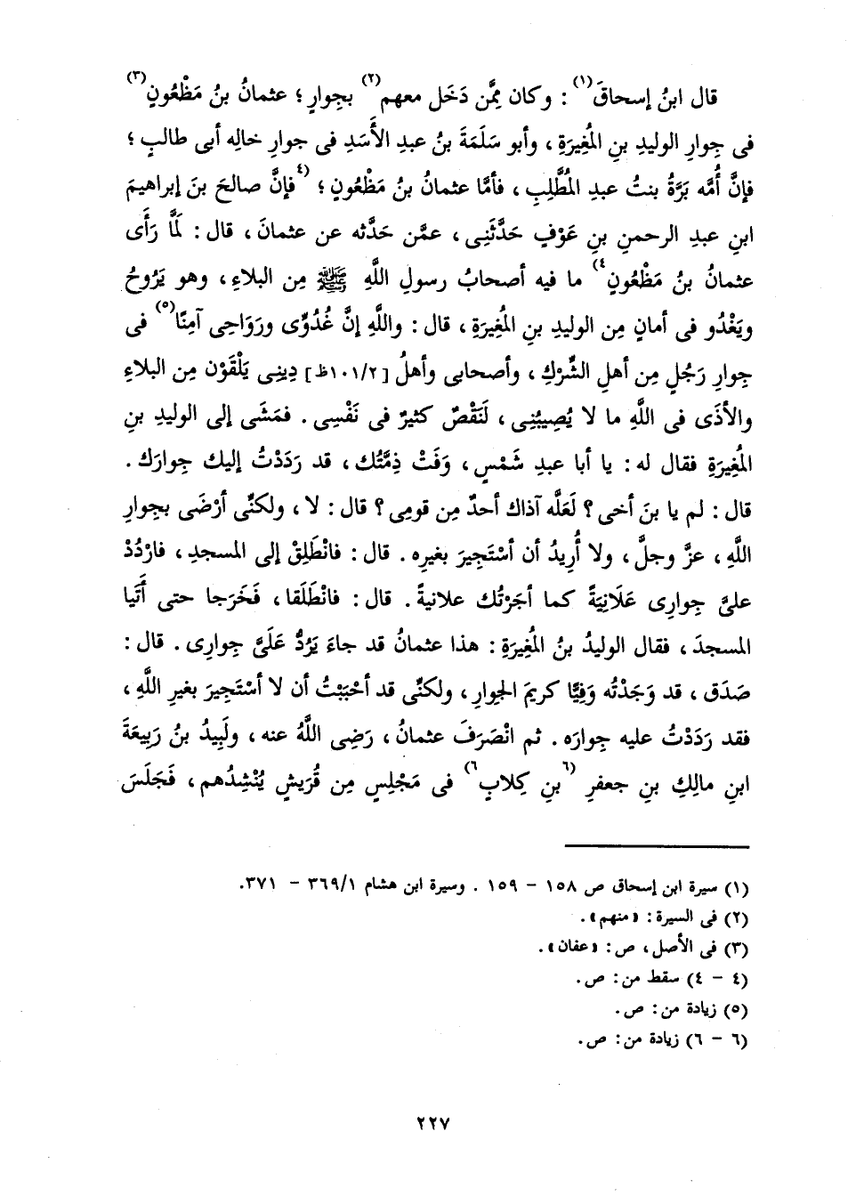 قَالَ ابْنُ إِسْحَاقَ: وَكَانَ مِمَّنْ دَخَلَ مَعَهُمْ بِجِوَارِ ; عُثْمَانَ بْنُ مَظْعُونٍ فِي جِوَارِ الْوَلِيدِ بْنِ الْمُغِيرَةِ وَأَبُو سَلَمَةَ بْنُ عَبْدِ الْأَسَدِ فِي جِوَارِ خَالِهِ أَبِي طَالِبٍ ; فَإِنَّ أُمَّهُ بَرَّةُ بِنْتُ عَبْدِ الْمُطَّلِبِ، فَأَمَّا عُثْمَانُ بْنُ مَظْعُونٍ فَإِنَّ صَالِحَ بْنَ إِبْرَاهِيمَ بْنِ عَبْدِ الرَّحْمَنِ بْنِ عَوْفٍ حَدَّثَنِي، عَمَّنْ حَدَّثَهُ عَنْ عُثْمَانَ قَالَ: لَمَّا رَأَى عُثْمَانُ بْنُ مَظْعُونٍ مَا فِيهِ أَصْحَابُ رَسُولِ اللَّهِ - صَلَّى اللَّهُ عَلَيْهِ وَسَلَّمَ - مِنَ الْبَلَاءِ، وَهُوَ يَرُوحُ وَيَغْدُو فِي أَمَانٍ مِنَ الْوَلِيدِ بْنِ الْمُغِيرَةِ قَالَ: وَاللَّهِ إِنَّ غُدُوِّي وَرَوَاحِي آمِنًا فِي جِوَارِ رَجُلٍ مِنْ أَهْلِ الشِّرْكِ، وَأَصْحَابِي وَأَهْلُ دِينِي يَلْقَوْنَ مِنَ الْبَلَاءِ وَالْأَذَى فِي اللَّهِ مَا لَا يُصِيبُنِي، لَنَقْصٌ كَثِيرٌ فِي نَفْسِي. فَمَشَى إِلَى الْوَلِيدِ بْنِ الْمُغِيرَةِ فَقَالَ لَهُ: يَا أَبَا عَبْدِ شَمْسٍ وَفَتْ ذِمَّتُكَ، قَدْ رَدَدْتُ إِلَيْكَ جِوَارَكَ. قَالَ: لِمَ يَا بْنَ أَخِي؟ لَعَلَّهُ آذَاكَ أَحَدٌ مِنْ قَوْمِي؟ قَالَ: لَا، وَلَكِنِّي أَرْضَى بِجِوَارِ اللَّهِ عَزَّ وَجَلَّ، وَلَا أُرِيدُ أَنْ أَسْتَجِيرَ بِغَيْرِهِ. قَالَ: فَانْطَلِقْ إِلَى الْمَسْجِدِ، فَارْدُدْ عَلَيَّ جِوَارِي عَلَانِيَةً كَمَا أَجَرْتُكَ عَلَانِيَةً. قَالَ: فَانْطَلَقَا، فَخَرَجَا حَتَّى أَتَيَا الْمَسْجِدَ، فَقَالَ الْوَلِيدُ بْنُ الْمُغِيرَةِ: هَذَا عُثْمَانُ قَدْ جَاءَ يَرُدُّ عَلَيَّ جِوَارِي. قَالَ: صَدَقَ، قَدْ وَجَدْتُهُ وَفِيًّا كَرِيمَ الْجِوَارِ، وَلَكِنِّي قَدْ أَحْبَبْتُ أَنْ لَا أَسْتَجِيرَ بِغَيْرِ اللَّهِ، فَقَدْ رَدَدْتُ عَلَيْهِ جِوَارَهُ. ثُمَّ انْصَرَفَ عُثْمَانُ رَضِيَ اللَّهُ عَنْهُ وَلَبِيدُ بْنُ رَبِيعَةَ بْنِ مَالِكِ بْنِ جَعْفَرِ بْنِ كِلَابٍ فِي مَجْلِسٍ مِنْ قُرَيْشٍ يَنْشُدُهُمْ، فَجَلَسَ