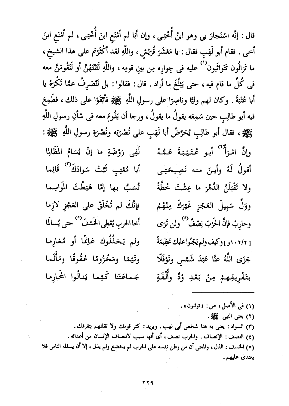 قَالَ: إِنَّهُ اسْتَجَارَ بِي وَهُوَ ابْنُ أُخْتِي، وَإِنْ أَنَا لَمْ أَمْنَعِ ابْنَ أُخْتِي، لَمْ أَمْنَعِ ابْنَ أَخِي، فَقَامَ أَبُو لَهَبٍ فَقَالَ: يَا مَعْشَرَ قُرَيْشٍ، وَاللَّهِ لَقَدْ أَكْثَرْتُمْ عَلَى هَذَا الشَّيْخِ، مَا تَزَالُونَ تَتَوَاثَبُونَ عَلَيْهِ فِي جِوَارِهِ مِنْ بَيْنِ قَوْمِهِ، وَاللَّهِ لَتَنْتَهُنَّ أَوْ لَنَقُومَنَّ مَعَهُ فِي كُلِّ مَا قَامَ فِيهِ، حَتَّى يَبْلُغَ مَا أَرَادَ. قَالَ: فَقَالُوا: بَلْ نَنْصَرِفُ عَمَّا تَكْرَهُ يَا أَبَا عُتْبَةَ. وَكَانَ لَهُمْ وَلِيًّا وَنَاصِرًا عَلَى رَسُولِ اللَّهِ - صَلَّى اللَّهُ عَلَيْهِ وَسَلَّمَ - فَأَبْقَوْا عَلَى ذَلِكَ، فَطَمِعَ فِيهِ أَبُو طَالِبٍ حِينَ سَمِعَهُ يَقُولُ مَا يَقُولُ، وَرَجَا أَنْ يَقُومَ مَعَهُ فِي شَأْنِ رَسُولِ اللَّهِ - صَلَّى اللَّهُ عَلَيْهِ وَسَلَّمَ - فَقَالَ أَبُو طَالِبٍ يُحَرِّضُ أَبَا لَهَبٍ عَلَى نُصْرَتِهِ وَنُصْرَةِ رَسُولِ اللَّهِ - صَلَّى اللَّهُ عَلَيْهِ وَسَلَّمَ -: