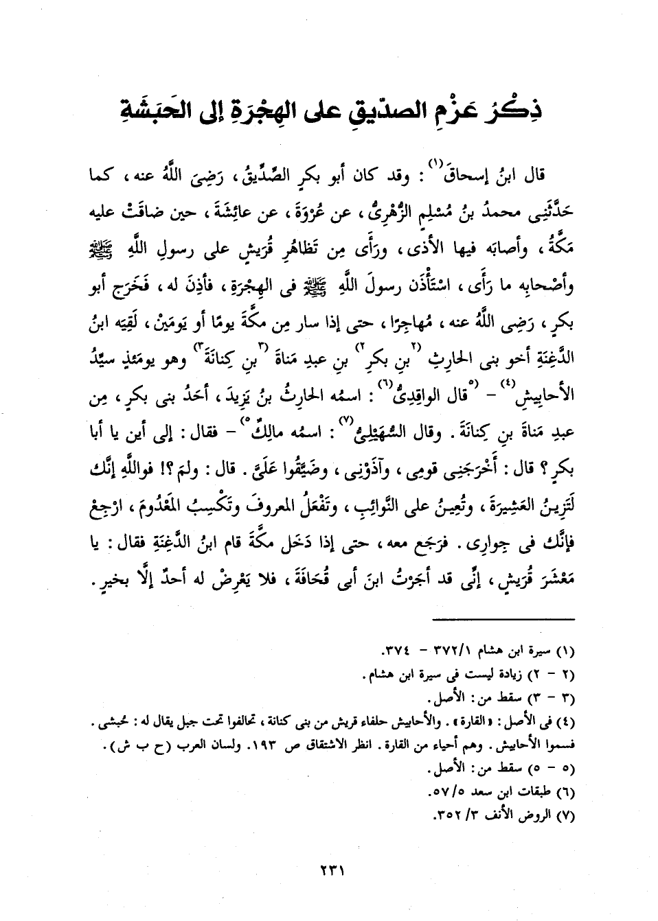 ِ قَالَ ابْنُ إِسْحَاقَ: وَقَدْ كَانَ أَبُو بَكْرٍ الصِّدِّيقُ رَضِيَ اللَّهُ عَنْهُ كَمَا حَدَّثَنِي مُحَمَّدُ بْنُ مُسْلِمٍ الزُّهْرِيُّ عَنْ عُرْوَةَ عَنْ عَائِشَةَ، حِينَ ضَاقَتْ عَلَيْهِ مَكَّةُ، وَأَصَابَهُ فِيهَا الْأَذَى، وَرَأَى مِنْ تَظَاهُرِ قُرَيْشٍ عَلَى رَسُولِ اللَّهِ - صَلَّى اللَّهُ عَلَيْهِ وَسَلَّمَ - وَأَصْحَابِهِ مَا رَأَى، اسْتَأْذَنَ رَسُولَ اللَّهِ - صَلَّى اللَّهُ عَلَيْهِ وَسَلَّمَ - فِي الْهِجْرَةِ، فَأَذِنَ لَهُ، فَخَرَجَ أَبُو بَكْرٍ رَضِيَ اللَّهُ عَنْهُ مُهَاجِرًا، حَتَّى إِذَا سَارَ مِنْ مَكَّةَ يَوْمًا أَوْ يَوْمَيْنِ، لَقِيَهُ ابْنُ الدَّغِنَةِ أَخُو بَنِي الْحَارِثِ بْنِ بَكْرِ بْنِ عَبْدِ مَنَاةَ بْنِ كِنَانَةَ، وَهُوَ يَوْمَئِذٍ سَيِّدُ الْأَحَابِيشِ قَالَ الْوَاقِدِيُّ: اسْمُهُ الْحَارِثُ بْنُ يَزِيدَ أَحَدُ بَنِي بَكْرٍ مِنْ عَبْدِ مَنَاةَ بْنِ كِنَانَةَ. وَقَالَ السُّهَيْلِيُّ: اسْمُهُ مَالِكٌ فَقَالَ: إِلَى أَيْنَ يَا أَبَا بَكْرٍ؟ قَالَ: أَخْرَجَنِي قَوْمِي، وَآذَوْنِي، وَضَيَّقُوا عَلَيَّ. قَالَ: وَلِمَ؟ فَوَاللَّهِ إِنَّكَ لَتَزِينُ الْعَشِيرَةَ، وَتُعِينُ عَلَى النَّوَائِبِ، وَتَفْعَلُ الْمَعْرُوفَ وَتُكْسِبُ الْمَعْدُومَ، ارْجِعْ فَإِنَّكَ فِي جِوَارِي. فَرَجَعَ مَعَهُ حَتَّى إِذَا دَخَلَ مَكَّةَ قَامَ ابْنُ الدَّغِنَةِ فَقَالَ: يَا مَعْشَرَ قُرَيْشٍ، إِنِّي قَدْ أَجَرْتُ ابْنَ أَبِي قُحَافَةَ فَلَا يَعْرِضْ لَهُ أَحَدٌ إِلَّا بِخَيْرٍ.