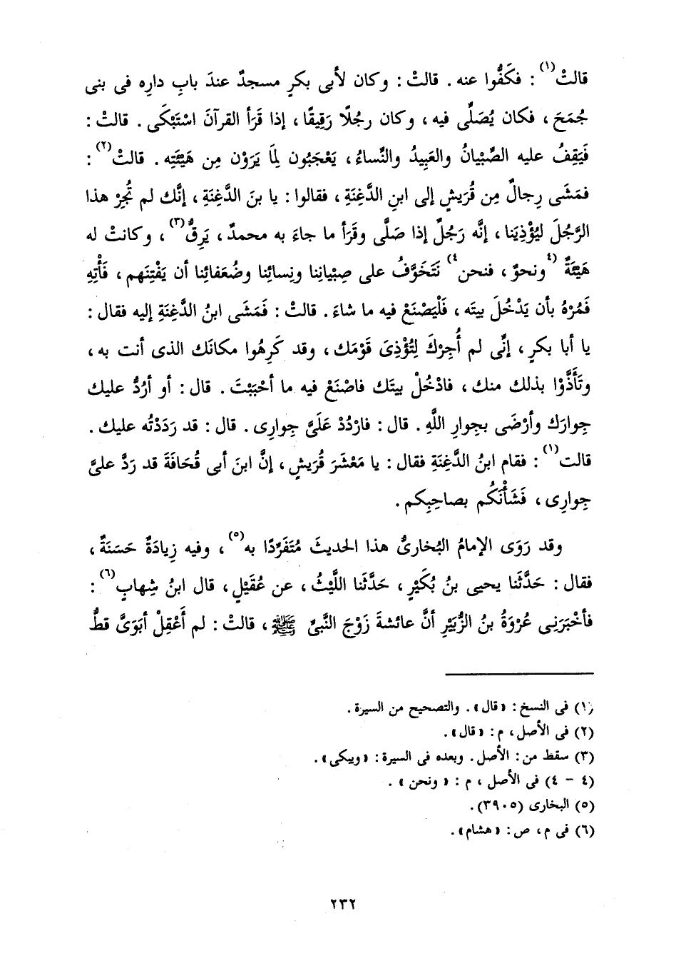 قَالَتْ: فَكَفُّوا عَنْهُ. قَالَتْ: وَكَانَ لِأَبِي بَكْرٍ مَسْجِدٌ عِنْدَ بَابِ دَارِهِ فِي بَنِي جُمَحَ، فَكَانَ يُصَلِّي فِيهِ، وَكَانَ رَجُلًا رَقِيقًا، إِذَا قَرَأَ الْقُرْآنَ اسْتَبْكَى. قَالَتْ: فَيَقِفُ عَلَيْهِ الصِّبْيَانُ وَالْعَبِيدُ وَالنِّسَاءُ، يَعْجَبُونَ لِمَا يَرَوْنَ مِنْ هَيْئَتِهِ. قَالَتْ: فَمَشَى رِجَالٌ مِنْ قُرَيْشٍ إِلَى ابْنِ الدَّغِنَّةِ فَقَالُوا: يَا بْنَ الدَّغِنَةِ إِنَّكَ لَمْ تُجِرْ هَذَا الرَّجُلَ لِيُؤْذِيَنَا، إِنَّهُ رَجُلٌ إِذَا صَلَّى وَقَرَأَ مَا جَاءَ بِهِ مُحَمَّدٌ يَرِقُّ، وَكَانَتْ لَهُ هَيْئَةٌ وَنَحْوٌ، فَنَحْنُ نَتَخَوَّفُ عَلَى صِبْيَانِنَا وَنِسَائِنَا وَضُعَفَائِنَا أَنْ يَفْتِنَهُمْ، فَأْتِهِ فَمُرْهُ بِأَنْ يَدْخُلَ بَيْتَهُ، فَلْيَصْنَعْ فِيهِ مَا شَاءَ. قَالَتْ: فَمَشَى ابْنُ الدَّغِنَةِ إِلَيْهِ، فَقَالَ: يَا أَبَا بَكْرٍ إِنِّي لَمْ أُجِرْكَ لِتُؤْذِيَ قَوْمَكَ، وَقَدْ كَرِهُوا مَكَانَكَ الَّذِي أَنْتَ بِهِ، وَتَأَذَّوْا بِذَلِكَ مِنْكَ، فَادْخُلْ بَيْتَكَ فَاصْنَعْ فِيهِ مَا أَحْبَبْتَ. قَالَ: أَوْ أَرُدُّ عَلَيْكَ جِوَارَكَ وَأَرْضَى بِجِوَارِ اللَّهِ. قَالَ: فَارْدُدْ عَلَيَّ جِوَارِي. قَالَ: قَدْ رَدَدْتُهُ عَلَيْكَ. قَالَتْ: فَقَامَ ابْنُ الدَّغِنَةِ فَقَالَ: يَا مَعْشَرَ قُرَيْشٍ إِنَّ ابْنَ أَبِي قُحَافَةَ قَدْ رَدَّ عَلَيَّ جِوَارِي، فَشَأْنُكُمْ بِصَاحِبِكُمْ.