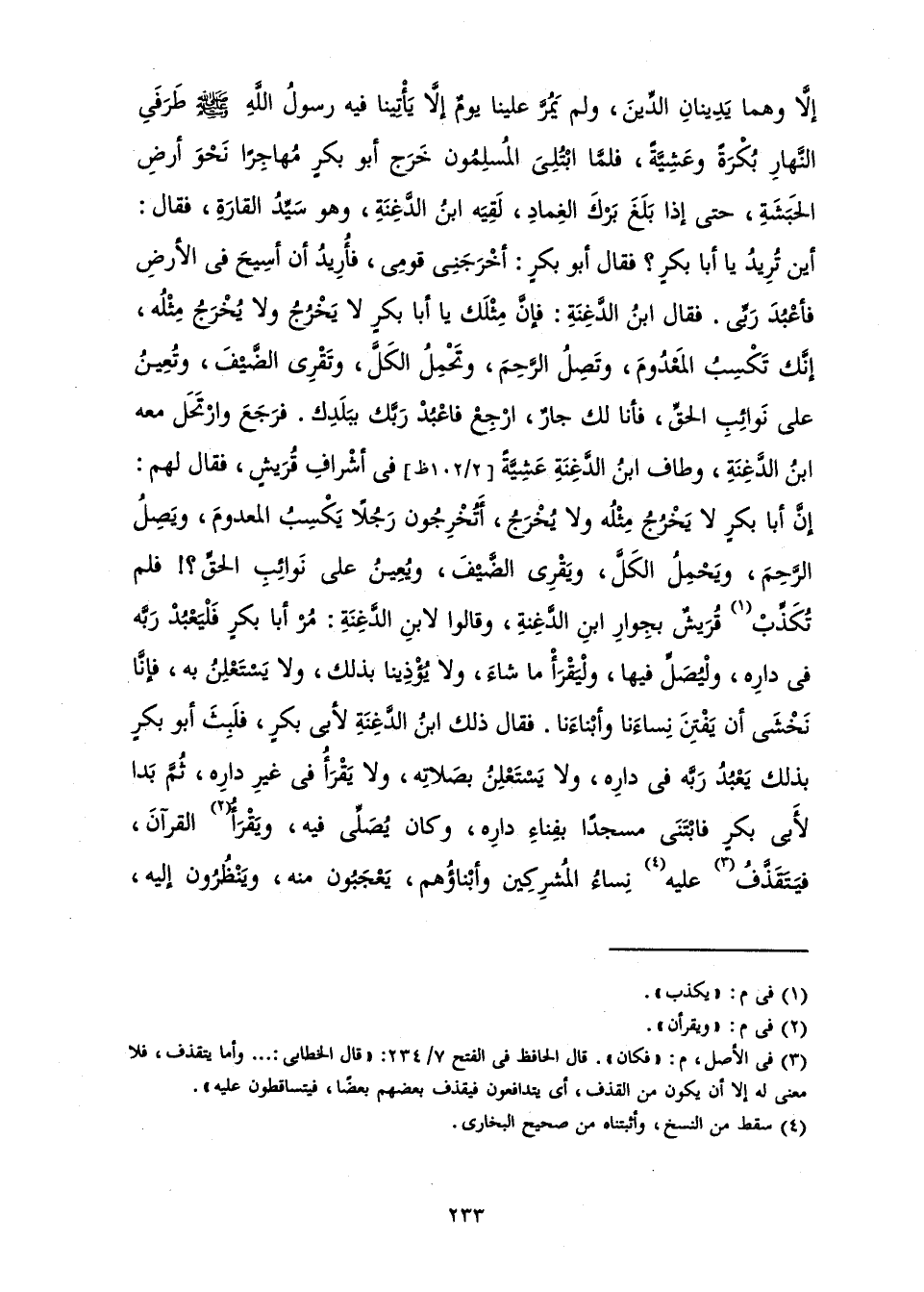 إِلَّا وَهُمَا يَدِينَانِ الدِّينَ، وَلَمْ يَمُرَّ عَلَيْنَا يَوْمٌ إِلَّا يَأْتِينَا فِيهِ رَسُولُ اللَّهِ - صَلَّى اللَّهُ عَلَيْهِ وَسَلَّمَ - طَرَفَيِ النَّهَارِ بِكُرَةً وَعَشِيَّةً، فَلَمَّا ابْتُلِيَ الْمُسْلِمُونَ خَرَجَ أَبُو بَكْرٍ مُهَاجِرًا نَحْوَ أَرْضِ الْحَبَشَةِ، حَتَّى إِذَا بَلَغَ بَرْكَ الْغِمَادِ لَقِيَهُ ابْنُ الدَّغِنَةِ وَهُوَ سَيِّدُ الْقَارَةِ، فَقَالَ أَيْنَ تُرِيدُ يَا أَبَا بَكْرٍ؟ فَقَالَ أَبُو بَكْرٍ: أَخْرَجَنِي قَوْمِي، فَأُرِيدُ أَنْ أَسِيحَ فِي الْأَرْضِ فَأَعْبُدَ رَبِّي. فَقَالَ ابْنُ الدَّغِنَةِ: فَإِنَّ مِثْلَكَ يَا أَبَا بَكْرٍ لَا يَخْرُجُ وَلَا يُخْرَجُ مِثْلُهُ، إِنَّكَ تَكْسِبُ الْمَعْدُومَ، وَتَصِلُ الرَّحِمَ، وَتَحْمِلُ الْكَلَّ، وَتَقْرِي الضَّيْفَ، وَتُعِينُ عَلَى نَوَائِبِ الْحَقِّ، فَأَنَا لَكَ جَارٌ، ارْجِعْ فَاعْبُدْ رَبَّكَ بِبَلَدِكَ. فَرَجَعَ وَارْتَحَلَ مَعَهُ ابْنُ الدَّغِنَةِ وَطَافَ ابْنُ الدَّغِنَةِ عَشِيَّةً فِي أَشْرَافِ قُرَيْشٍ، فَقَالَ لَهُمْ: إِنَّ أَبَا بَكْرٍ لَا يُخْرَجُ مِثْلُهُ، وَلَا يَخْرُجُ، أَتُخْرِجُونَ رَجُلًا يَكْسِبُ الْمَعْدُومَ، وَيَصِلُ الرَّحِمَ، وَيَحْمِلُ الْكَلَّ، وَيَقْرِي الضَّيْفَ، وَيُعِينُ عَلَى نَوَائِبِ الْحَقِّ؟ ! فَلَمْ تُكَذِّبْ قُرَيْشٌ بِجِوَارِ ابْنِ الدَّغِنَةِ وَقَالُوا لِابْنِ الدَّغِنَةِ: مُرْ أَبَا بَكْرٍ فَلْيَعْبُدْ رَبَّهُ فِي دَارِهِ، وَلْيُصَلِّ فِيهَا وَلْيَقْرَأْ مَا شَاءَ، وَلَا يُؤْذِينَا بِذَلِكَ، وَلَا يَسْتَعْلِنُ بِهِ، فَإِنَّا نَخْشَى أَنْ يَفْتِنَ نِسَاءَنَا وَأَبْنَاءَنَا. فَقَالَ ذَلِكَ ابْنُ الدَّغِنَةِ لِأَبِي بَكْرٍ فَلَبِثَ أَبُو بَكْرٍ بِذَلِكَ يَعْبُدُ رَبَّهُ فِي دَارِهِ، وَلَا يَسْتَعْلِنُ بِصَلَاتِهِ، وَلَا يَقْرَأُ فِي غَيْرِ دَارِهِ، ثُمَّ بَدَا لِأَبِي بَكْرٍ فَابْتَنَى مَسْجِدًا بِفِنَاءِ دَارِهِ، وَكَانَ يُصَلِّي فِيهِ، وَيَقْرَأُ الْقُرْآنَ، فَيَتَقَذَّفُ عَلَيْهِ نِسَاءُ الْمُشْرِكِينَ وَأَبْنَاؤُهُمْ، يَعْجَبُونَ مِنْهُ وَيَنْظُرُونَ إِلَيْهِ،