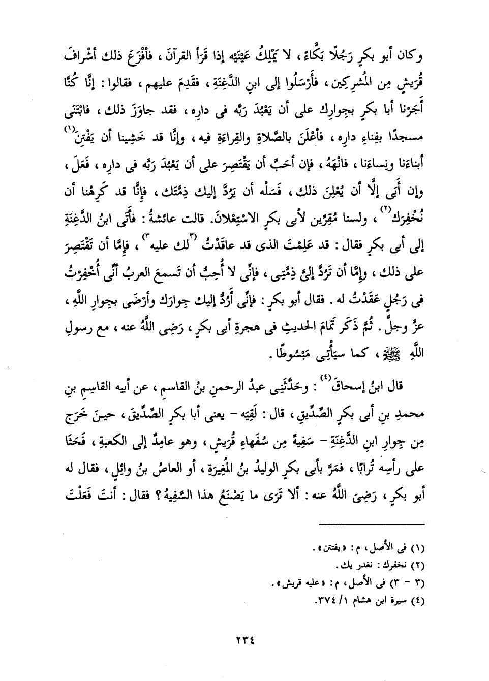 وَكَانَ أَبُو بَكْرٍ رَجُلًا بَكَّاءً، لَا يَمْلِكُ عَيْنَيْهِ إِذَا قَرَأَ الْقُرْآنَ، فَأَفْزَعَ ذَلِكَ أَشْرَافَ قُرَيْشٍ مِنَ الْمُشْرِكِينَ، فَأَرْسَلُوا إِلَى ابْنِ الدَّغِنَةِ فَقَدِمَ عَلَيْهِمْ، فَقَالُوا: إِنَّا كُنَّا أَجَرْنَا أَبَا بَكْرٍ بِجِوَارِكَ عَلَى أَنْ يَعْبُدَ رَبَّهُ فِي دَارِهِ، فَقَدْ جَاوَزَ ذَلِكَ، فَابْتَنَى مَسْجِدًا بِفِنَاءِ دَارِهِ، فَأَعْلَنَ فِي الصَّلَاةِ وَالْقِرَاءَةِ فِيهِ، وَإِنَّا قَدْ خَشِينَا أَنْ يَفْتَتِنَ أَبْنَاؤُنَا وَنِسَاؤُنَا، فَانْهَهُ، فَإِنْ أَحَبَّ أَنْ يَقْتَصِرَ عَلَى أَنْ يَعْبُدَ رَبَّهُ فِي دَارِهِ، فَعَلَ، وَإِنْ أَبَى إِلَّا أَنْ يُعْلِنَ ذَلِكَ، فَسَلْهُ أَنْ يَرُدَّ إِلَيْكَ ذِمَّتَكَ، فَإِنَّا قَدْ كَرِهْنَا أَنْ نُخْفِرَكَ وَلَسْنَا مُقِرِّينَ لِأَبِي بَكْرٍ الِاسْتِعْلَانَ. قَالَتْ عَائِشَةُ: فَأَتَى ابْنُ الدَّغِنَةِ إِلَى أَبِي بَكْرٍ فَقَالَ: قَدْ عَلِمْتَ الَّذِي قَدْ عَاقَدْتُ لَكَ عَلَيْهِ. فَإِمَّا أَنْ تَقْتَصِرَ عَلَى ذَلِكَ، وَإِمَّا أَنْ تَرُدَّ إِلَيَّ ذِمَّتِي، فَإِنِّي لَا أُحِبُّ أَنْ تَسْمَعَ الْعَرَبُ أَنِّي أُخْفِرْتُ فِي رَجُلٍ عَقَدْتُ لَهُ. فَقَالَ أَبُو بَكْرٍ: فَإِنِّي أَرُدُّ إِلَيْكَ جِوَارَكَ، وَأَرْضَى بِجِوَارِ اللَّهِ عَزَّ وَجَلَّ. ثُمَّ ذَكَرَ تَمَامَ الْحَدِيثِ فِي هِجْرَةِ أَبِي بَكْرٍ رَضِيَ اللَّهُ عَنْهُ مَعَ رَسُولِ اللَّهِ - صَلَّى اللَّهُ عَلَيْهِ وَسَلَّمَ - كَمَا سَيَأْتِي مَبْسُوطًا.
