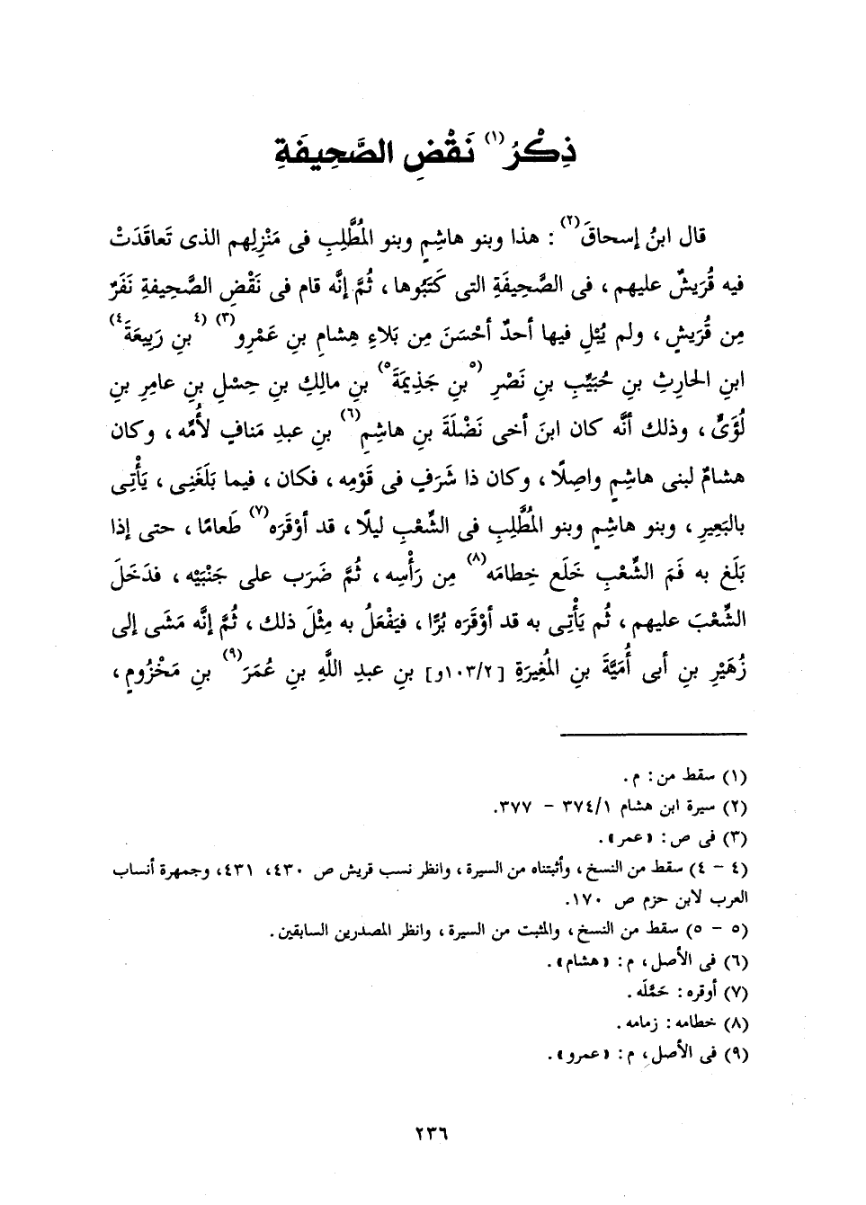 قَالَ ابْنُ إِسْحَاقَ: هَذَا وَبَنُو هَاشِمٍ وَبَنُو الْمُطَّلِبِ فِي مَنْزِلِهِمُ الَّذِي تَعَاقَدَتْ فِيهِ قُرَيْشٌ عَلَيْهِمْ، فِي الصَّحِيفَةِ الَّتِي كَتَبُوهَا، ثُمَّ إِنَّهُ قَامَ فِي نَقْضِ الصَّحِيفَةِ نَفَرٌ مِنْ قُرَيْشٍ، وَلَمْ يَبْلُ فِيهَا أَحَدٌ أَحْسَنَ مِنْ بَلَاءِ هِشَامِ بْنِ عَمْرِو بْنِ رَبِيعَةَ بْنِ الْحَارِثِ بْنِ حَبِيبِ بْنِ نَصْرِ بْنِ جُزَيْمَةَ بْنِ مَالِكِ بْنِ حِسْلِ بْنِ عَامِرِ بْنِ لُؤَيٍّ وَذَلِكَ أَنَّهُ كَانَ ابْنَ أَخِي نَضْلَةَ بْنِ هَاشِمِ بْنِ عَبْدِ مَنَافٍ لِأُمِّهِ، وَكَانَ هِشَامٌ لِبَنِي هَاشِمٍ وَاصِلًا، وَكَانَ ذَا شَرَفٍ فِي قَوْمِهِ، فَكَانَ فِيمَا بَلَغَنِي يَأْتِي بِالْبَعِيرِ، وَبَنُو هَاشِمٍ وَبَنُو الْمُطَّلِبِ فِي الشِّعْبِ لَيْلًا، قَدْ أَوْقَرَهُ طَعَامًا، حَتَّى إِذَا بَلَغَ بِهِ فَمَ الشِّعْبِ، خَلَعَ خِطَامَهُ مِنْ رَأْسِهِ، ثُمَّ ضَرَبَ عَلَى جَنْبَيْهِ، فَدَخَلَ الشِّعْبَ عَلَيْهِمْ، ثُمَّ يَأْتِي بِهِ قَدْ أَوْقَرَهُ بُرًّا، فَيَفْعَلُ بِهِ مِثْلَ ذَلِكَ، ثُمَّ إِنَّهُ مَشَى إِلَى زُهَيْرِ بْنِ أَبِي أُمَيَّةَ بْنِ الْمُغِيرَةِ بْنِ عَبْدِ اللَّهِ بْنِ عُمَرَ بْنِ مَخْزُومٍ