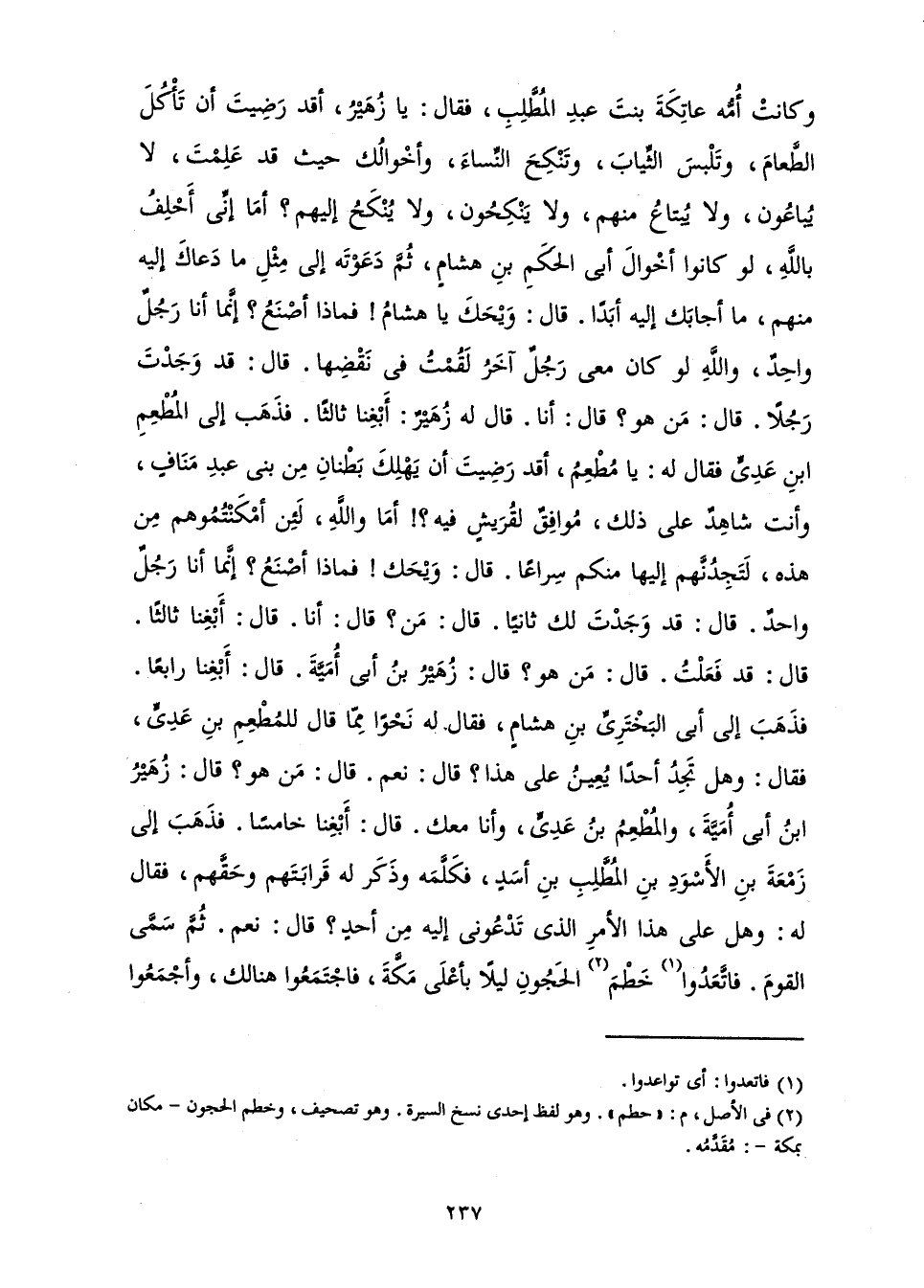 وَكَانَتْ أُمُّهُ عَاتِكَةَ بِنْتَ عَبْدِ الْمُطَّلِبِ، فَقَالَ: يَا زُهَيْرُ أَقَدْ رَضِيتَ أَنْ تَأْكُلَ الطَّعَامَ، وَتَلْبَسَ الثِّيَابَ، وَتَنْكِحَ النِّسَاءَ، وَأَخْوَالُكَ حَيْثُ قَدْ عَلِمْتَ لَا يُبَاعُونَ وَلَا يُبْتَاعُ مِنْهُمْ، وَلَا يَنْكِحُونَ وَلَا يُنْكَحُ إِلَيْهِمْ؟ أَمَا إِنِّي أَحْلِفُ بِاللَّهِ لَوْ كَانُوا أَخْوَالَ أَبِي الْحَكَمِ بْنِ هِشَامٍ ثُمَّ دَعَوْتَهُ إِلَى مِثْلِ مَا دَعَاكَ إِلَيْهِ مِنْهُمْ، مَا أَجَابَكَ إِلَيْهِ أَبَدًا. قَالَ: وَيْحَكَ يَا هِشَامُ! فَمَاذَا أَصْنَعُ؟ إِنَّمَا أَنَا رَجُلٌ وَاحِدٌ، وَاللَّهِ لَوْ كَانَ مَعِي رَجُلٌ آخَرُ لَقُمْتُ فِي نَقْضِهَا. قَالَ: قَدْ وَجَدْتَ رَجُلًا. قَالَ: مَنْ هُوَ؟ قَالَ: أَنَا. قَالَ لَهُ زُهَيْرٌ: أَبْغِنَا ثَالِثًا. فَذَهَبَ إِلَى الْمُطْعِمِ بْنِ عَدِيٍّ فَقَالَ لَهُ: يَا مُطْعِمُ أَقَدْ رَضِيتَ أَنْ يَهْلِكَ بَطْنَانِ مِنْ بَنِي عَبْدِ مَنَافٍ، وَأَنْتَ شَاهِدٌ عَلَى ذَلِكَ. مُوَافِقٌ لِقُرَيْشٍ فِيهِ؟ ! أَمَا وَاللَّهِ، لَئِنْ أَمْكَنْتُمُوهُمْ مِنْ هَذِهِ لَتَجِدُنَّهُمْ إِلَيْهَا مِنْكُمْ سِرَاعًا. قَالَ: وَيْحَكَ! فَمَاذَا أَصْنَعُ؟ إِنَّمَا أَنَا رَجُلٌ وَاحِدٌ. قَالَ: قَدْ وَجَدْتَ لَكَ ثَانِيًا. قَالَ: مَنْ؟ قَالَ: أَنَا. قَالَ: أَبْغِنَا ثَالِثًا. قَالَ: قَدْ فَعَلْتُ. قَالَ: مَنْ هُوَ؟ قَالَ: زُهَيْرُ بْنُ أَبِي أُمَيَّةَ. قَالَ: أَبْغِنَا رَابِعًا. فَذَهَبَ إِلَى أَبِي الْبَخْتَرِيِّ بْنِ هِشَامٍ فَقَالَ لَهُ نَحْوًا مِمَّا قَالَ لِلْمُطْعِمِ بْنِ عَدِيٍّ فَقَالَ: وَهَلْ تَجِدُ أَحَدًا يُعِينُ عَلَى هَذَا؟ قَالَ: نَعَمْ. قَالَ: مَنْ هُوَ؟ قَالَ: زُهَيْرُ بْنُ أَبِي أُمَيَّةَ وَالْمُطْعِمُ بْنُ عَدِيٍّ وَأَنَا مَعَكَ. قَالَ: أَبْغِنَا خَامِسًا. فَذَهَبَ إِلَى زَمْعَةَ بْنَ الْأَسْوَدِ بْنِ الْمُطَّلِبِ بْنِ أَسَدٍ. فَكَلَّمَهُ وَذَكَرَ لَهُ قَرَابَتَهُمْ وَحَقَّهُمْ، فَقَالَ لَهُ: وَهَلْ عَلَى هَذَا الْأَمْرِ الَّذِي تَدْعُونِي إِلَيْهِ مِنْ أَحَدٍ؟ قَالَ: نَعَمْ. ثُمَّ سَمَّى الْقَوْمَ. فَاتَّعَدُوا خَطْمَ الْحَجُونِ لَيْلًا بِأَعْلَى مَكَّةَ، فَاجْتَمَعُوا هُنَالِكَ، وَأَجْمَعُوا