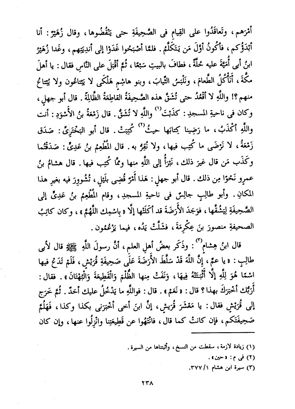 قَالَ ابْنُ هِشَامٍ: وَذَكَرَ بَعْضُ أَهْلِ الْعِلْمِ، أَنَّ رَسُولَ اللَّهِ - صَلَّى اللَّهُ عَلَيْهِ وَسَلَّمَ - قَالَ لِأَبِي طَالِبٍ: " «يَا عَمِّ، إِنَّ اللَّهَ قَدْ سَلَّطَ الْأَرَضَةَ عَلَى صَحِيفَةِ قُرَيْشٍ، فَلَمْ تَدَعْ فِيهَا اسْمًا هُوَ لِلَّهِ إِلَّا أَثْبَتَتْهُ فِيهَا، وَنَفَتْ مِنْهَا الظُّلْمَ وَالْقَطِيعَةَ وَالْبُهْتَانَ» ". فَقَالَ: أَرَبُّكَ أَخْبَرَكَ بِهَذَا؟ قَالَ: " نَعَمْ ". قَالَ: فَوَاللَّهِ مَا يَدْخُلُ عَلَيْكَ أَحَدٌ. ثُمَّ خَرَجَ إِلَى قُرَيْشٍ، فَقَالَ: يَا مَعْشَرَ قُرَيْشٍ! إِنَّ ابْنَ أَخِي أَخْبَرَنِي بِكَذَا وَكَذَا، فَهَلُمَّ صَحِيفَتَكُمْ فَإِنْ كَانَتْ كَمَا قَالَ، فَانْتَهُوا عَنْ قَطِيعَتِنَا، وَانْزِلُوا عَنْهَا. وَإِنْ كَانَ