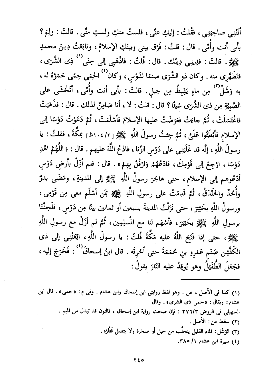 أَتَتْنِي صَاحِبَتِي، فَقُلْتُ: إِلَيْكِ عَنِّي، فَلَسْتُ مِنْكِ وَلَسْتَ مِنِّي. قَالَتْ: وَلِمَ؟ بِأَبِي أَنْتَ وَأُمِّي. قَالَ: قُلْتُ: فَرَّقَ بَيْنِي وَبَيْنَكِ الْإِسْلَامُ، وَتَابَعْتُ دِينَ مُحَمَّدٍ - صَلَّى اللَّهُ عَلَيْهِ وَسَلَّمَ -. قَالَتْ: فَدِينِي دِينُكَ. قَالَ: قُلْتُ: فَاذْهَبِي إِلَى حِنَى ذِي الشَّرَى، فَتَطَهَّرِي مِنْهُ. وَكَانَ ذُو الشَّرَى صَنَمًا لِدَوْسٍ، وَكَانَ الْحِمَى حِمَى حَمَوْهُ لَهُ، بِهِ وَشَلٌ مِنْ مَاءٍ يَهْبِطُ مِنْ جَبَلٍ. قَالَتْ: بِأَبِي أَنْتَ وَأُمِّي، أَتَخْشَى عَلَى الصَّبِيَّةِ مِنْ ذِي الشَّرَى شَيْئًا؟ قَالَ: قُلْتُ: لَا، أَنَا ضَامِنٌ لِذَلِكَ. قَالَ: فَذَهَبَتْ فَاغْتَسَلَتْ، ثُمَّ جَاءَتْ فَعَرَضْتُ عَلَيْهَا الْإِسْلَامَ فَأَسْلَمَتْ، ثُمَّ دَعَوْتُ دَوْسًا إِلَى الْإِسْلَامِ، فَأَبْطَؤُوا عَلَيَّ، ثُمَّ جِئْتُ رَسُولَ اللَّهِ - صَلَّى اللَّهُ عَلَيْهِ وَسَلَّمَ - بِمَكَّةَ، فَقُلْتُ: يَا رَسُولَ اللَّهِ، إِنَّهُ قَدْ غَلَبَنِي عَلَى دَوْسٍ الزِّنَا فَادْعُ اللَّهَ عَلَيْهِمْ. قَالَ: " «اللَّهُمَّ اهْدِ دَوْسًا، ارْجِعْ إِلَى قَوْمِكَ فَادْعُهُمْ وَارْفُقْ بِهِمْ» ". قَالَ: فَلَمْ أَزَلْ بِأَرْضِ دَوْسٍ أَدْعُوهُمْ إِلَى الْإِسْلَامِ، حَتَّى هَاجَرَ رَسُولُ اللَّهِ - صَلَّى اللَّهُ عَلَيْهِ وَسَلَّمَ - إِلَى الْمَدِينَةِ، وَمَضَى بَدْرٌ وَأُحُدٌ وَالْخَنْدَقُ، ثُمَّ قَدِمْتُ عَلَى رَسُولِ اللَّهِ - صَلَّى اللَّهُ عَلَيْهِ وَسَلَّمَ - بِمَنْ أَسْلَمَ مَعِي مِنْ قَوْمِي، وَرَسُولُ اللَّهِ بِخَيْبَرَ، حَتَّى نَزَلْتُ الْمَدِينَةَ بِسَبْعِينَ أَوْ ثَمَانِينَ بَيْتًا مِنْ دَوْسٍ، فَلَحِقْنَا بِرَسُولِ اللَّهِ - صَلَّى اللَّهُ عَلَيْهِ وَسَلَّمَ - بِخَيْبَرَ. فَأَسْهَمَ لَنَا مَعَ الْمُسْلِمِينَ، ثُمَّ لَمْ أَزَلْ مَعَ رَسُولِ اللَّهِ - صَلَّى اللَّهُ عَلَيْهِ وَسَلَّمَ - حَتَّى إِذَا فَتَحَ اللَّهُ عَلَيْهِ مَكَّةَ، قُلْتُ: يَا رَسُولَ اللَّهِ، ابْعَثْنِي إِلَى ذِي الْكَفَّيْنِ صَنَمِ عَمْرِو بْنِ حُمَمَةَ حَتَّى أَحْرِقَهُ. قَالَ ابْنُ إِسْحَاقَ: فَخَرَجَ إِلَيْهِ، فَجَعَلَ الطُّفَيْلُ وَهُوَ يُوقِدُ عَلَيْهِ النَّارَ، يَقُولُ: