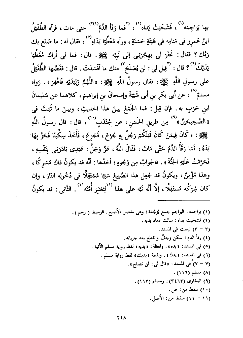 بِهَا بِرَاجِمَهُ، فَشَخَبَتْ يَدَاهُ، فَمَا رَقَأَ الدَّمُ حَتَّى مَاتَ، فَرَآهُ الطُّفَيْلُ بْنُ عَمْرٍو فِي مَنَامِهِ فِي هَيْئَةٍ حَسَنَةٍ، وَرَآهُ مُغَطِّيًا يَدَيْهِ، فَقَالَ لَهُ: مَا صَنَعَ بِكَ رَبُّكَ؟ فَقَالَ: غَفَرَ لِي بِهِجْرَتِي إِلَى نَبِيِّهِ - صَلَّى اللَّهُ عَلَيْهِ وَسَلَّمَ -. قَالَ: فَمَا لِي أَرَاكَ مُغَطِّيًا يَدَيْكَ؟ قَالَ: قِيلَ لِي: لَنْ يُصْلَحَ مِنْكَ مَا أَفْسَدْتَ. قَالَ: فَقَصَّهَا الطُّفَيْلُ عَلَى رَسُولِ اللَّهِ - صَلَّى اللَّهُ عَلَيْهِ وَسَلَّمَ - فَقَالَ رَسُولُ اللَّهِ - صَلَّى اللَّهُ عَلَيْهِ وَسَلَّمَ -: " اللَّهُمَّ وَلِيَدَيْهِ فَاغْفِرْ» . رَوَاهُ مُسْلِمٌ عَنْ أَبِي بَكْرِ بْنِ أَبِي شَيْبَةَ وَإِسْحَاقَ بْنِ إِبْرَاهِيمَ كِلَاهُمَا عَنْ سُلَيْمَانَ بْنِ حَرْبٍ بِهِ. فَإِنْ قِيلَ: فَمَا الْجَمْعُ بَيْنَ هَذَا الْحَدِيثِ، وَبَيْنَ مَا ثَبَتَ فِي " الصَّحِيحَيْنِ " مِنْ طَرِيقِ الْحَسَنِ عَنْ جُنْدَبٍ قَالَ: قَالَ رَسُولُ اللَّهِ - صَلَّى اللَّهُ عَلَيْهِ وَسَلَّمَ -: «كَانَ فِيمَنْ كَانَ قَبْلَكُمْ رَجُلٌ بِهِ جُرْحٌ، فَجَزِعَ، فَأَخَذَ سِكِّينًا فَحَزَّ بِهَا يَدَهُ، فَمَا رَقَأَ الدَّمُ حَتَّى مَاتَ، فَقَالَ اللَّهُ عَزَّ وَجَلَّ: عَبْدِي بَادَرَنِي بِنَفْسِهِ، فَحَرَّمْتُ عَلَيْهِ الْجَنَّةَ ".» فَالْجَوَابُ مِنْ وُجُوهٍ ; أَحَدُهَا: أَنَّهُ قَدْ يَكُونُ ذَاكَ مُشْرِكًا، وَهَذَا مُؤْمِنٌ، وَيَكُونُ قَدْ جُعِلَ هَذَا الصَّنِيعُ سَبَبًا مُسْتَقِلًّا فِي دُخُولِهِ النَّارَ، وَإِنْ كَانَ شِرْكُهُ مُسْتَقِلًّا، إِلَّا أَنَّهُ نَبَّهَ عَلَى هَذَا لِتَعْتَبِرَ أُمَّتُهُ. الثَّانِي: قَدْ يَكُونُ